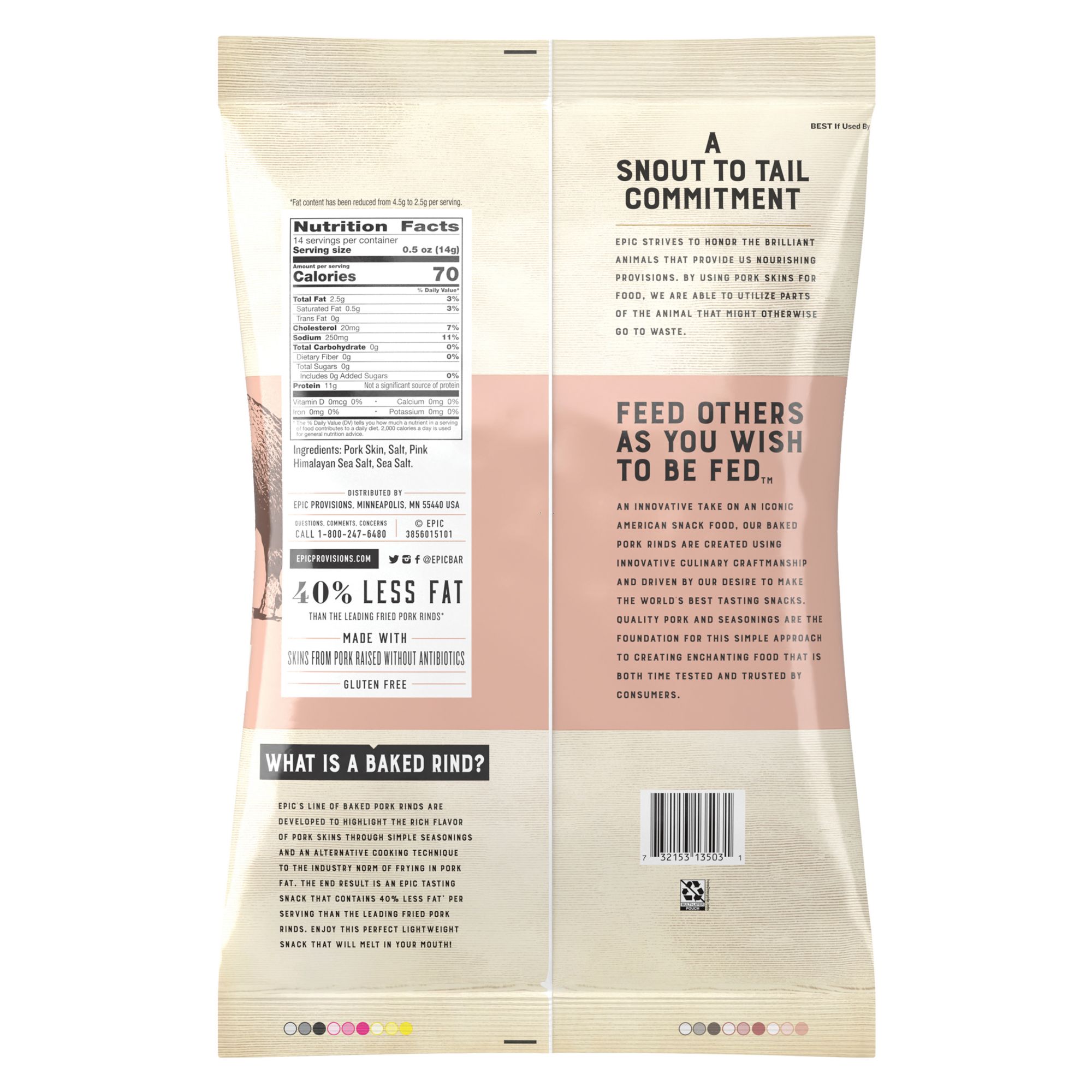 A modern take on a classic American snack, Epic Provisions Pork Rinds are made from a blend of antibiotic-free, non-GMO, organic, and pastured pork complemented with both pink Himalayan salt and sea salt. They’re gluten-free, Paleo-friendly, and filled with an abundance of protein. Allowing more whole animal utilization, pork skins are an extension of Epic’s Whole Animal Project, a "snout-to-tail" commitment to honor each animal sourced. What is a rind? A rind is a fried pork skin taken from either the belly or back of a hog. This skin is softer in texture and has more subcutaneous fat when compared to the shoulder. Additionally, pork rinds have very little meat cooked into the product. The end result is the perfect lightweight snack that melts in your mouth.