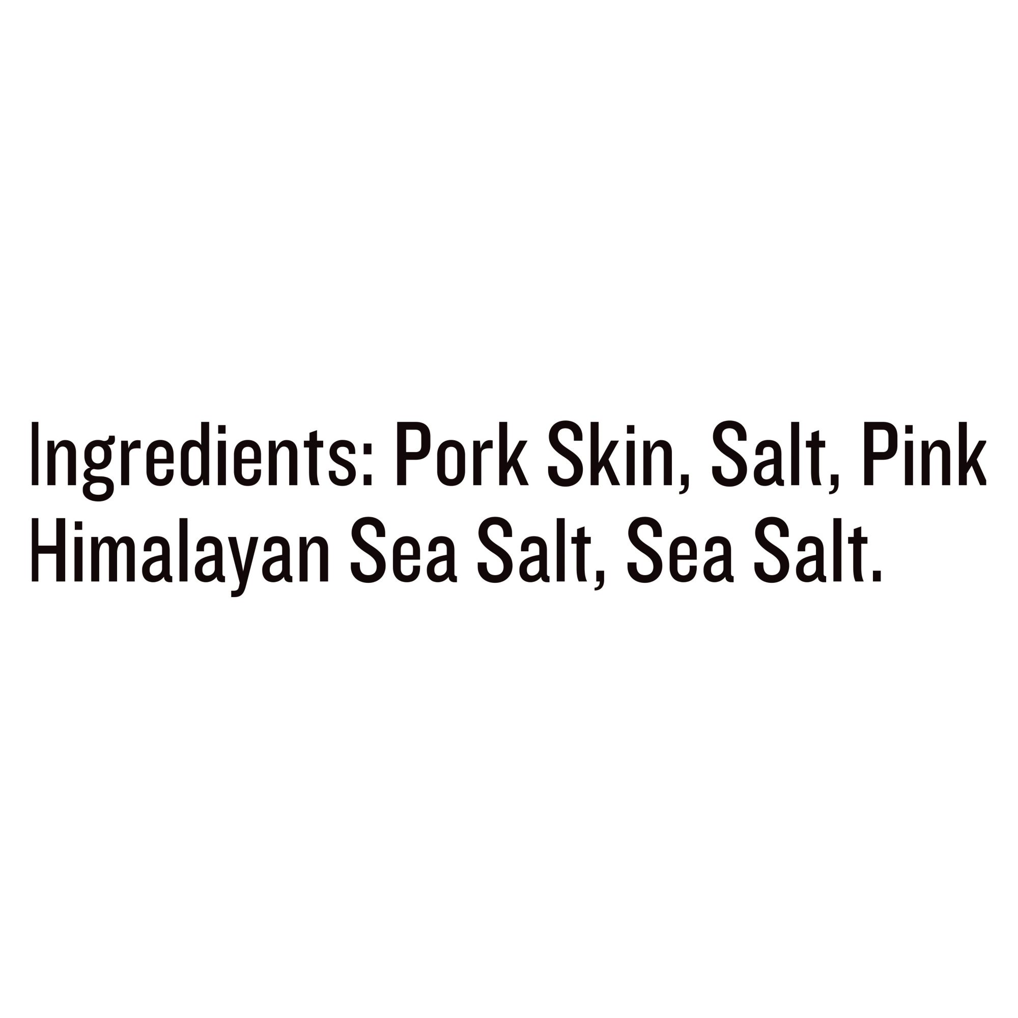 Ingredients: Pork Skin, Salt, Pink Himalayan Sea Salt, Sea Salt.