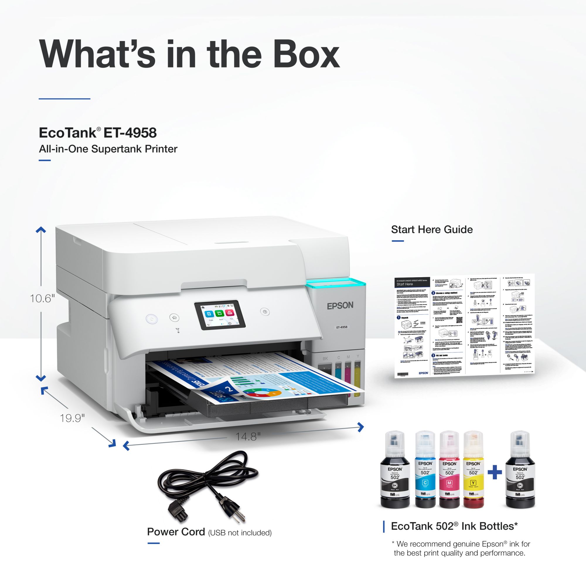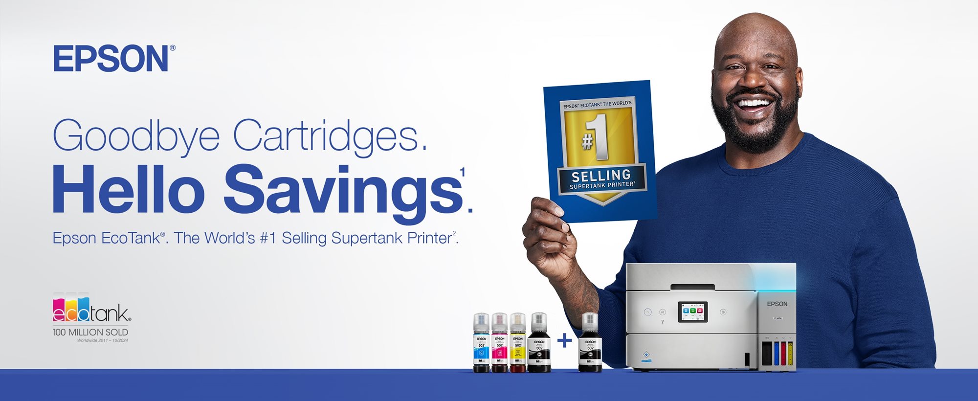 1 Actual savings of money, waste, and hassle will vary. Cost of printing (printer + ink) comparison based on included ink bottles vs. included and replacement ink cartridges over 3 years using average monthly print volumes. For more information, see epson.com/savingsinfo | 2 Based on internal cumulative sales data 2010 – 2024. | 3 Versus the ET-4850. | 4 Based on average monthly document print volumes of about 150 pages. | 5 Requires Epson Smart Panel app download. Data usage fees may apply. | 6 Most features require an Internet connection to the printer, as well as an Internet- and/or email-enabled device. For a list of Epson Connect enabled printers and compatible devices and apps, visit epson.com/connect | 7 Worldwide 2011 – 10/2024. | 8 Actual savings and costs will vary considerably based on print tasks, print volumes and usage conditions. Savings and cost per ISO page are based on the cost of replacement ink bottles and the cost of enough standard cartridges to achieve the total page yields of the bottles using the MSRP (USD) and yields for Epson standard-capacity ink cartridges for similarly featured Epson consumer inkjet printers as of March 2025. | 9 12 months of standard limited warranty or 100,000 plain paper sheets (whichever happens first). For an additional 12-month extended service plan (total of 24 months or 100,000 plain paper sheets, whichever happens first), register your product and use Epson genuine ink bottles. See Limited Warranty for details. | 10 Part of the ink from the included bottles is used for initial setup; yields are lower than those of replacement ink bottles. Replacement and included ink bottle yields based on the ISO/IEC 24712 pattern with Epson’s methodology. Actual ink yields will vary considerably for reasons including images printed, print settings, temperature and humidity. Yields may be lower when printing infrequently or predominantly with one ink color. All ink colors are used for printing and printer maintenance, and all colors must be available for printing. For more information, visit epson.com/inkinfo | 11 Individual cartridges estimate based on print yields of a replacement set of black and color ink bottles as compared to Epson standard-capacity ink cartridges for similarly featured printers as of March 2025. | 12 Based on product and replacement ink bottle sales in North America 2015 – June 2021.Details