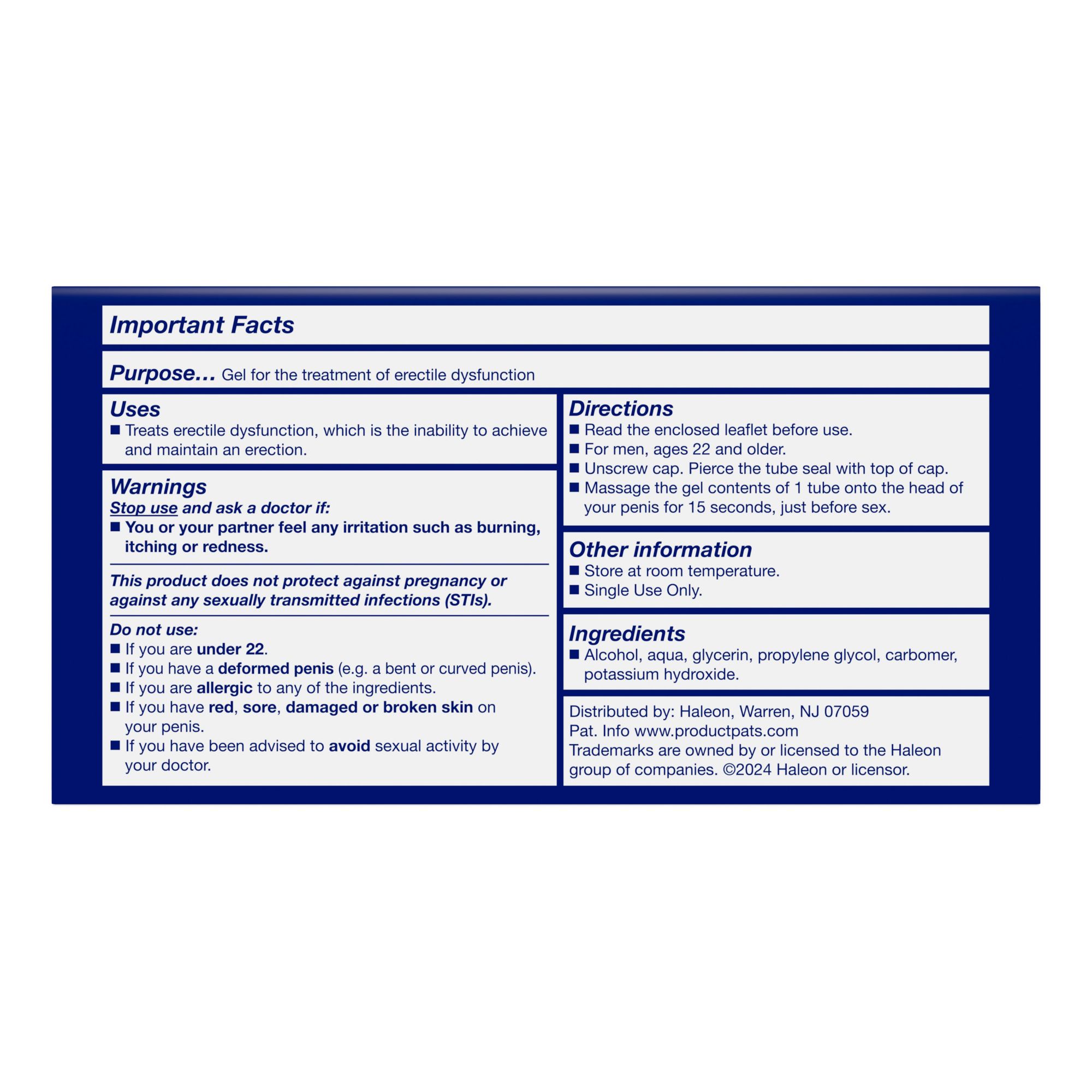 Instructions For Use: Read the enclosed leaflet before use. For men, ages 22 and older. Unscrew cap. Pierce the tube seal with top of cap. Massage the gel contents of 1 tube onto the head of your penis for 15 seconds, just before sex.