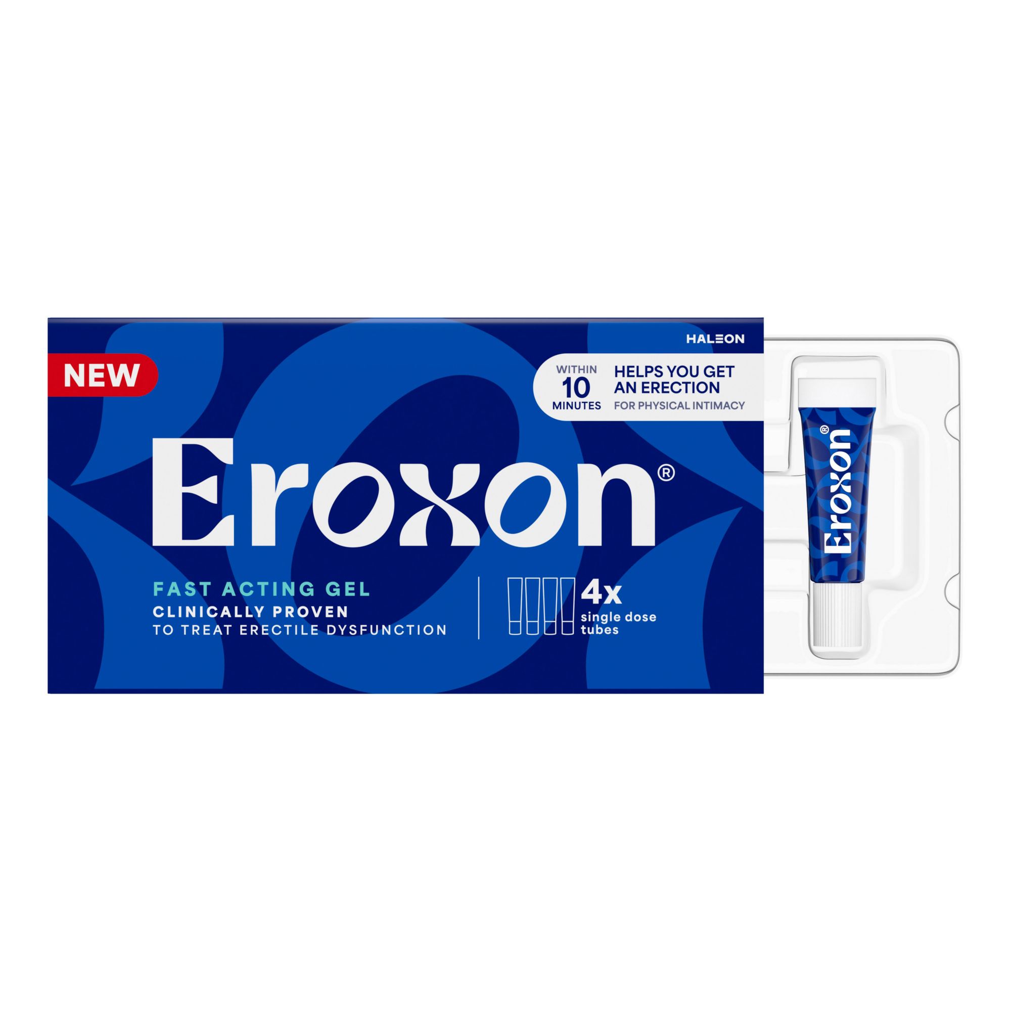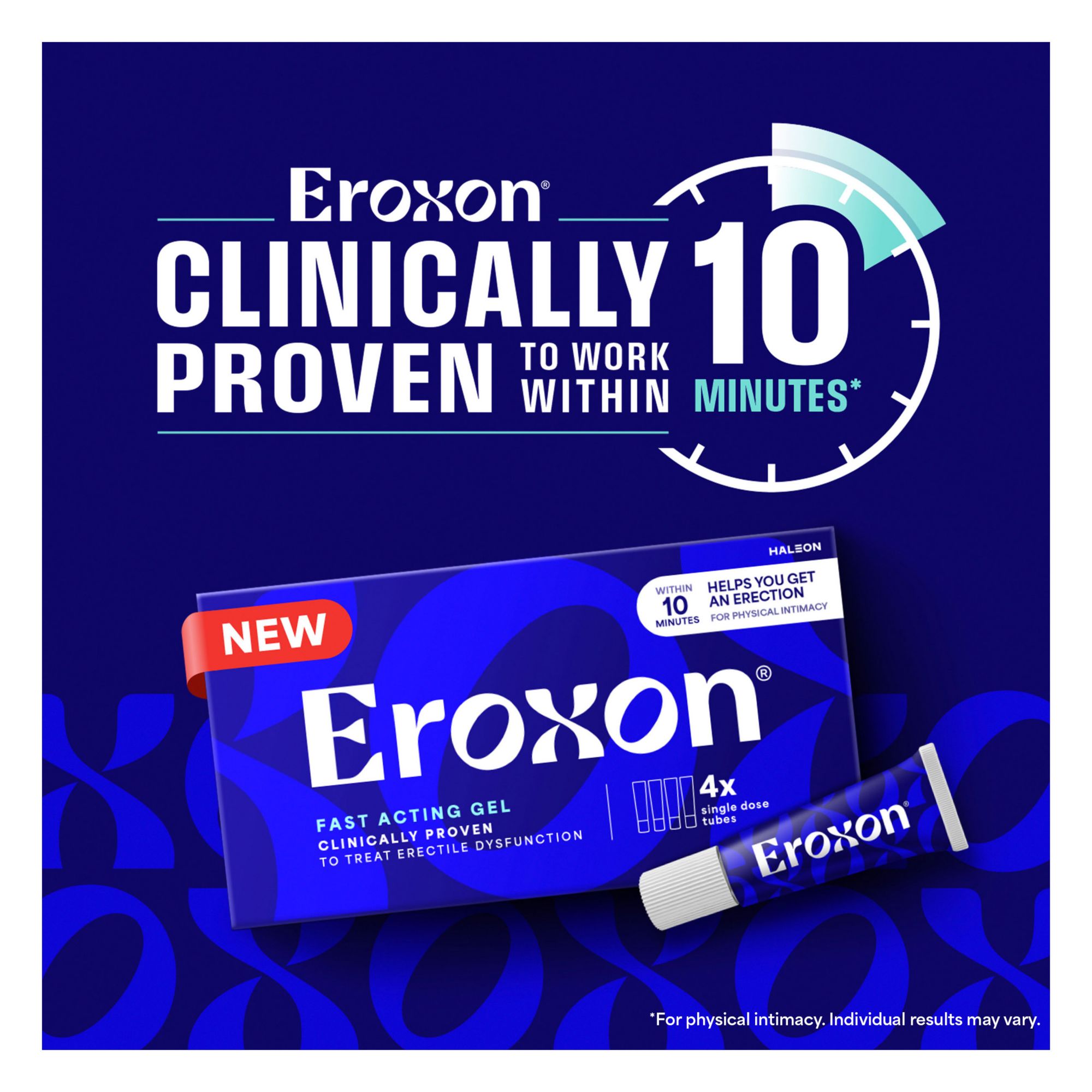 Introducing Eroxon - the first and only FDA-cleared ED treatment available without prescription, clinically proven to work within 10 minutes*. Eroxon fast acting gel offers men and their partners clinically proven results with over-the-counter convenience. Gently massage the gel from a single use tube directly onto the head of the penis for 15 seconds. For best results, use Eroxon when sexually stimulated and with a partner as part of foreplay. Eroxon may take a few attempts to achieve the desired effect. Each package contains four single-use tubes to help men kickstart those intimate experiences.