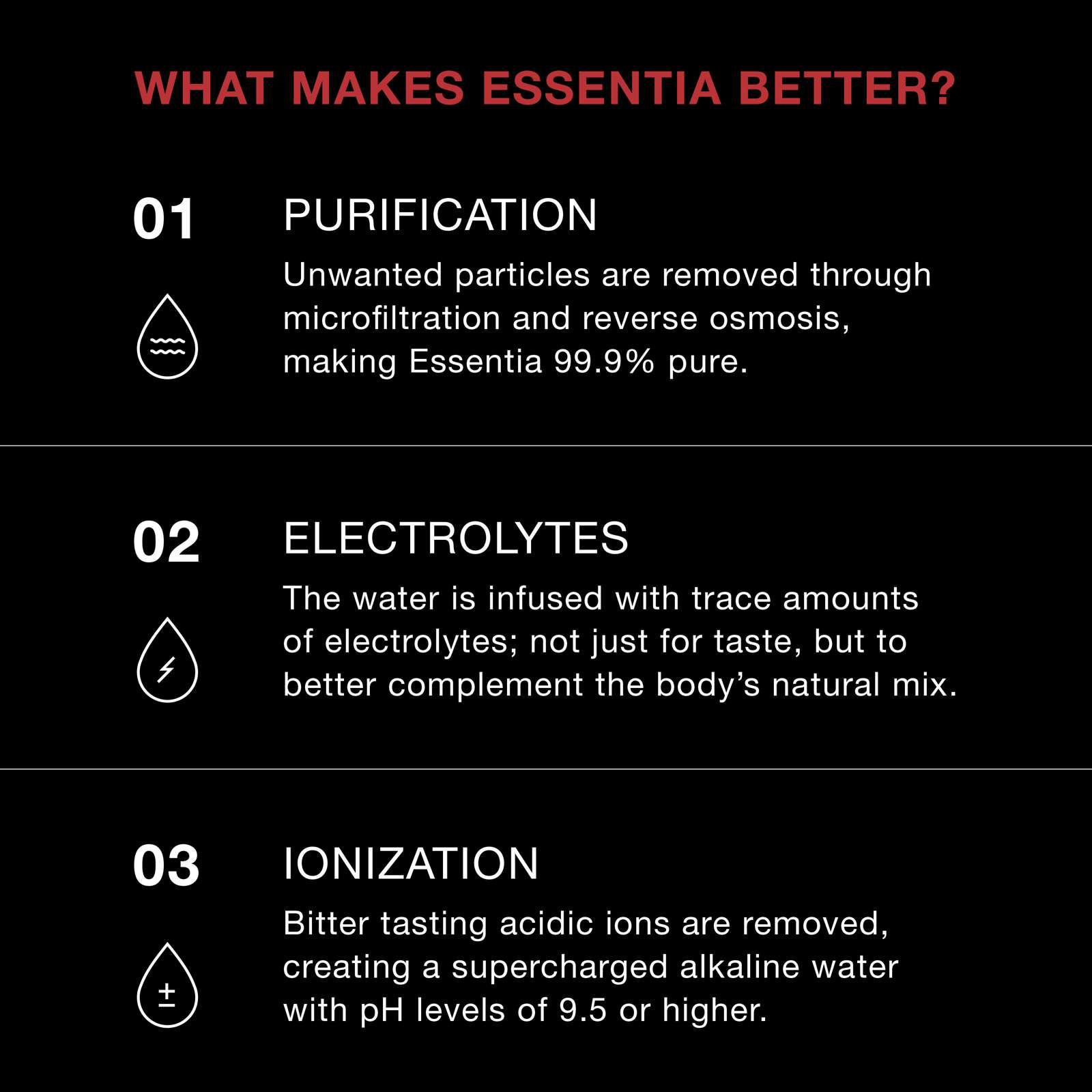 Rehydrate faster by drinking Essentia 50.7 Oz. Ionized Alkaline Water. Thanks to a unique ionization process, the water is rid of any bitter-tasting acidic ions, leaving behind a clean, smooth taste with a pH of 9.5. The premium water is packaged in BPA-free bottles for peace of mind.