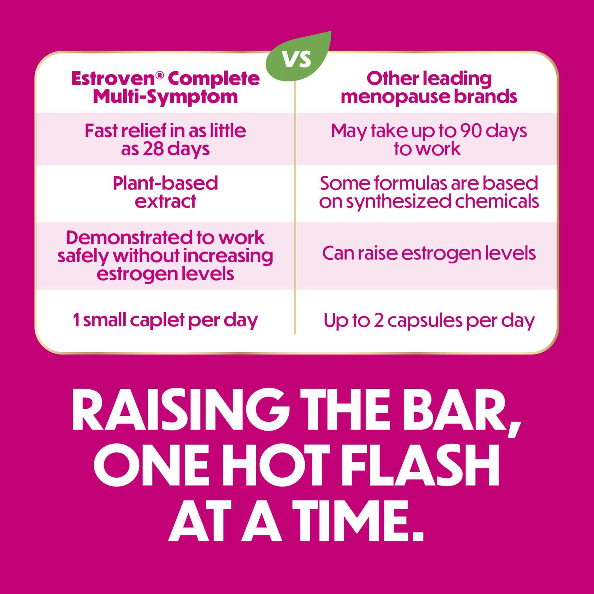 Estroven Complete Multi-Symptom Menopause Relief is safe and effective relief for all stages of menopause. Contains clinically proven, plant based rhapontic rhubarb root extract, which has been trusted by physicians for over 20 years to relieve menopause symptoms*. Up to a 90% Reduction in Hot Flashes and Night Sweats*▲.