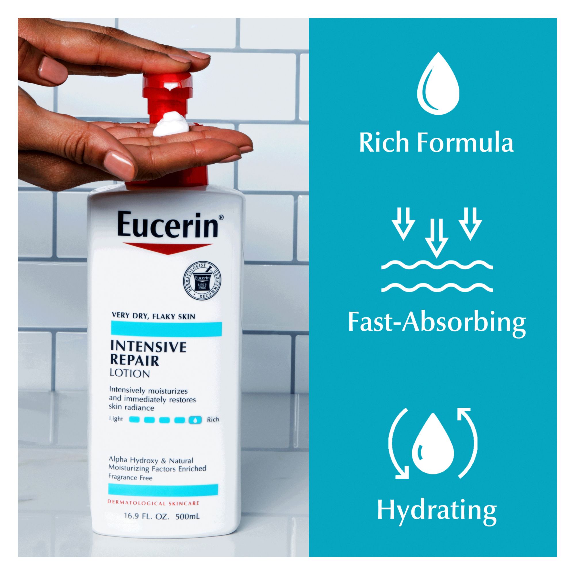 Eucerin Intensive Repair fragrance free body lotion for dry skin is enriched with Alpha Hydroxy and Natural Moisturizing Factors