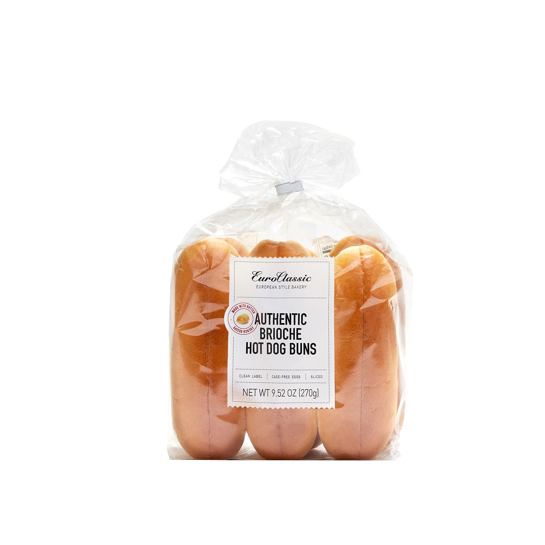 Enjoy these unique soft brioche Hot Dog buns, conveniently pre-sliced to become your perfect for hot dogs, sausages, or salads! These buns are great for hot dogs, sausages, salads or gourmet sandwiches. This package contains 6 buns. The buns are made with no artificial flavors or preservatives, made with butter and cage-free eggs.