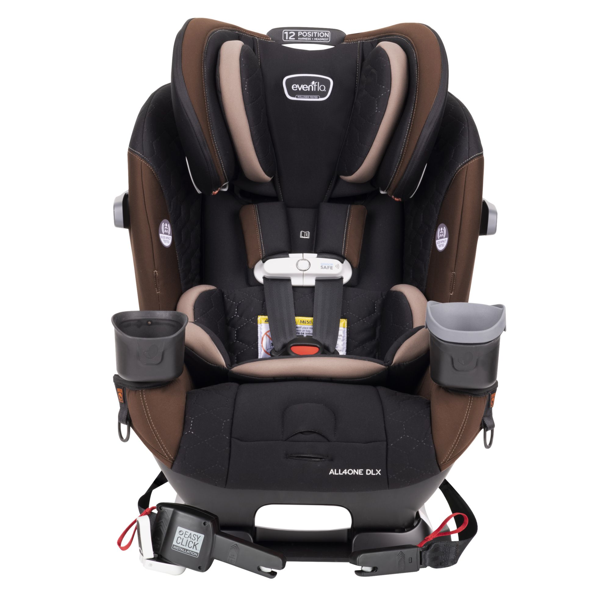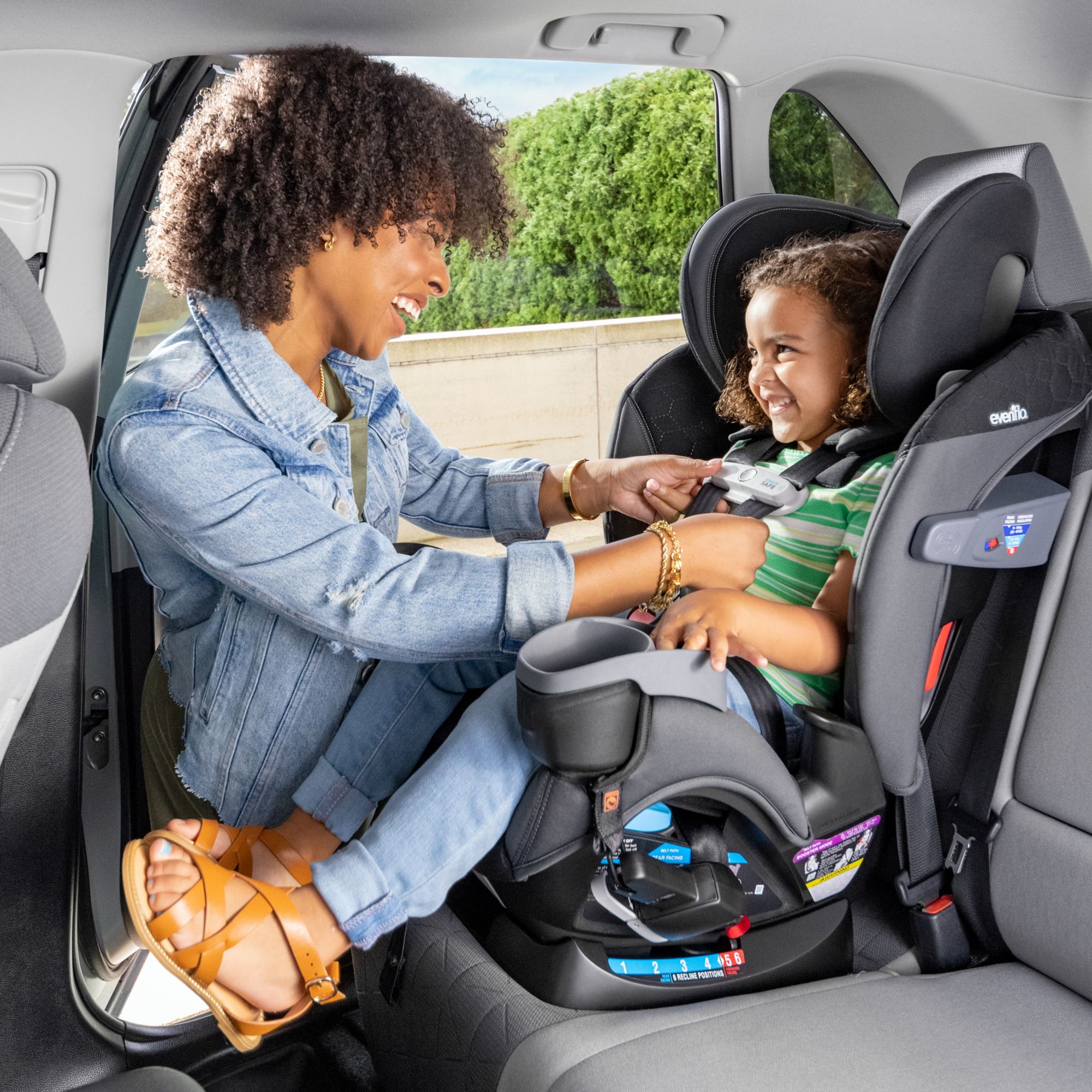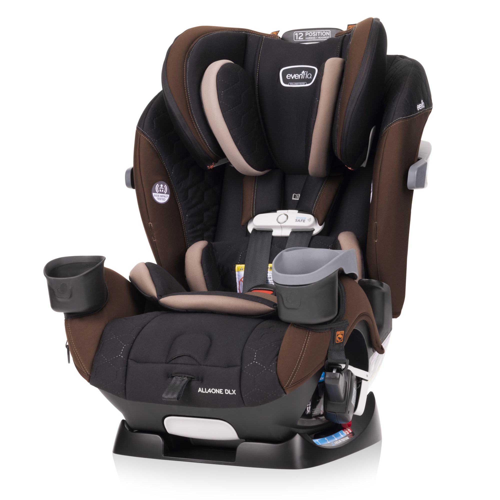 Take a closer look at the car seat designed for your digitally connected life: the Evenflo All4One DLX 4-in-1 Car Seat with SensorSafe. While your eyes are focused on the road, integrated SensorSafe technology instantly alerts you to four potentially unsafe conditions from your child’s car seat via your phone: unexpected chest clip unbuckling, unsafe temperature, child unattended in the car, and child seated too long. With SensorSafe to keep you connected to your child from the back seat, the All4One DLX is clearly the savvy choice. It’s also a versatile choice because you can invest once in a car seat that will grow with your child for 10 years! During that 10 years of use, this car seat will adapt to every stage of development from infancy to big kid as your child grows from 4 to 120 lbs. Over the years, four modes allow you to adjust as appropriate from the rear-facing harness to the forward-facing harness and from the high-back booster to the no-back booster. Count on our EasyClick LATCH system to provide security with confidence. EasyClick ratchets to achieve a rock-solid installation that’s 3x* tighter than the competition. More to feel good about: The All4One DLX is the only 4-in-1 car seat that’s GREENGUARD Gold Certified for low chemical emissions to create a healthier environment for your child. Because life is messy, it also includes a convenient Quick Clean Cover that’s easy to remove and easy to wash. For added protection, the All4One DLX features side-impact technology which helps absorb energy in the event of a collision. And the perks don’t end there! The headrest offers 12 positions, the handy no-rethread harness adjusts with just one hand without having to uninstall the car seat, shoulder belt guides properly position the vehicle belt over your child’s shoulder to ensure an accurate fit in booster mode, and head and body pillows are removable for easy cleaning. On top of that, dual-integrated cup holders keep drinks within your child’s reach and the removable snack tray is dishwasher-safe. Connect with everything you need in a car seat for 10 years. The All4One DLX.