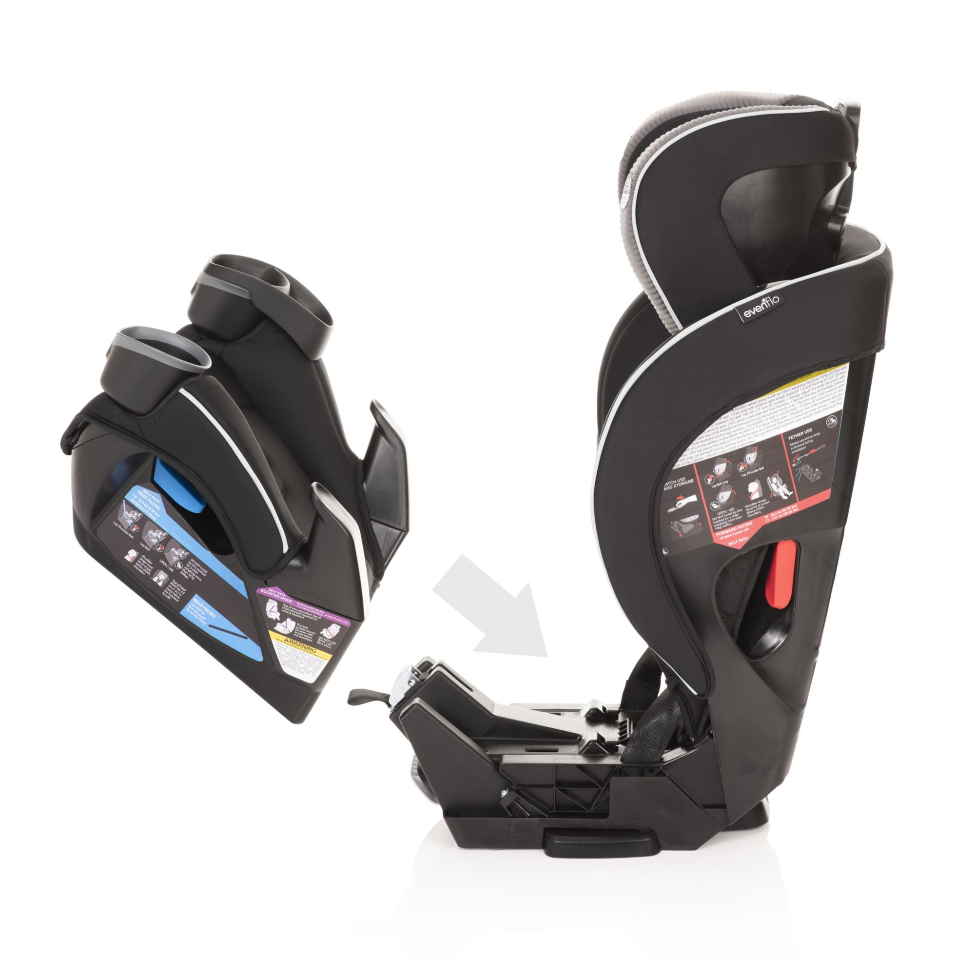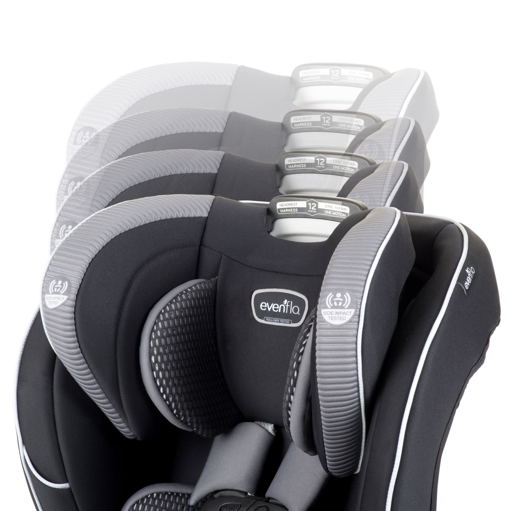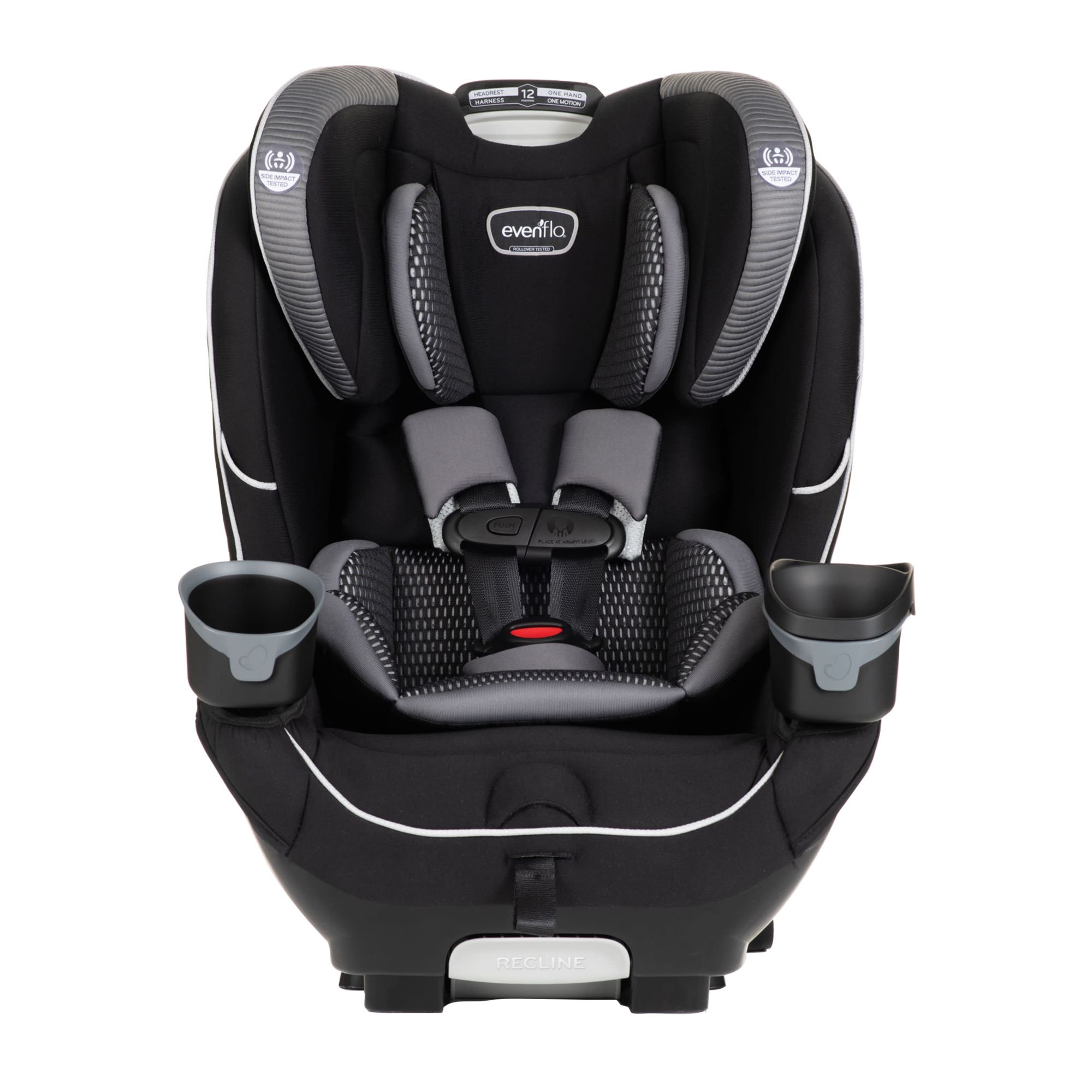 The EveryFit meets or exceeds all applicable federal safety standards and Evenflo’s side impact standard, with advanced side impact protection that reduces crash forces up to 30%. It is designed and tested for structural integrity at energy levels approximately 2x the federal crash test standard. Evenflo works with parents to develop child-safety products that are designed for how they are used. We’ve developed this 4-in-1 car seat with comfort, safety, and ease of use in mind. The one-hand, 12-position headrest, and no-rethread harness enable a proper fit during each ride and as a child grows – without uninstalling the car seat. For additional convenience, this all-in-one car seat is designed with removable cushions, machine-washable fabrics, and two integrated cup holders with a removable snack tray.