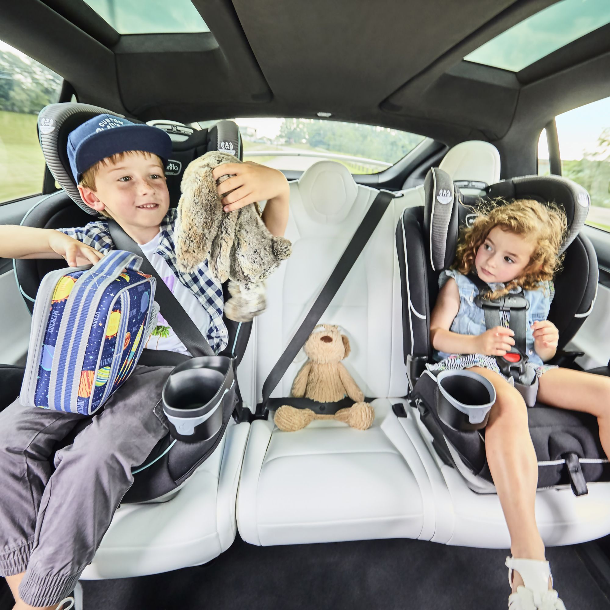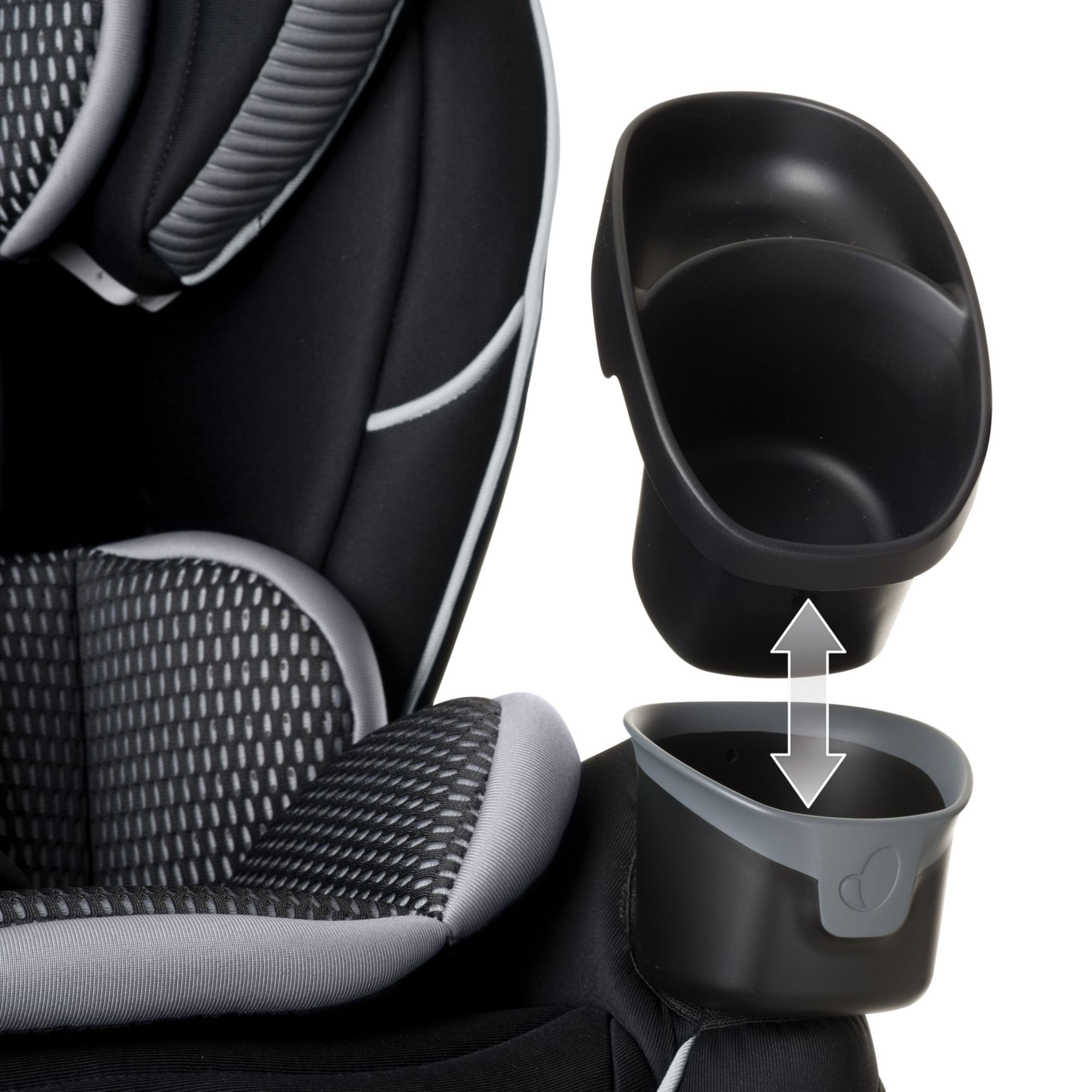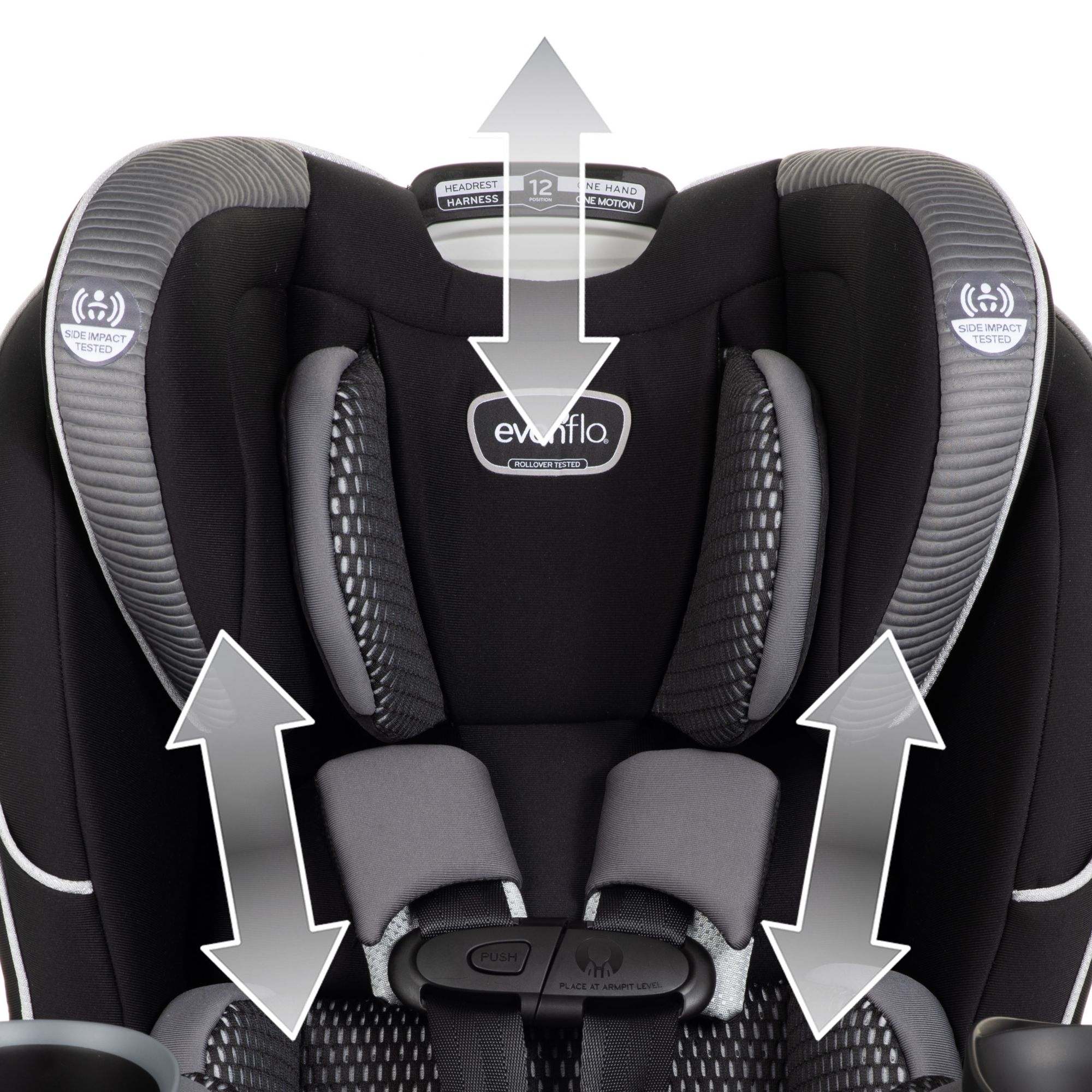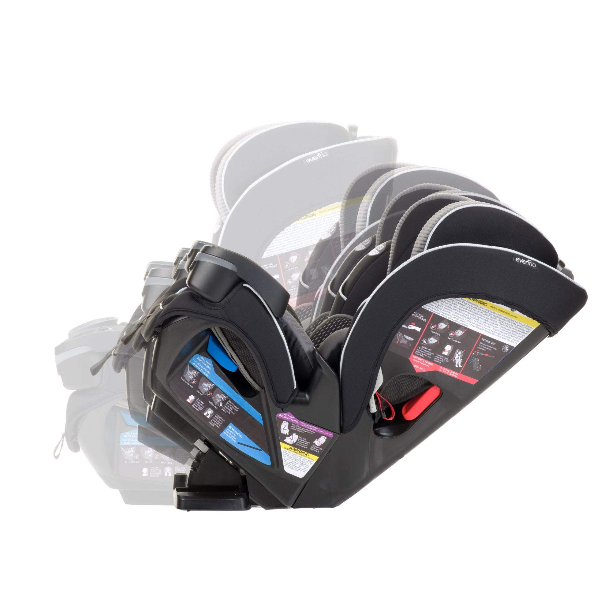 The EveryFit meets or exceeds all applicable federal safety standards and Evenflo’s side impact standard, with advanced side impact protection that reduces crash forces up to 30%. It is designed and tested for structural integrity at energy levels approximately 2x the federal crash test standard. Evenflo works with parents to develop child-safety products that are designed for how they are used. We’ve developed this 4-in-1 car seat with comfort, safety, and ease of use in mind. The one-hand, 12-position headrest, and no-rethread harness enable a proper fit during each ride and as a child grows – without uninstalling the car seat. For additional convenience, this all-in-one car seat is designed with removable cushions, machine-washable fabrics, and two integrated cup holders with a removable snack tray.