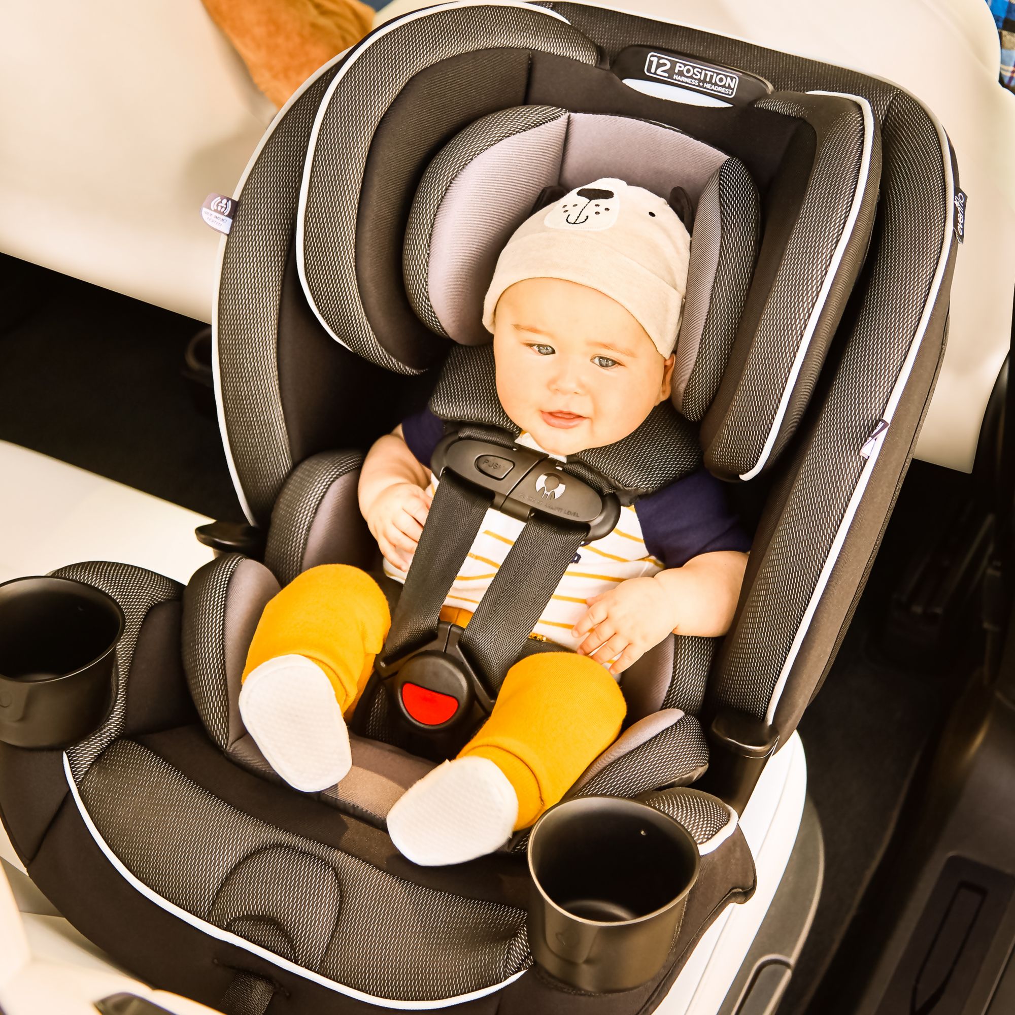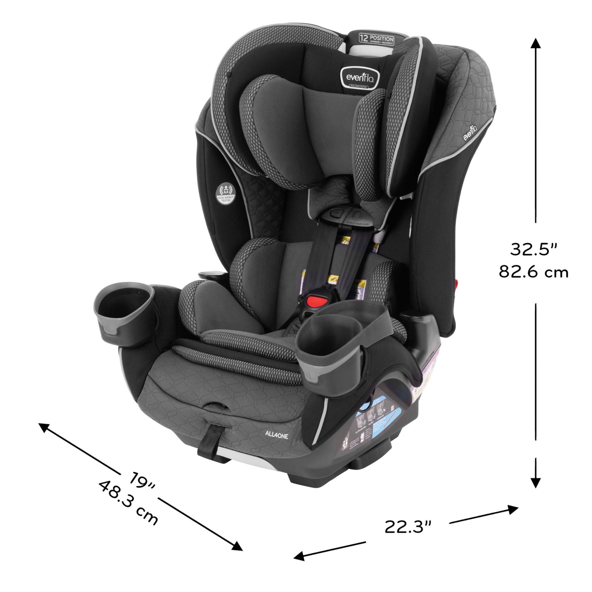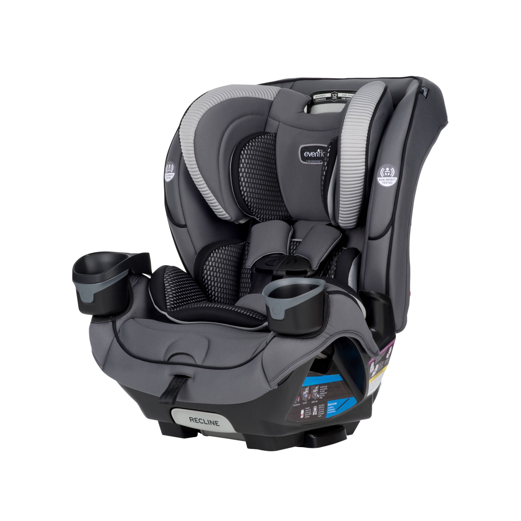 The EveryFit/All4One 3-in-1 meets or exceeds all applicable federal safety standards and Evenflo’s side impact standard. It is designed and tested for structural integrity at energy levels approximately 2X the federal frontal crash test standard.