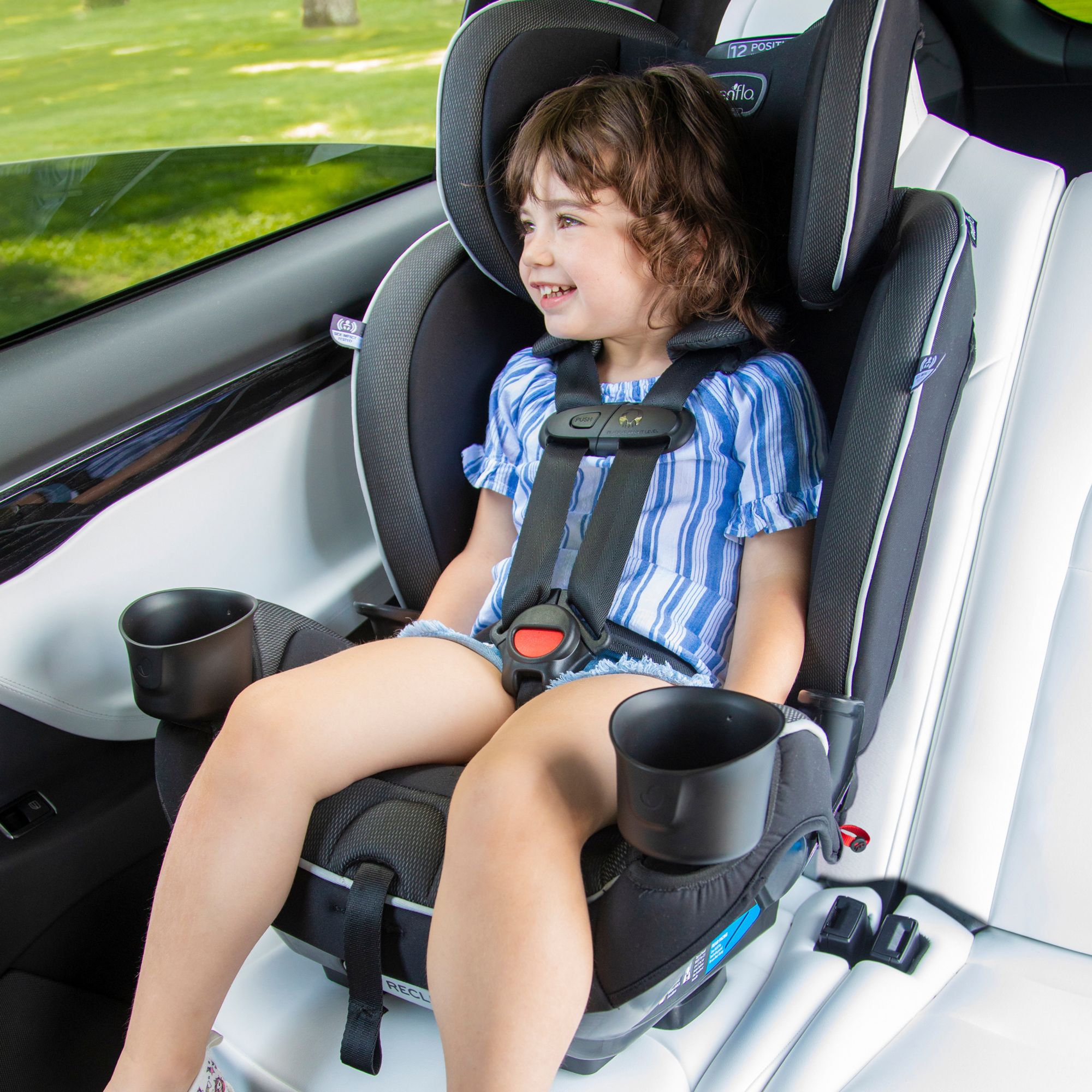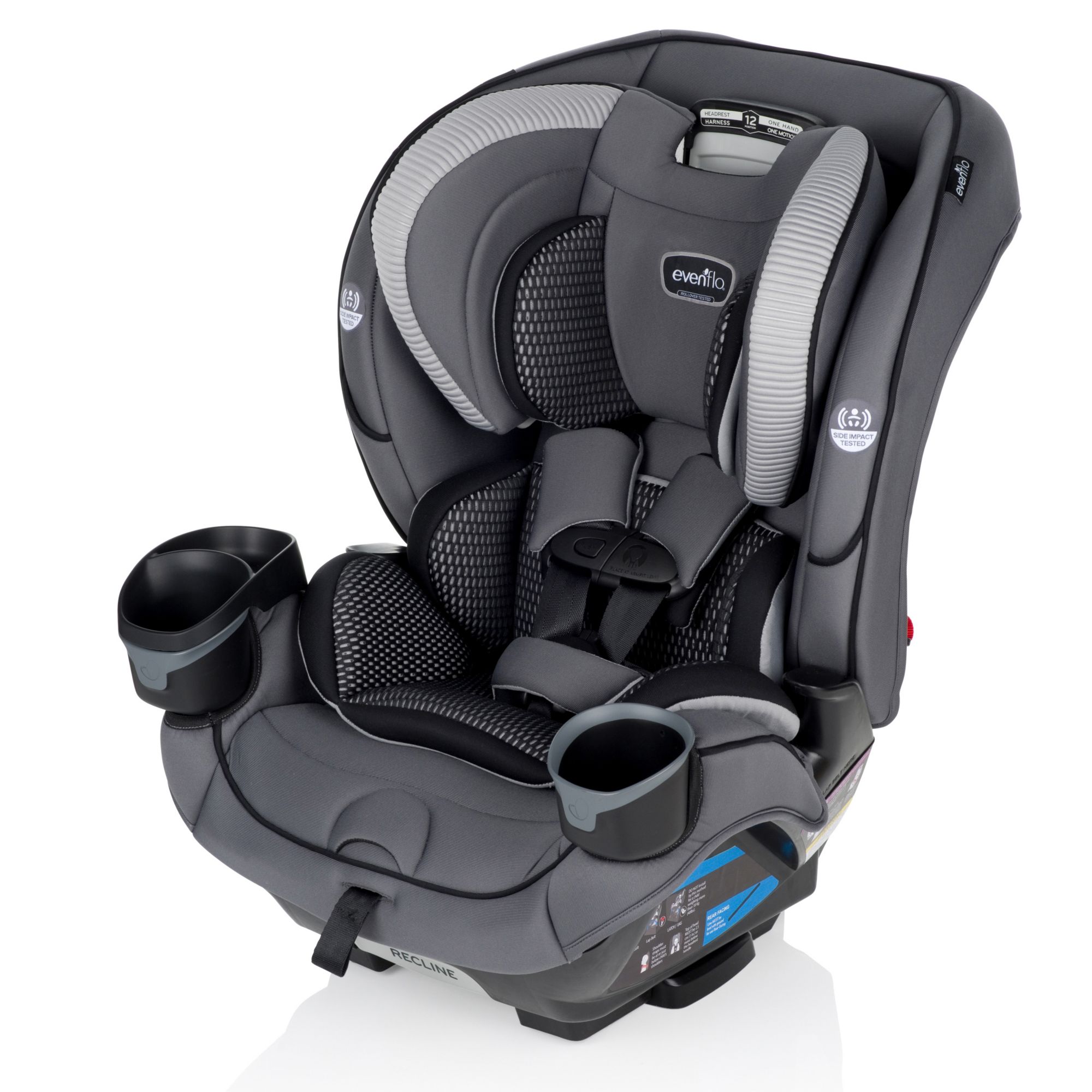 Evenflo works with parents to develop child-restraint products that are designed for how they are actually used. This car seat has been developed with comfort, safety and ease-of-use in mind. The one-hand, 12-position headrest and no-rethread harness enable a proper fit during each ride and as child grows – without uninstalling the car seat. For additional convenience, this all-in-one car seat is designed with removable cushions, machine-washable fabrics, two integrated cup holders and removable snack tray.