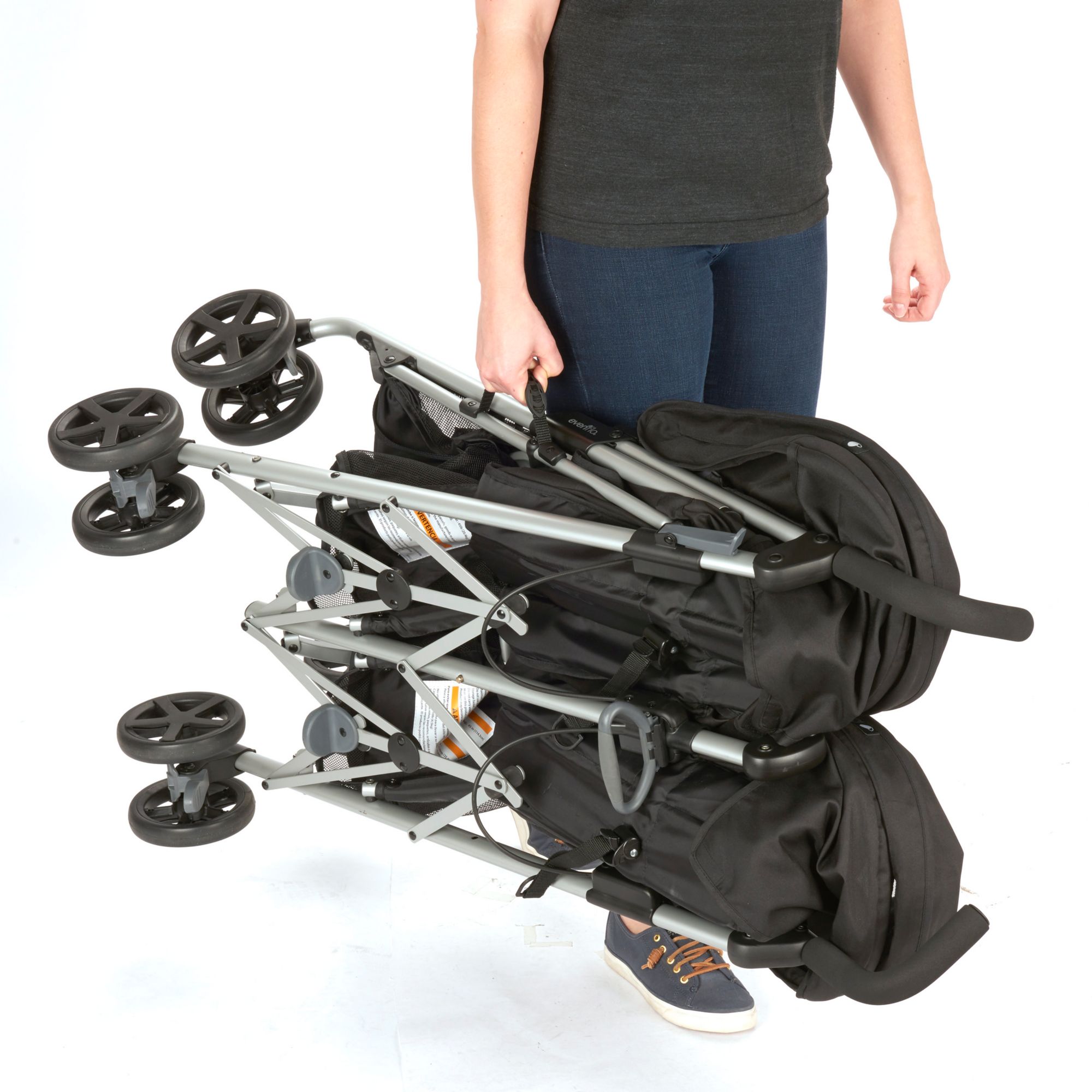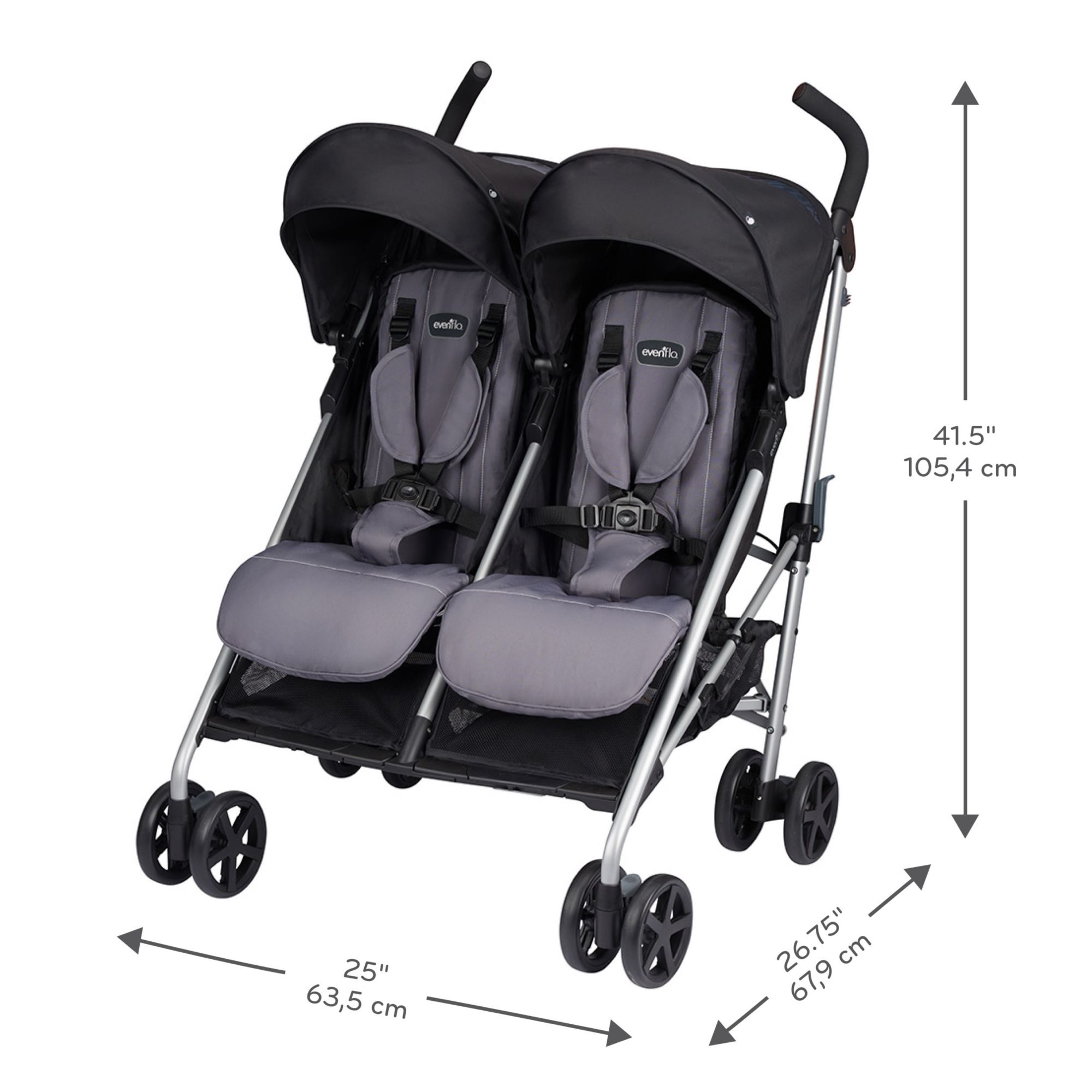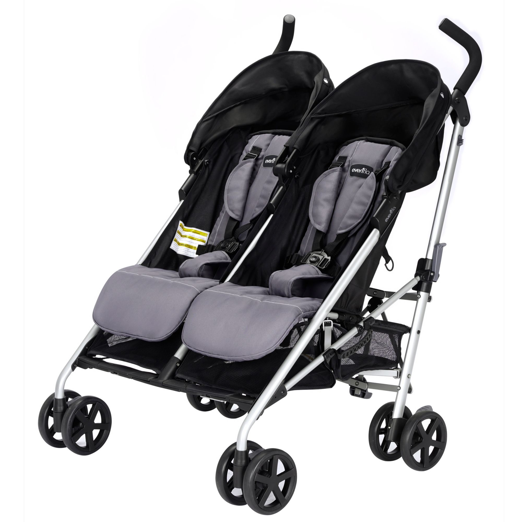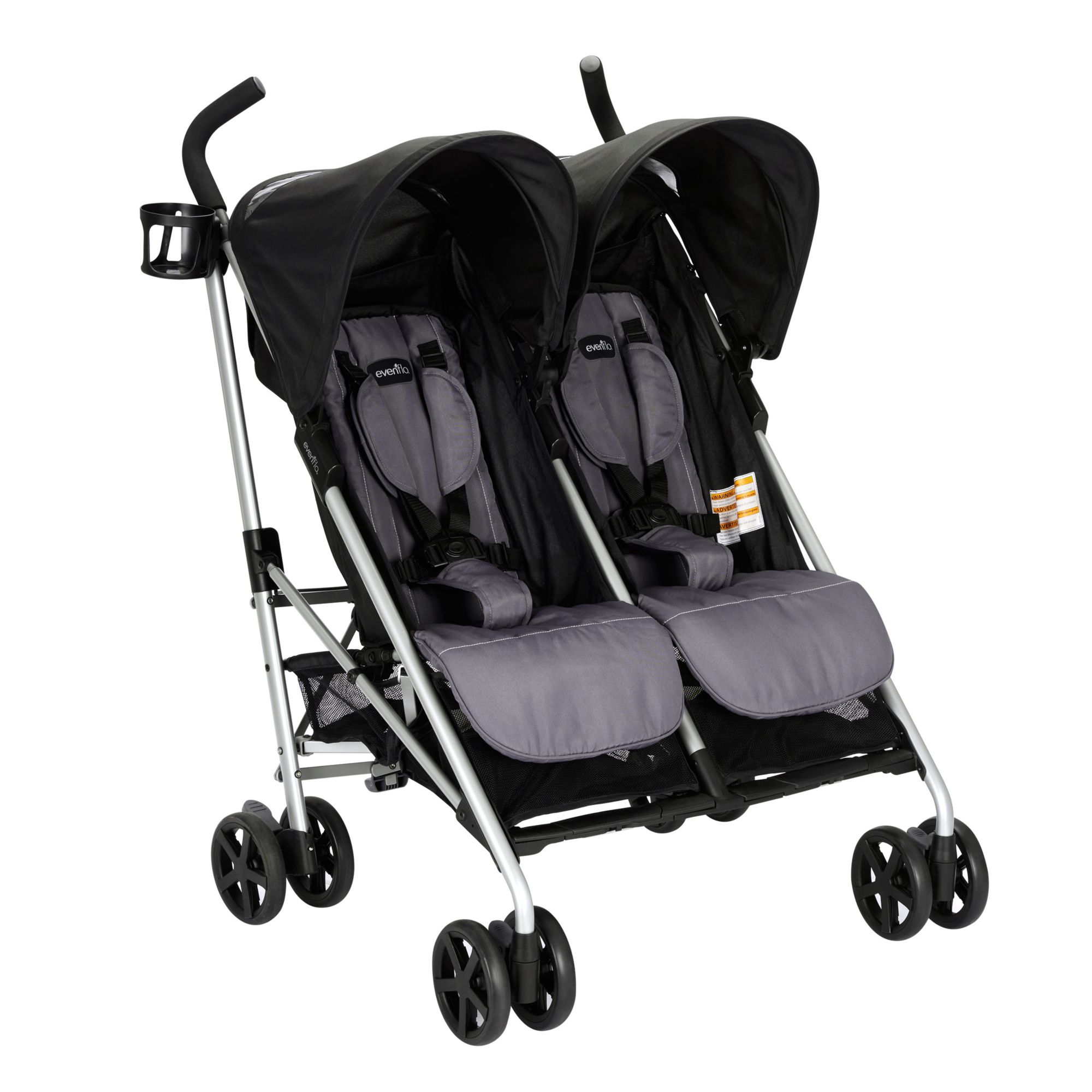 Compact Fold: Release foot pedal, grab handle and pull up to close with one hand - self-standing so no need for parent to bend over Smooth Ride: Front wheel suspension for easy maneuverability Protection: Oversized canopy with extended visor provides protection from the elements Parent Cup Holder: Removable for easy cleaning Generous Storage Basket: Provides ample storage on-the-go with rear access Comfort: Cushioned, multi-position reclining stroller seat provides a comfortable ride for your little one Front Swivel Wheel: Lockable to achieve superior maneuverability Adjustable Footrest: 2-positions for optimal comfort Comfort and Convenience: Angled handle bars allow a just-right grip and convenient carry handle makes transporting the Minno a breeze Includes The Evenflo Minno Twin double stroller inspires you to take both of your babies on adventures, whether you’re running errands or going for a stroll in the park. Its compact fold and narrow design make it convenient to bring everywhere and at only 27” wide, it fits through most doorways with ease