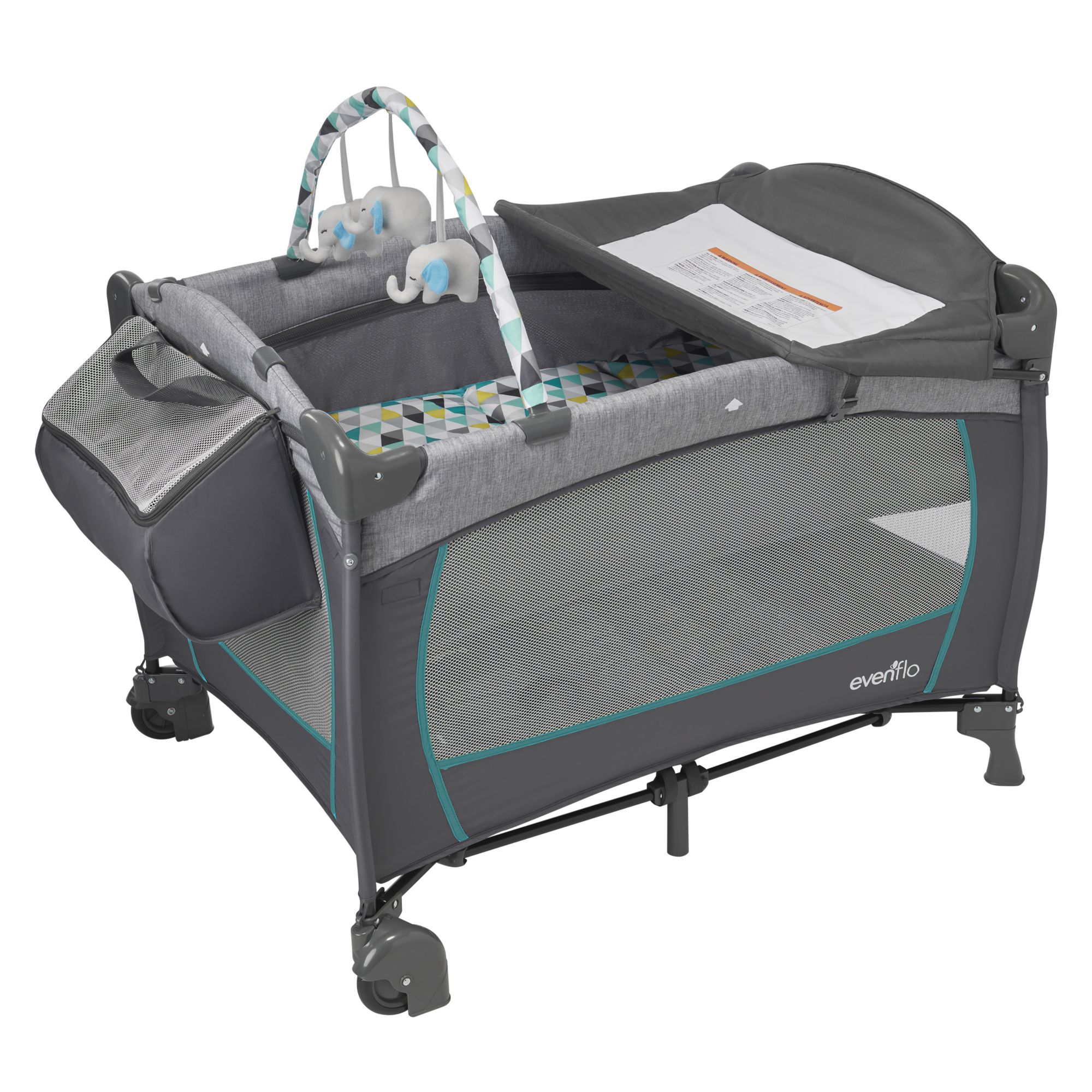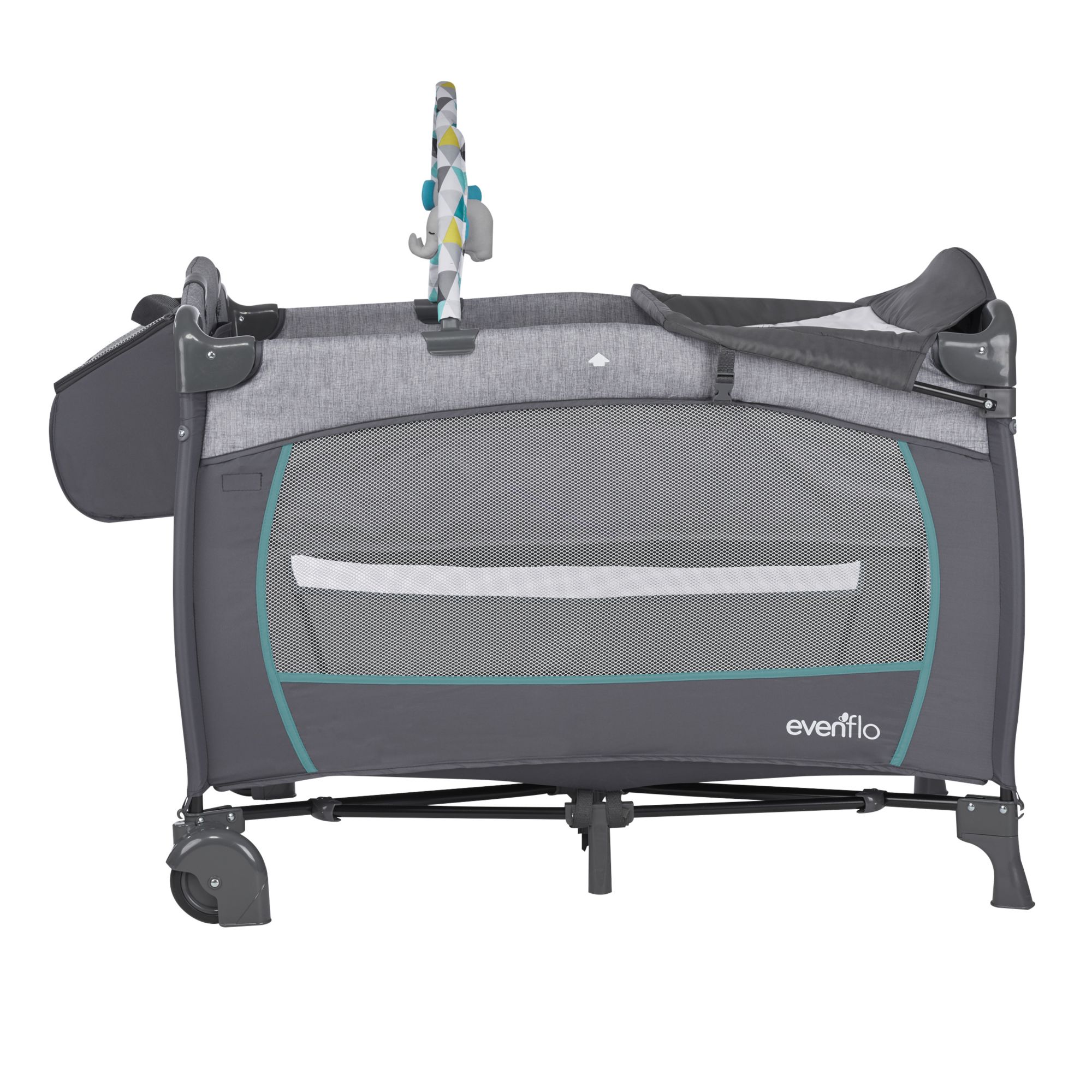 Baby will be living the suite life with the Evenflo Portable BabySuite DLX Playard. This playard is more than just that with multipurpose features like a flip-away diaper changer to maximize space when not in use. A full-size bassinet includes a toy bar with plush toys making it perfect for playtime or nap time. Place the bassinet mat on the floor and use with the toy bar to create a clean, safe tummy-time space. The removable storage organizer offers multiple options to store baby’s essentials, and attaches to the playard railing or to the carry bag when off to grandma’s house. Plus, it’s easy to setup and take down. Versatile and portable this playard has it all!