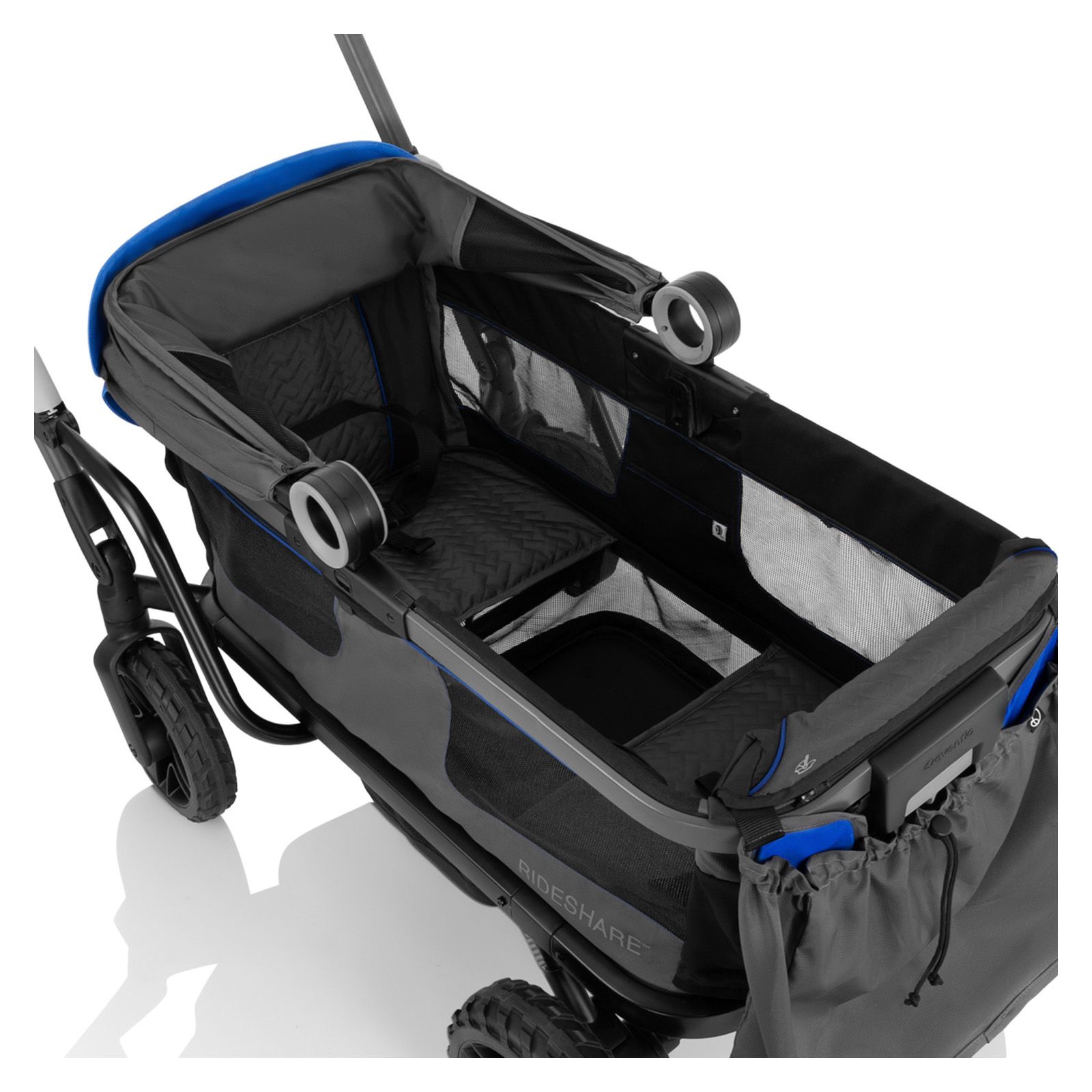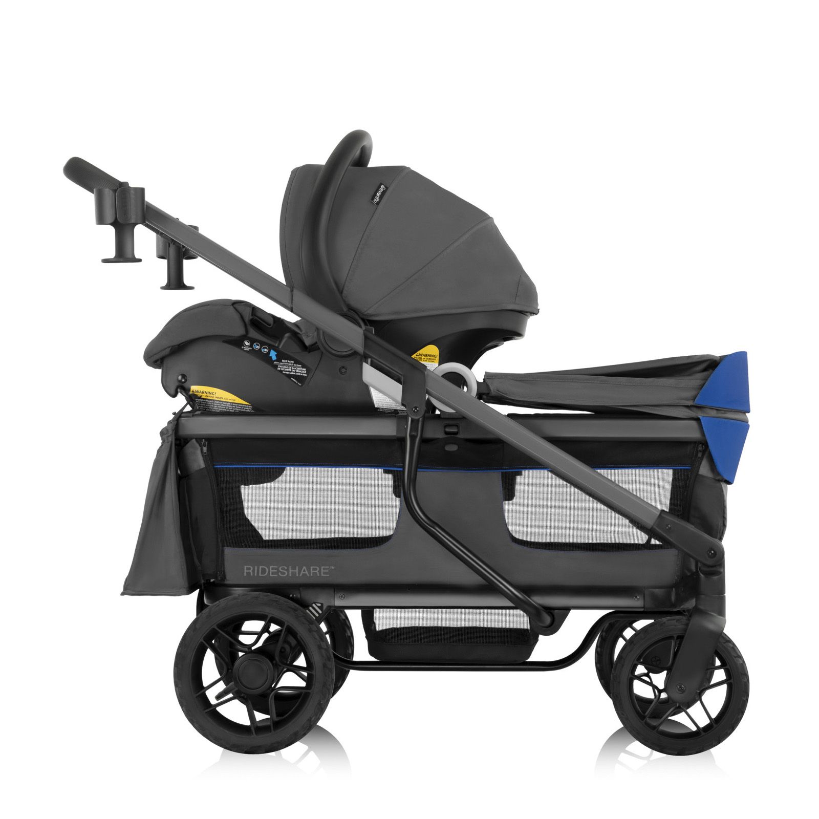 Range far from the everyday with the rugged-meets-refined Evenflo Shyft Rideshare All-Terrain Performance Stroller Wagon. Every detail has been engineered for performance, starting with the all-terrain, no-flat urethane wheels and rear suspension that allow you to master challenging terrain. Forge your own path with up to two children ages 6 months to 5 years — each seat accommodates a child up to 55 lbs. (110 lbs. total). Sides release and drop down with ease so kids can climb in independently or you can load up to 110 lbs. of gear*. Our unique cargo mode* will come in handy for hauling gear to the beach long after little adventurers have outgrown this ride. We added an innovative, built-in infant car seat attachment to accept your Evenflo LiteMax Infant Car Seat (sold separately) with no tools or adapters needed, because adventures are better when it’s this easy to bring your little one. For seated riders, the Rideshare includes an expandable UPF 50+ canopy to help protect against the sun’s harmful rays, with a visor that can flip up to accommodate a child up to 45 in. tall — all while providing full 360° views! Spacious seating and a large footwell offer plenty of room to grow. The 3-point harness adds security as you’re rolling. The 3-position telescoping handle lets you adapt to the landscape. Push your Rideshare as a stroller or pull your Rideshare as a wagon to make going uphill easier — whatever your quest calls for! When it’s time for a pause, the flip-flop friendly brake holds your stroller wagon in place. We made sure escaping the everyday comes with all the comforts. Rideshare offers 2 parent cup holders that face either in or out from the handle as your path calls for, a BPA-free child snack tray with 2 cup holders, plus a large storage basket to hold what you need for your trip. For convenient storage, Rideshare can fold flat and self-stand upright and out of the way. For an even more compact fold, the wheels are easily removed with the press of the release buttons. Complementing the performance details, premium fabrics and finishes ensure that you’ll adventure in style. Shyft Rideshare. Escape the everyday.