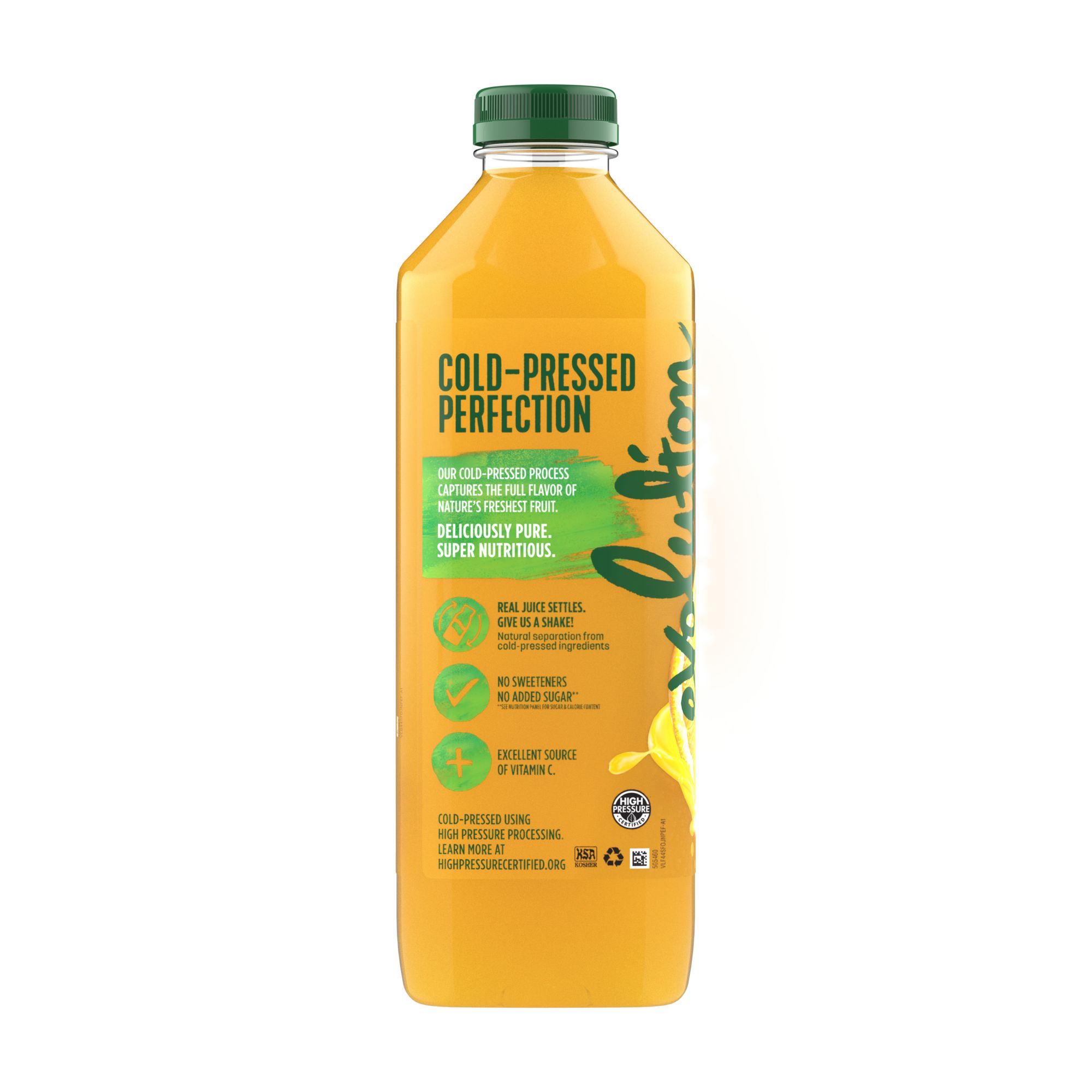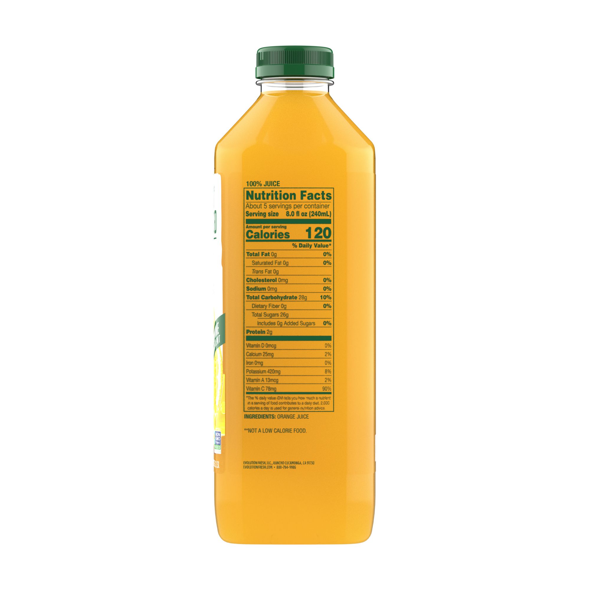 100% orange juice, not from concentrate, and cold-pressed using high-pressure processing (HPP) rather than traditional heat pasteurization. This product will provide an experience to taste the difference in premium orange juice that actually tastes like oranges, not traditional "OJ". Evolution Fresh Cold Pressed Orange Juice has a vibrant flavor and aroma.