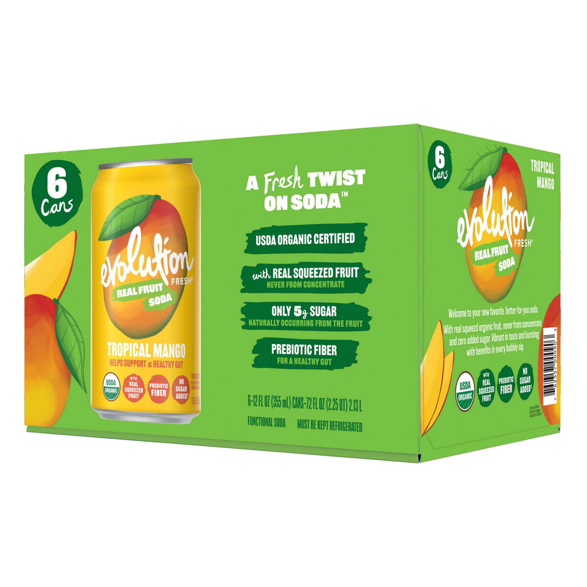 Includes organic tropical mango real fruit soda, 6 pk./12 oz.