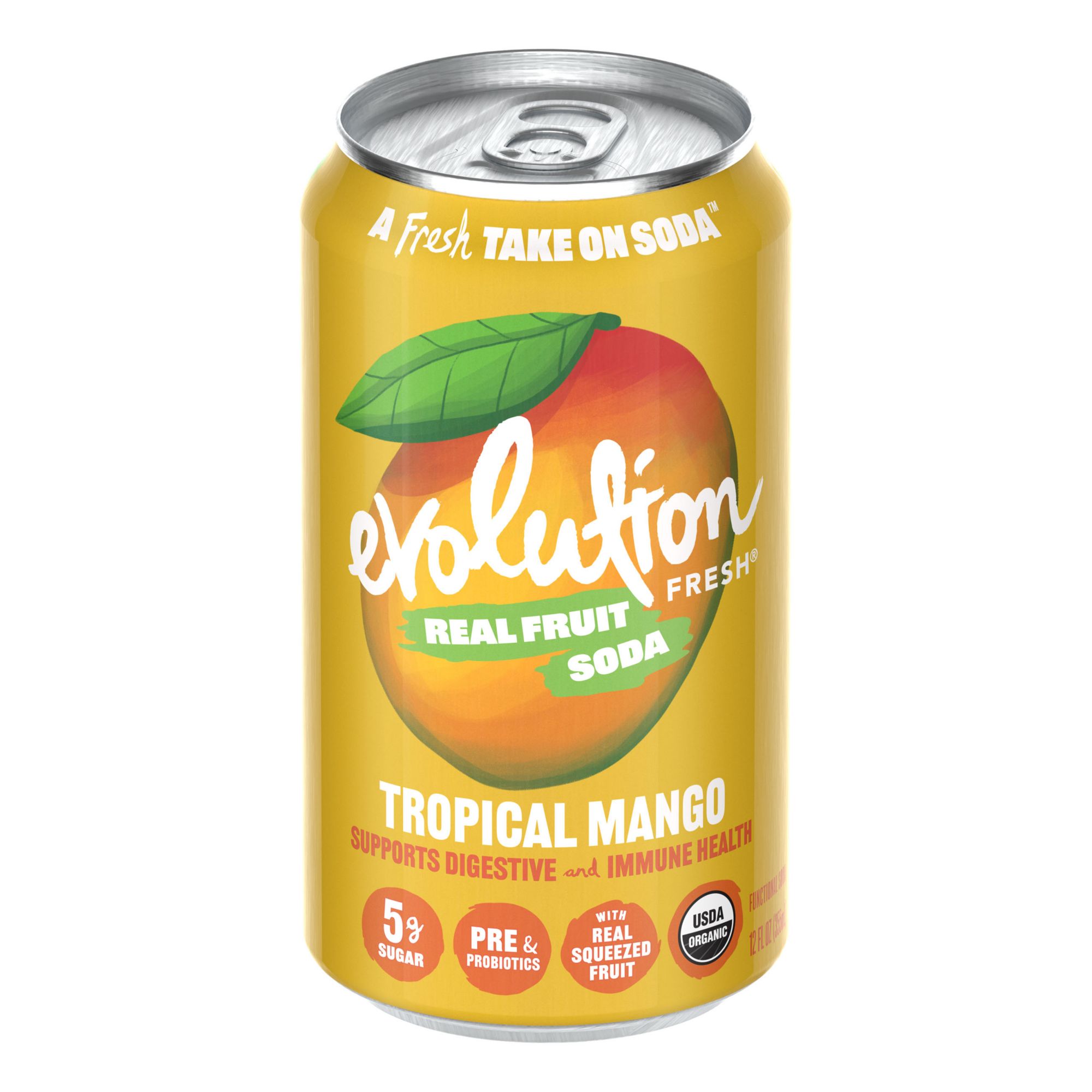 Evolution Fresh Organic Tropical Mango Real Fruit Soda is a refreshing, organic beverage made with real squeezed fruit juices like mango and passionfruit. It contains no added sugar, offering only 5 grams of natural sugar per 12 oz. can. With 45 calories, it's a guilt-free, bubbly alternative to traditional sodas. Enhanced with preobiotics, probiotics, and vitamin C, it supports digestive and immune health. Certified organic, non-GMO, gluten-free, vegan, and kosher.