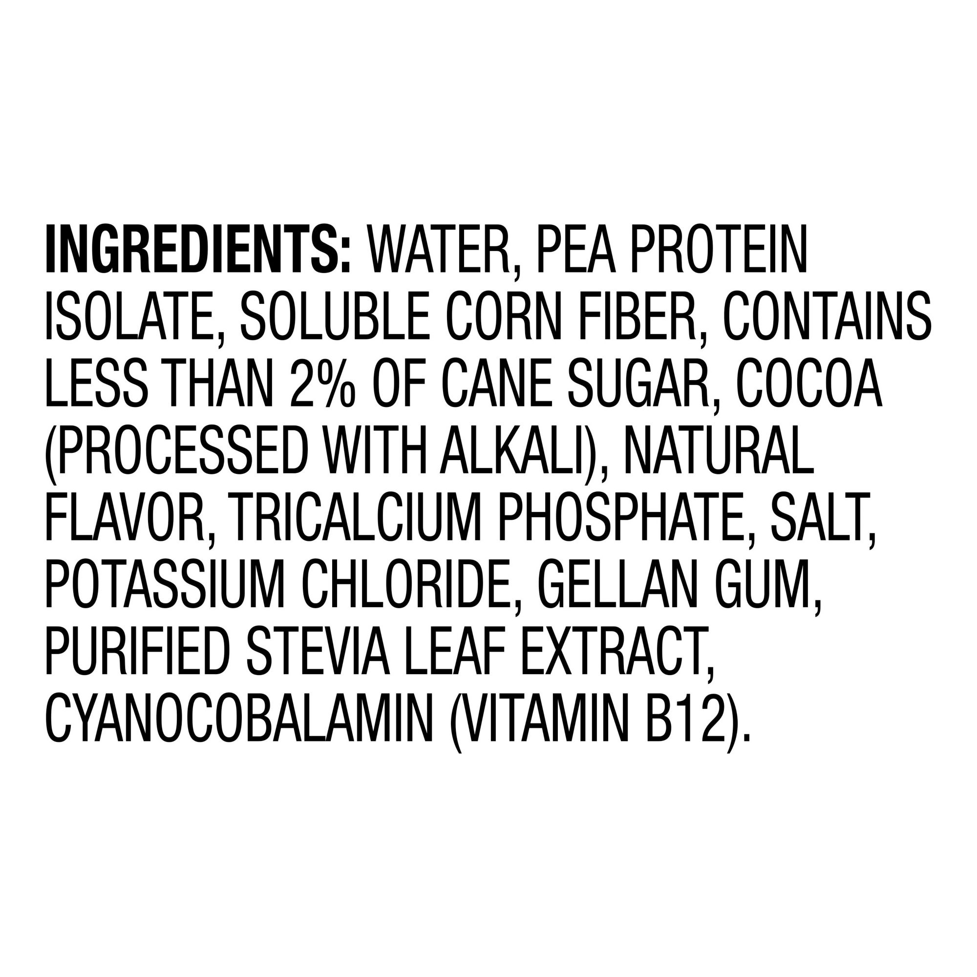 Ingredients: Water, Pea Protein Isolate, Soluble Corn Fiber, Contains Less Than 2% Of Cane Sugar, Cocoa (Processed With Alkali), Natural Flavor, Tricalcium Phosphate, Salt, Potassium Chloride, Gellan Gum, Purified Stevia Leaf Extract, Cyanocobalamin (Vitamin B12). May Contain Soy.
