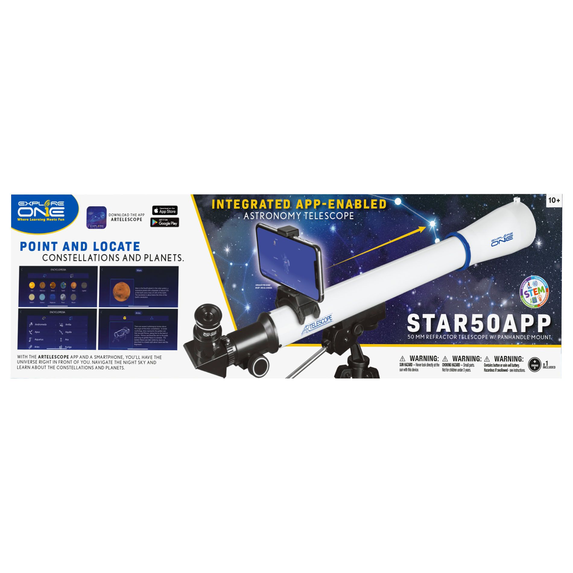 Discover fun details about the constellations and planets as you navigate the night sky with the ExploreOne Star50App refractor telescope, this entry-level observation instrument is an ideal choice for those wanting to begin their amateur astronomy journey. Simply download the app to your handheld device, then connect your device to the Telescope. You can then locate planets, stars, constellations, and hundreds of points in the sky. Track these targets as they move the telescope across the night sky, and learn facts in an audio format, about the objects in the app's database when they come into view. The app also has a quiz feature and an encyclopedia mode filled with facts about your favorite star patterns and solar system sights. This easy-to-use refractor has a 50mm aperture that is great for viewing the moon and other bright night sky treats and comes with a simple panhandle mount for smoothly moving the scope. Two eyepieces are included to allow for varying levels of magnification.