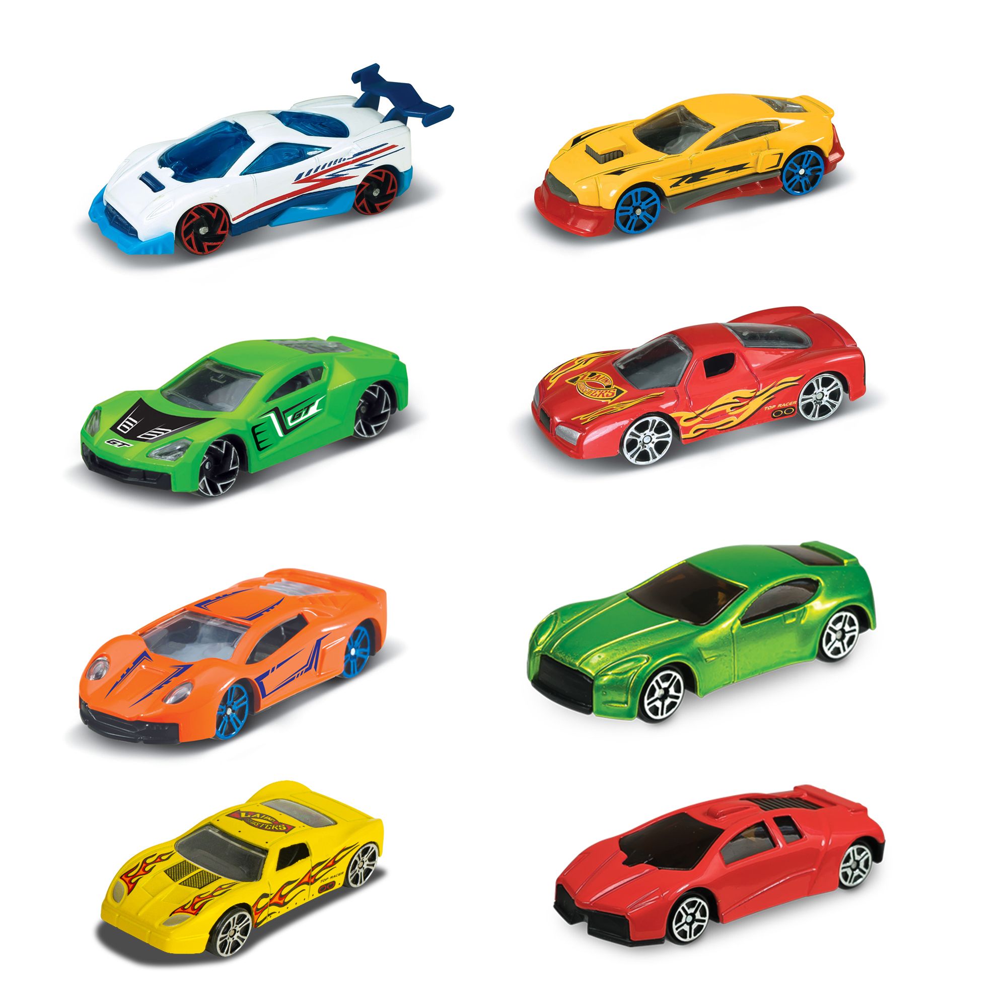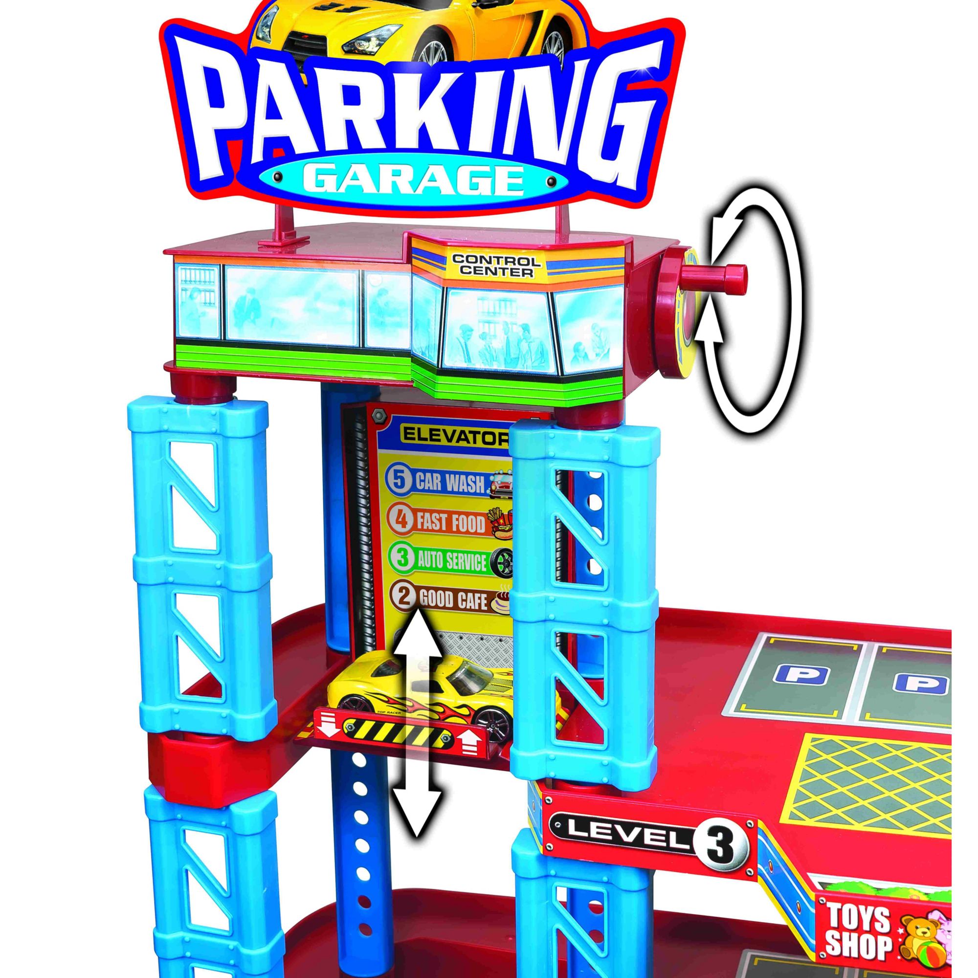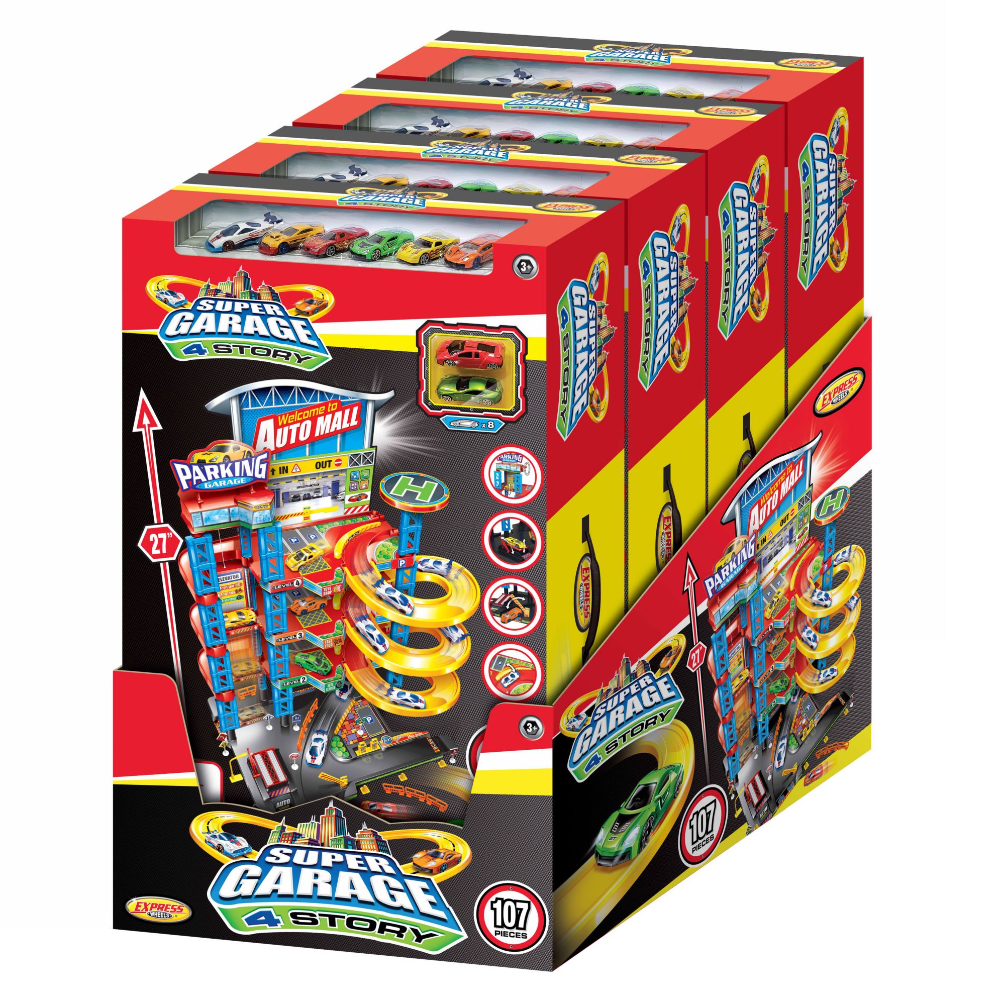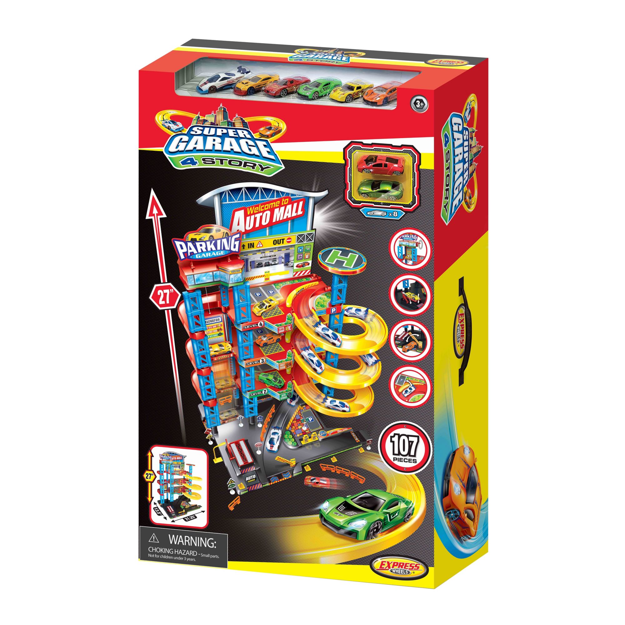 The Express Wheels 4 Story Parking Garage set comes with eight (1:64 Scale) die cast racers cars and with different real style plastic road signs and many others fun play accessories. Whiz the cars down through the 4 levels on the ramps. All eight cars are made of high quality die-cast metal and plastic with authentic styling and eye-catching decorations.