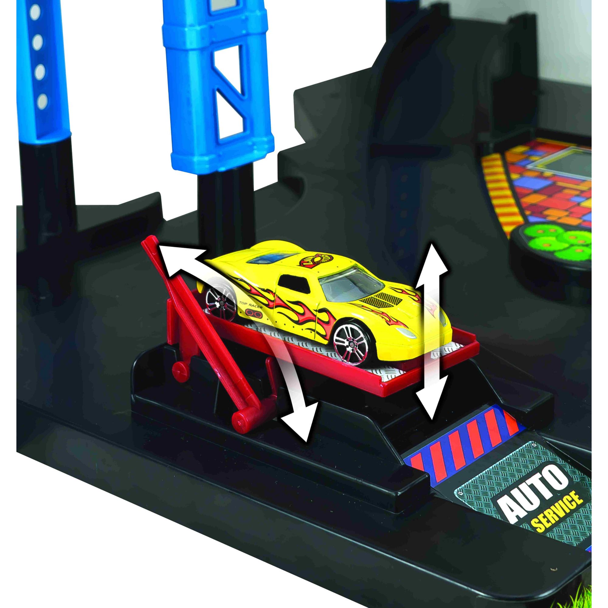 Features a working car lift, ramps, elevator and a petrol pump