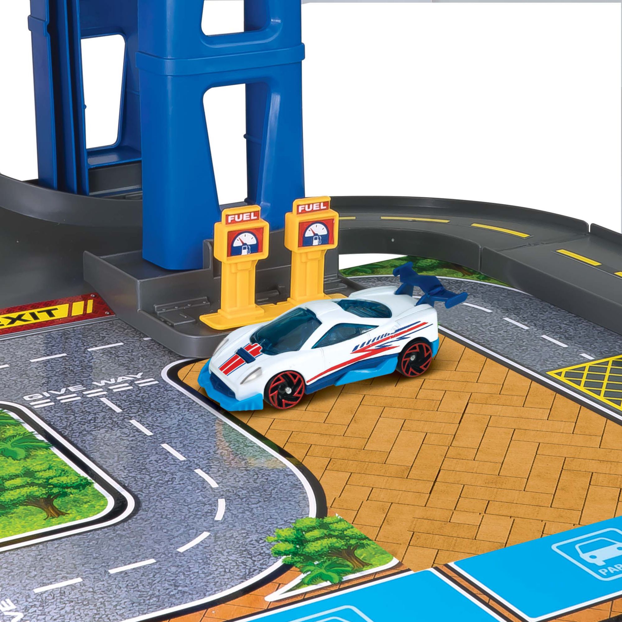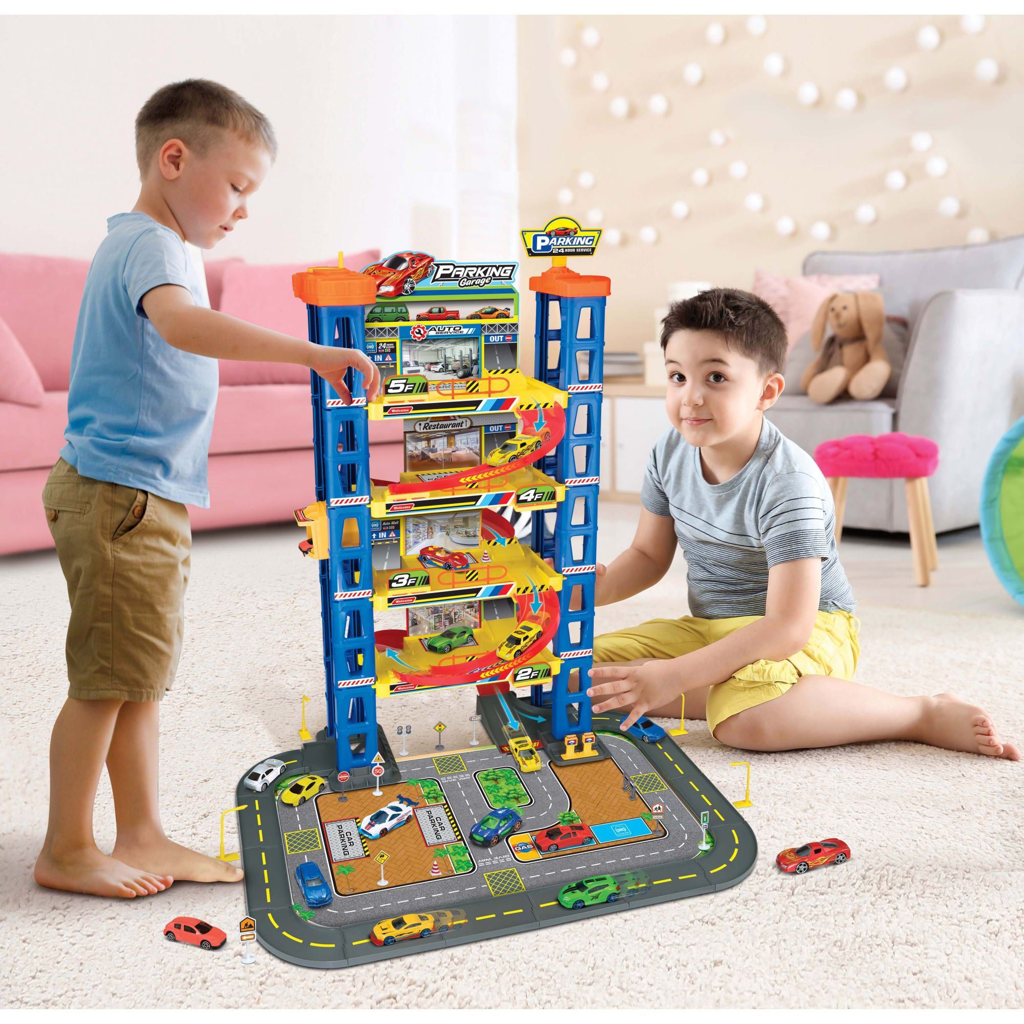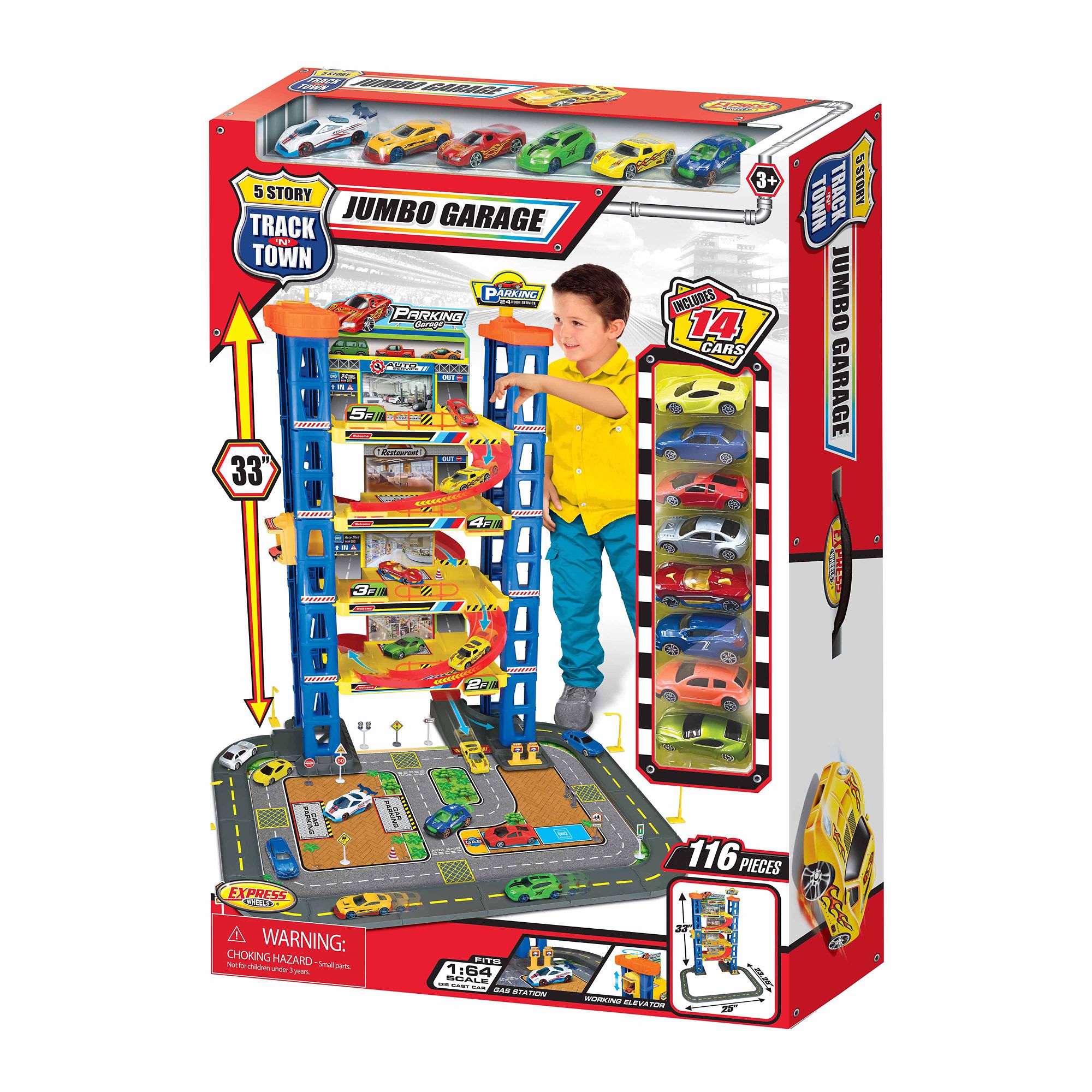 Product set up dimension: 25"L x 23.25"W x 33"H Ideal for alone or group play Jumbo parking garage Five-story parking garage with tracks and ramps 1:64 scale die-cast vehicles, fun play accessories plus paper playmat All cars are made of high-quality die-cast metal and plastic Kids will love the authentic signs and cool manipulative parts Includes 116-pieces of the five-story jumbo parking garage with tracks and ramps on the paper playmat, 14-pieces (1:64 scale) die-cast cars and fun play accessories