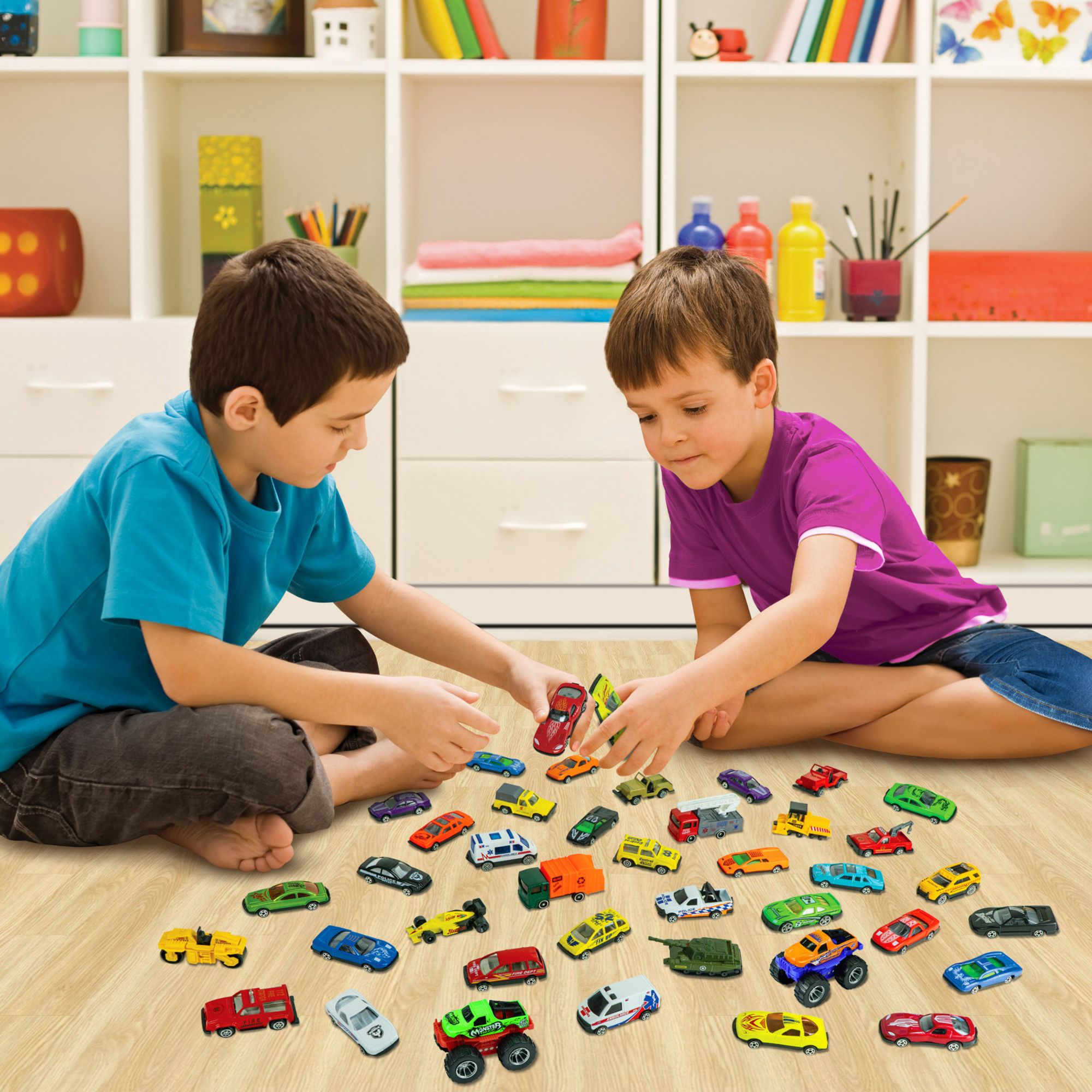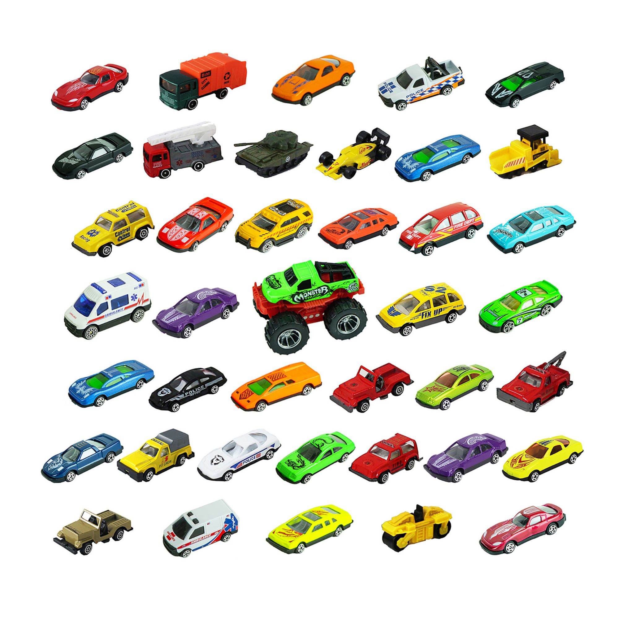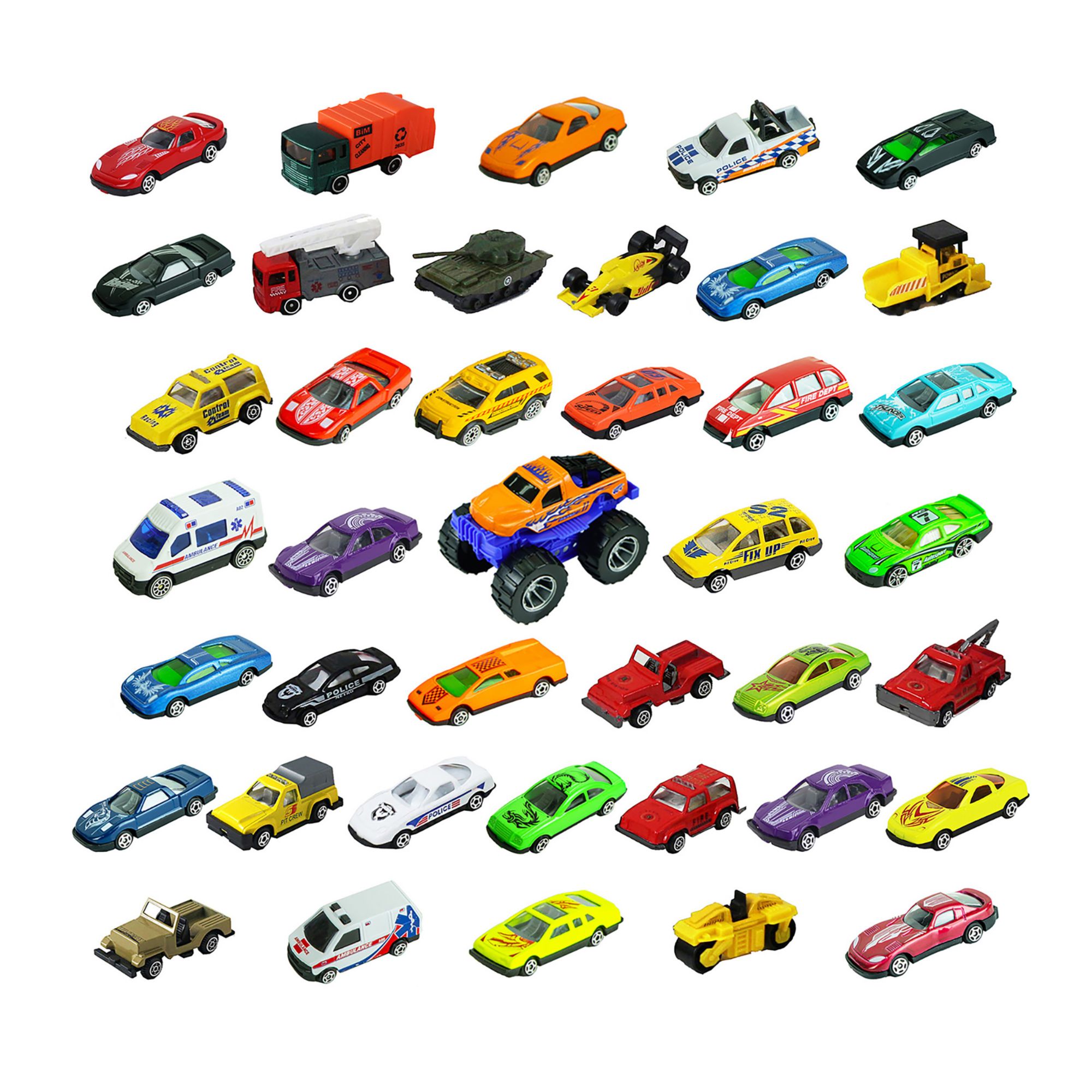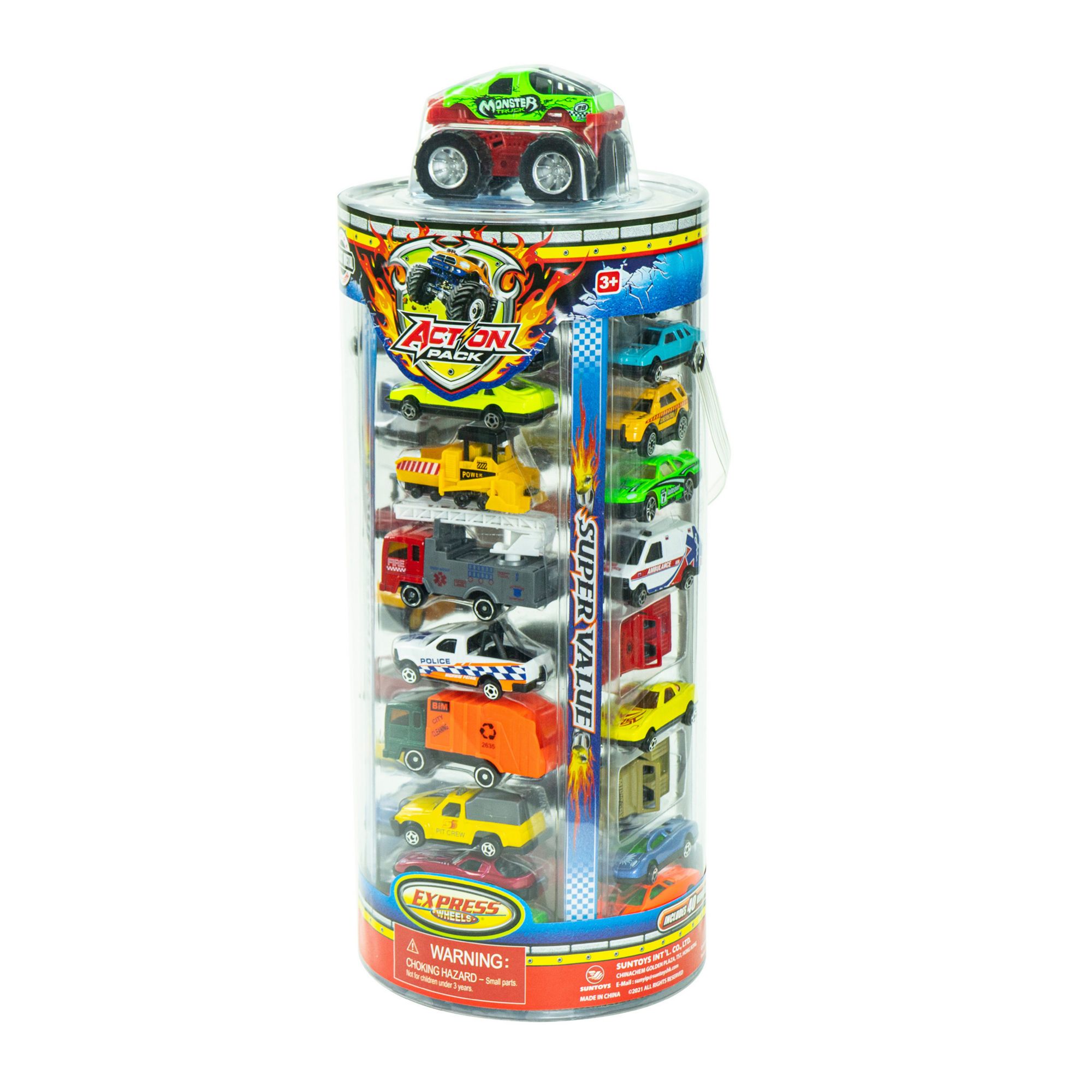 The Express Wheels 40-Pc. Car Tube set includes 39 pieces of 1:64 scale die-cast vehicles plus a one-piece die-cast Monster truck with authentic styling and eye-catching decorations. It offers kids real-life vehicle play patterns with cars featuring fun themes such as rescue, fire, police, military, construction, and racing. All cars are made of high-quality die-cast metal and plastic for years of imaginative play. Kids have everything they need to hit the road with the Express Wheels Action Pack 40 cars in the tube. This set is ideal for alone or group play. Made with authentic detail, this die-cast car set offers many styles of cars, Monster Truck, Racing, Police, military, Fire Trucks, and many more.