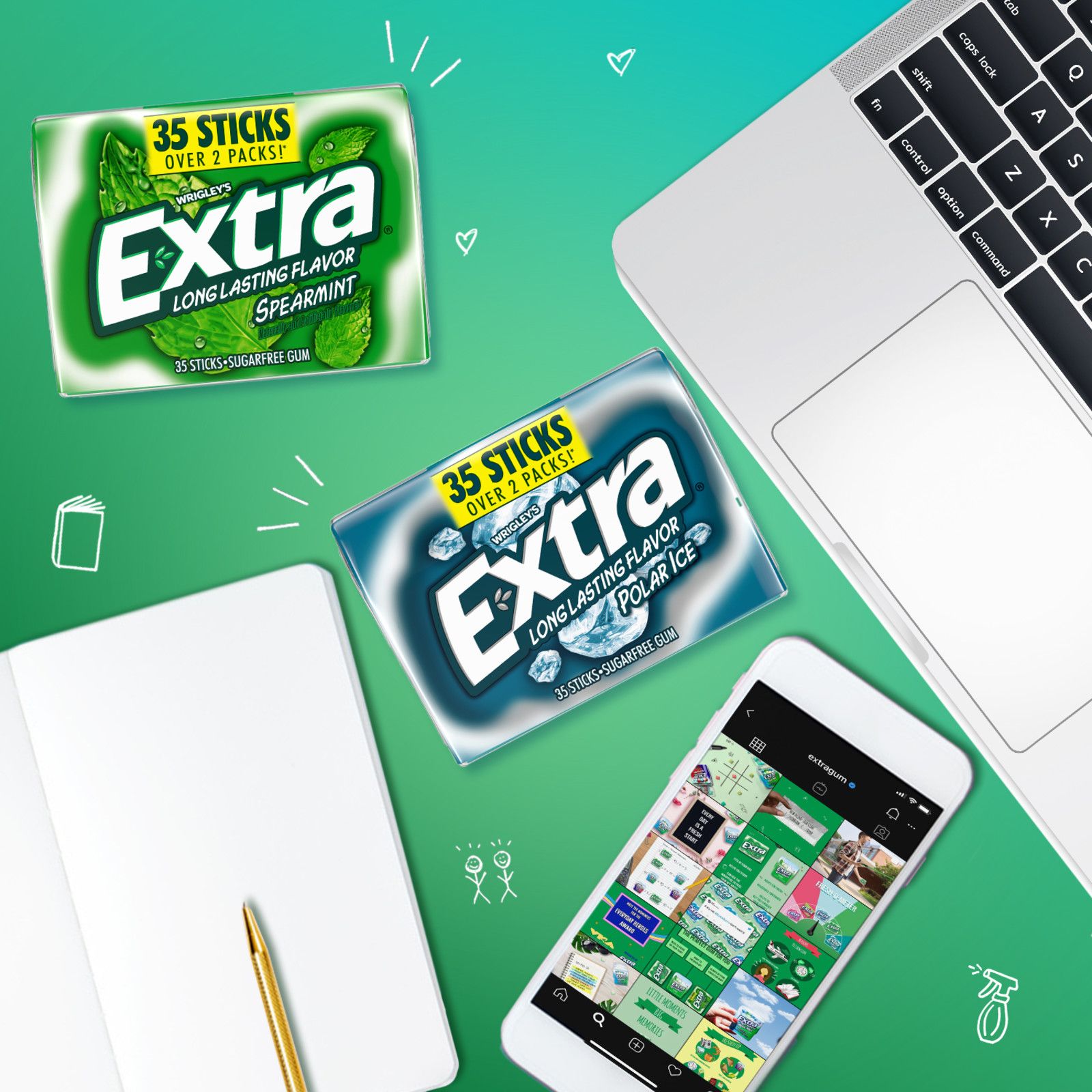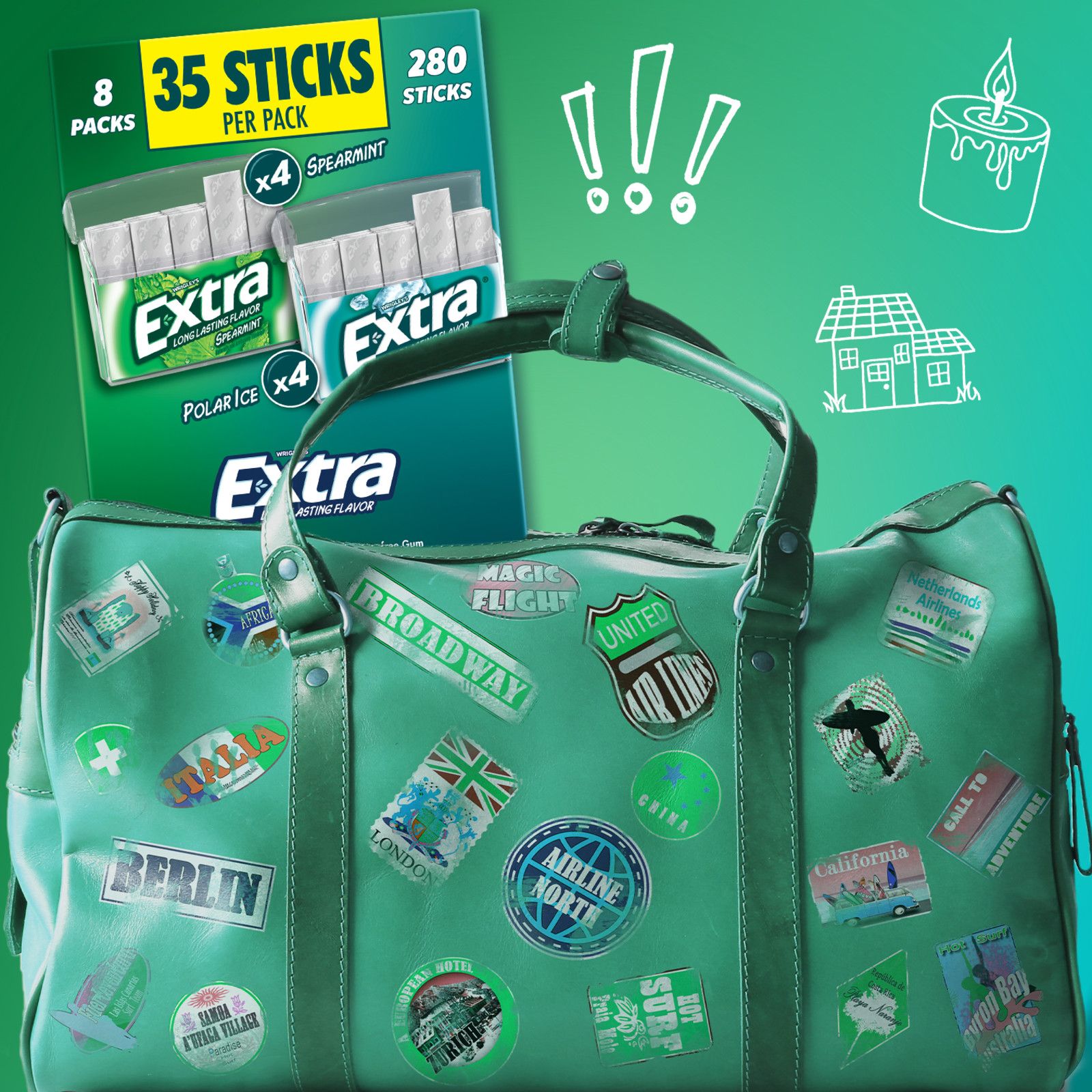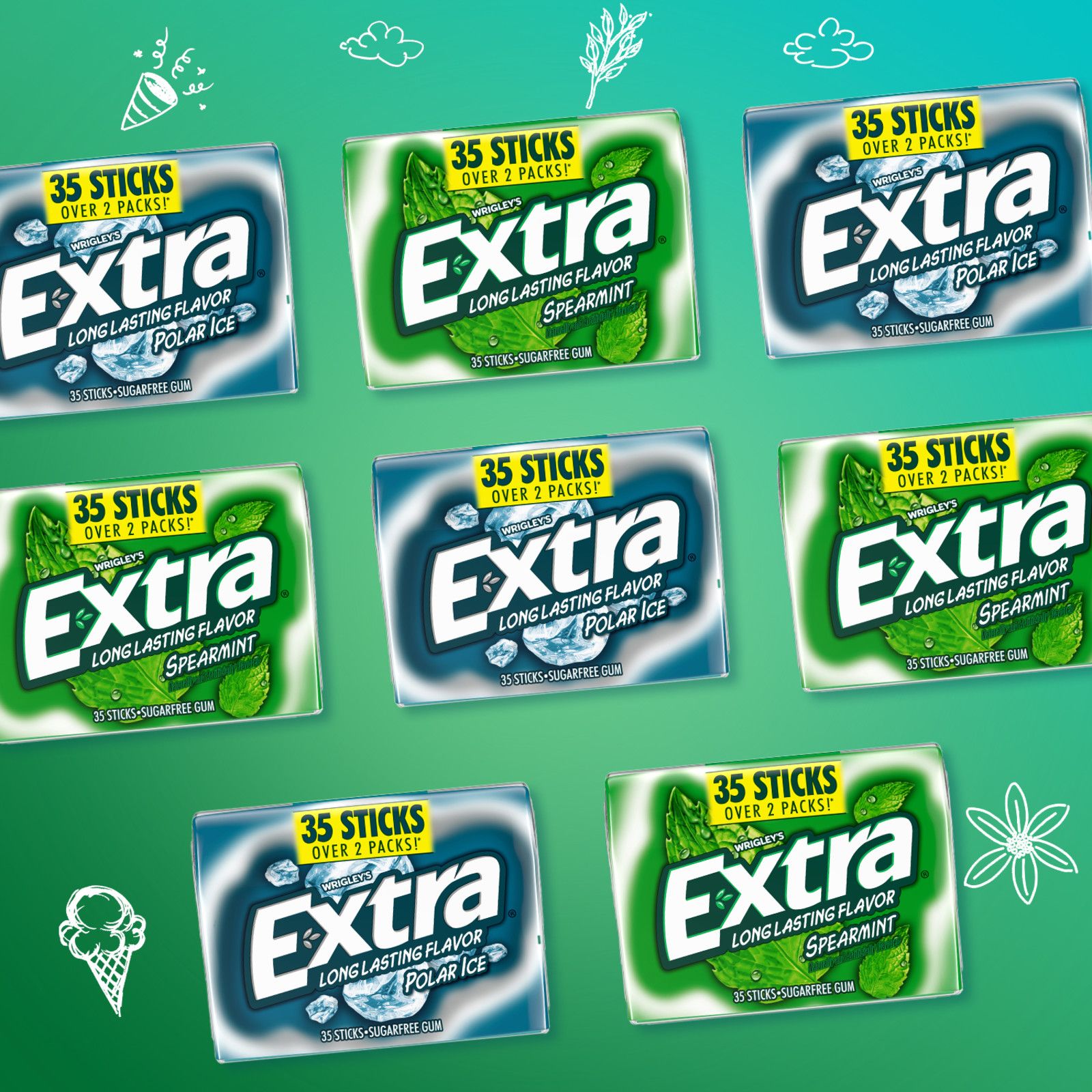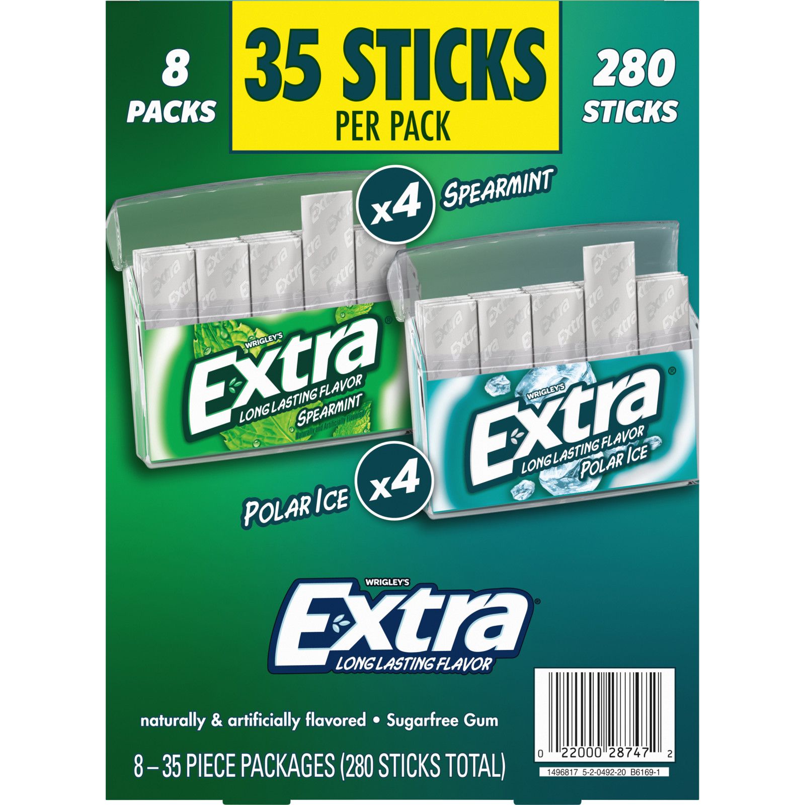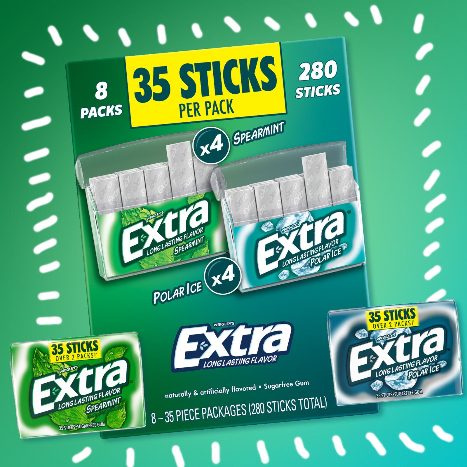 Extra knows: When you give Extra, you get extra. With a total of 280 sticks in this sugar-free mint gum assortment pk., you have unlimited ways to share the joy of your favorite chewing gum. This gum pack features eight pk. of everyone's favorite Extra mint gum flavors with four Peppermint gum and four Spearmint gum packs. Each pack includes 35 individually wrapped sticks of bold mint gum flavor, making it easy to enjoy fresh breath on the go. Extra sugar-free Gum gives you a long-lasting flavor for any occasion. Give a piece to your co-pilot on your next road trip, stock up with this bulk gum pack for the office, or hand it out to your family when they need something fresh to get their day started. Fill the pantry with bulk gum and never miss a moment to give Extra. Stock up on chewing gum for home or the office so you always have breath-freshening flavor on hand. Keep a pack of Extra sugar-free gum at your desk for a delicious way to help you stay focused. Find crisp, invigorating refreshments from head to toe with Extra sugar-free Gum. When you give Extra, you get so much more in return.