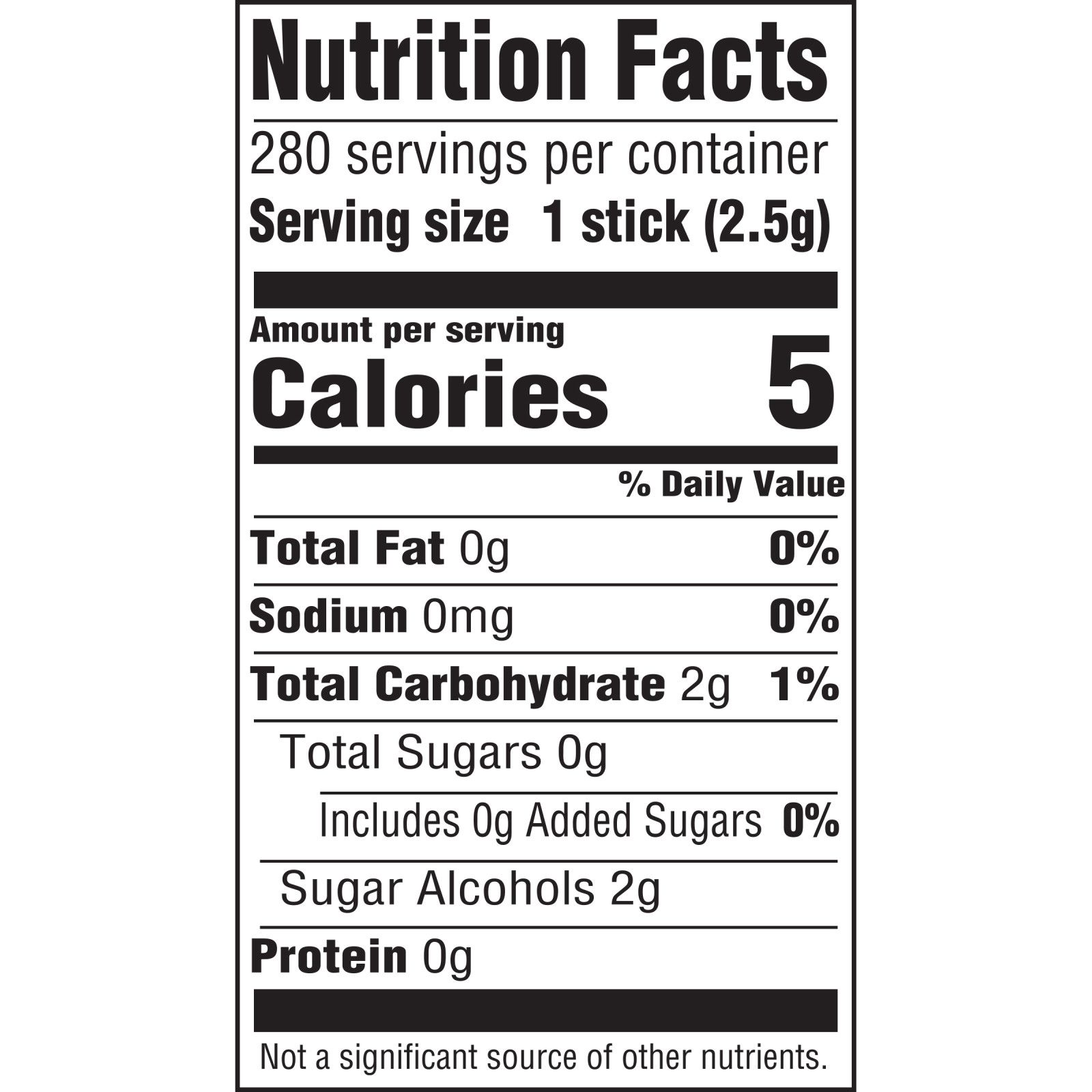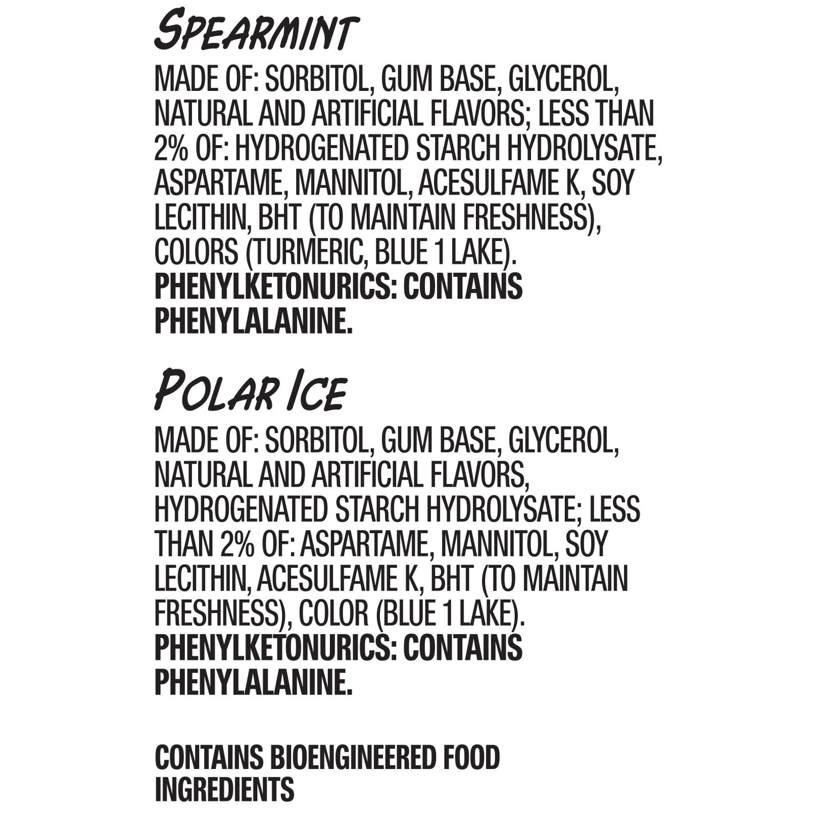 Ingredients: Spearmint: Sorbitol, Gum Base, Glycerol, Natural and Artificial Flavors; Less Than 2% of Hydrogenated Starch Hydrolysate, Aspartame, Mannitol, Acesulfame K, Soy Lecithin, But (to Maintain Freshness), Colors (Turmeric, Blue 1 Lake). 2: Polar Ice: Sorbitol, Gum Base, Glycerol, Natural and Artificial Flavors, Hydrogenated Starch Hydrolysate; Less Than 2% of: Aspartame, Mannitol, Soy Lecithin, Acesulfame K, Bht (To Maintain Freshness), Color (Blue 1 Lake).