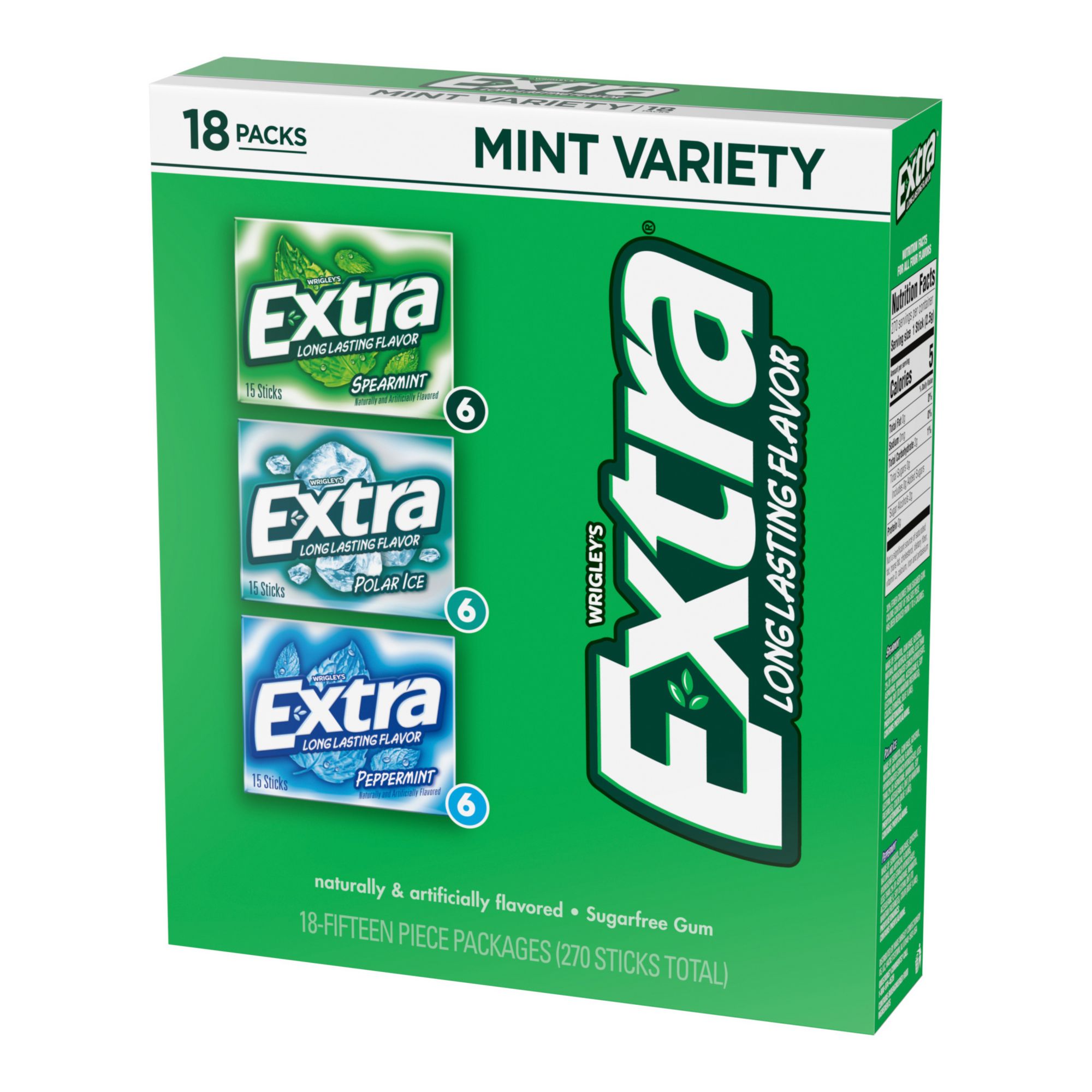 Contains one (1) 18-count bulk box of Extra Sugar Free Chewing Gum Variety Packs