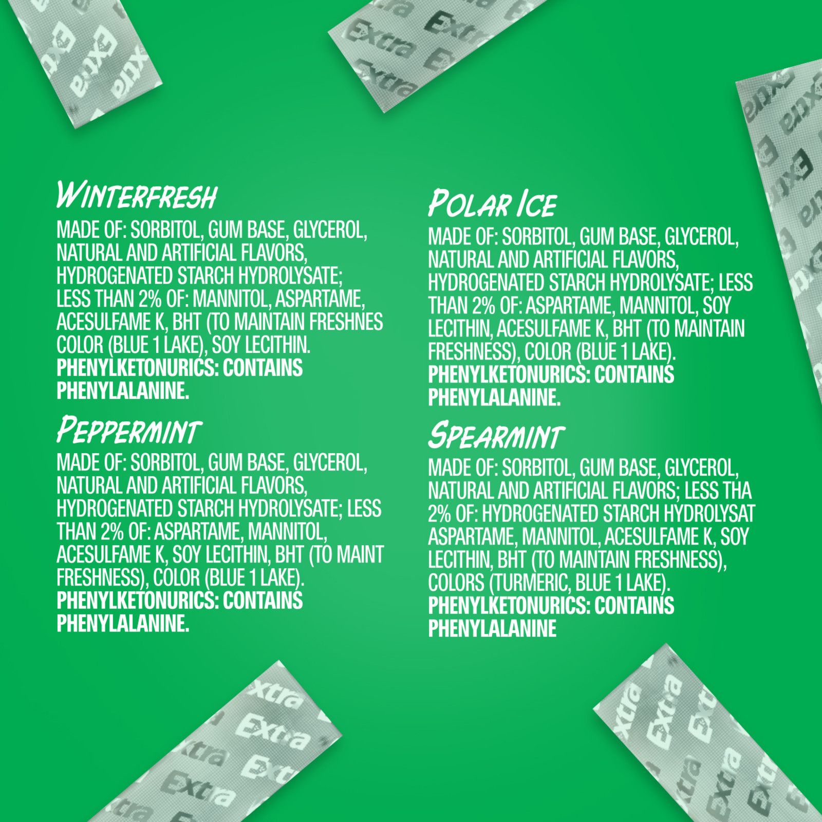 EXTRA knows: When you give EXTRA, you get extra. With a total of 270 sticks in this sugar free mint gum variety pack, you have unlimited ways to share the joy of your favorite chewing gum. This bulk gum variety pack features 18 packs of everyone’s favorite EXTRA mint gum flavors with 4 Winterfresh, 4 Peppermint, 5 Polar Ice, and 5 Spearmint gum packs. Each pack includes 15 individually wrapped sticks of bold mint gum flavor, making it easy to enjoy fresh breath on the go. EXTRA Sugar Free Gum gives you long-lasting flavor for any occasion. Give a piece to your co-pilot on your next road trip, stock up with this bulk gum pack for the office, or hand it out to your family when they need something fresh to get their day started. Fill the pantry with bulk gum and never miss a moment to give EXTRA. Stock up on chewing gum for home or the office so you always have breath-freshening flavor on hand. Keep of a pack of EXTRA sugar free gum at your desk for a delicious way to help you stay focused. Find crisp, invigorating refreshment from head to toe with EXTRA Sugar Free Gum. When you give EXTRA, you get so much more in return.