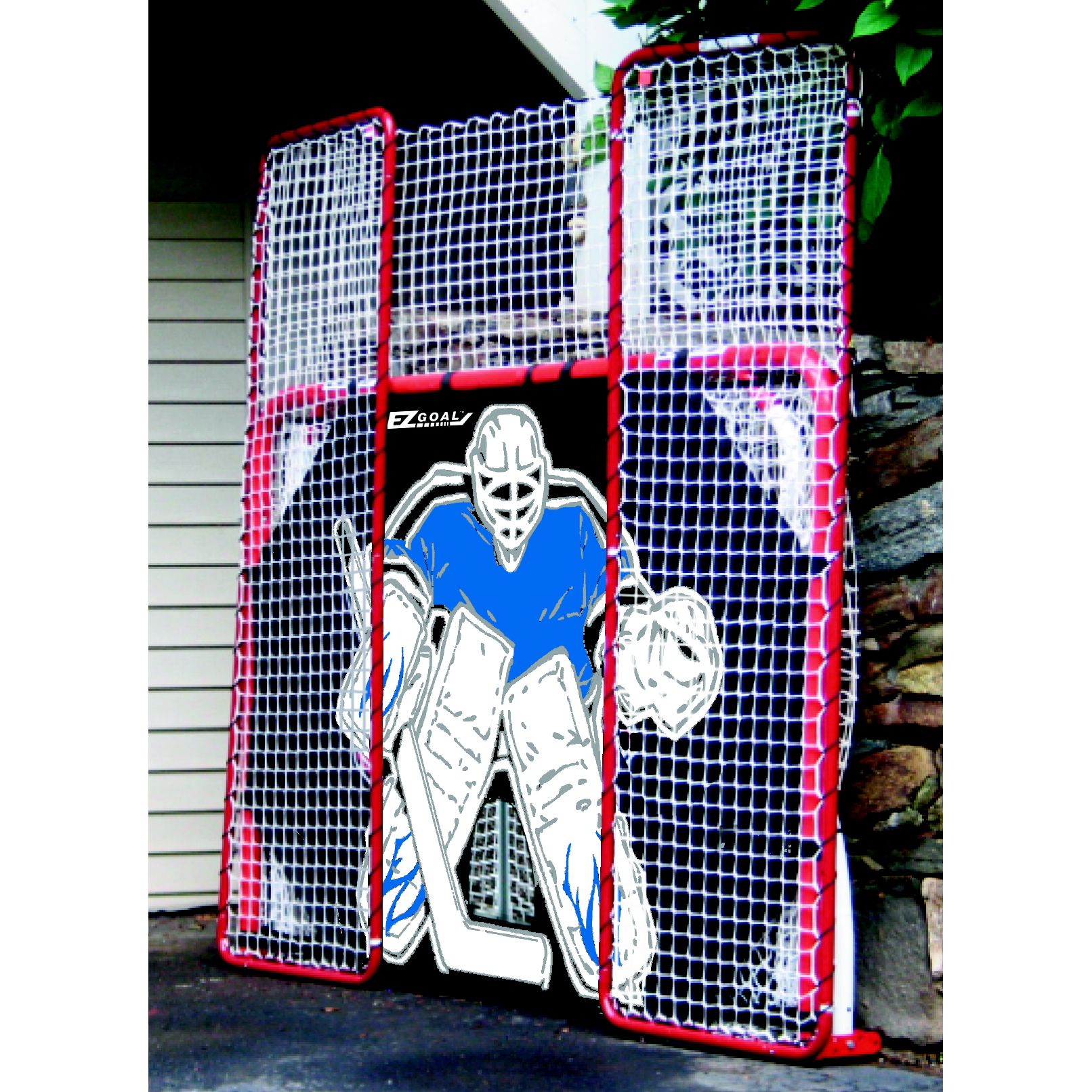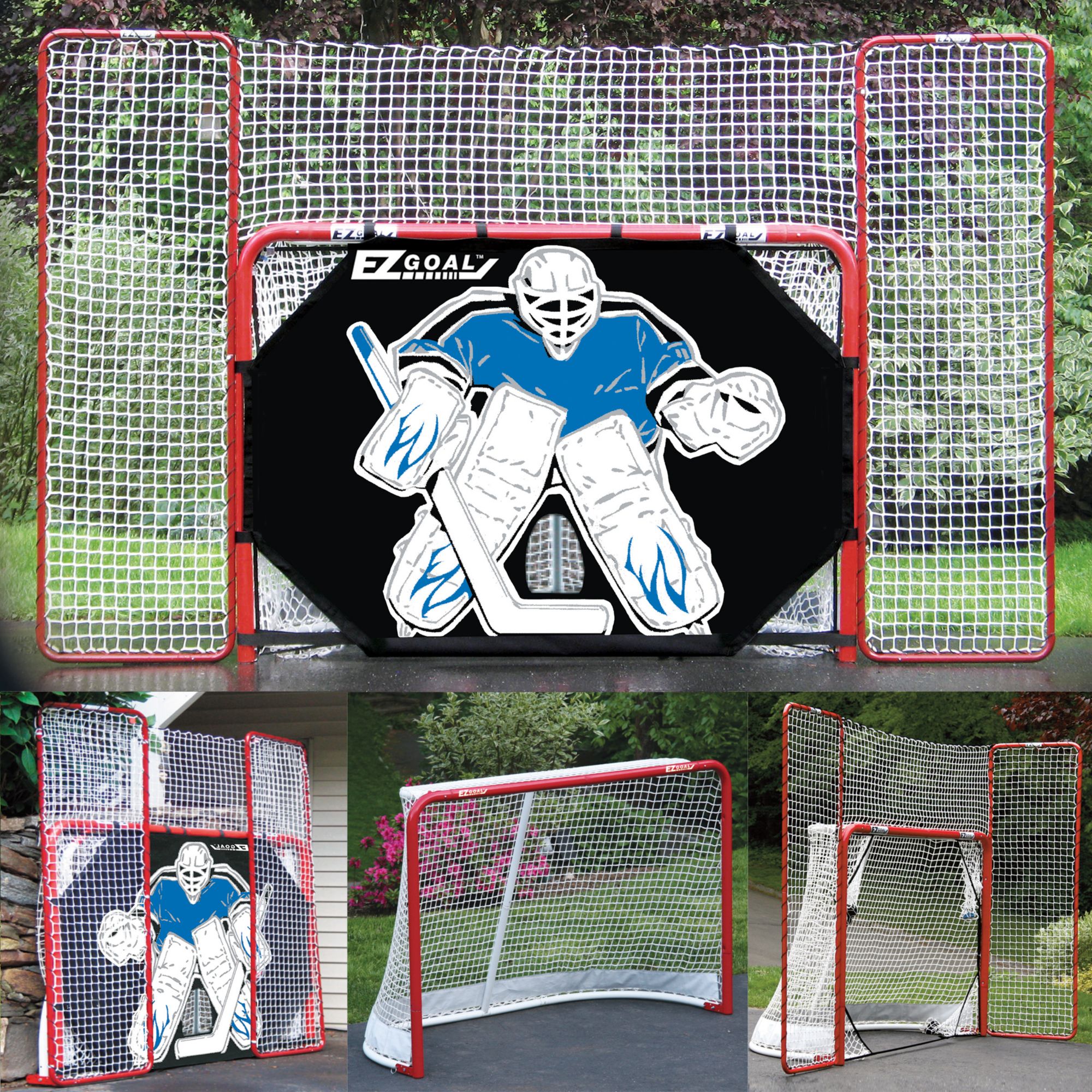 Whether you're practicing slap shots from the blue line, wristers near the goal or pinpoint passes, this EZ Goal 10' x 6' Complete Hockey Trainer is built to handle it. The goalie features 5 shooting targets, so you can improve your aim, and the all-steel frame and netting help protect garage doors, windows and surrounding objects from flying pucks. When practice is over, you can simply fold the entire unit flat for simple storage.