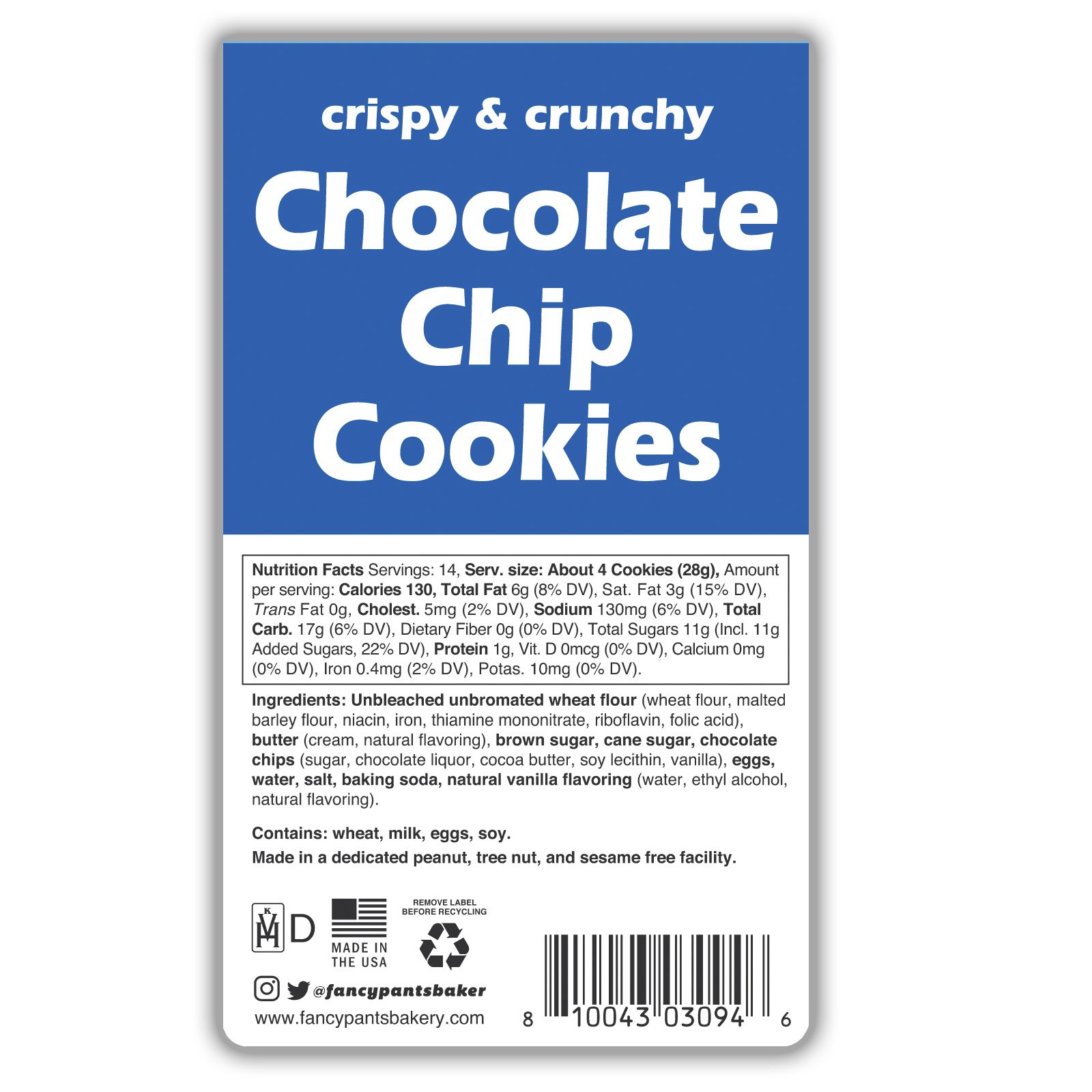 Fancypants Baking Co. has a mission to make consistently delicious natural, non-GMO, nut free and allergy friendly baked goods. With a history of hand-crafted products, they're dedicated to customer happiness, absolute quality, and healthier foods that always taste great. These Mini Crispy Chocolate Chip Cookies are one of their most popular creations, and made just the same way as they did when they founded their bakery out of a tiny Boston apartment kitchen back in 2004.