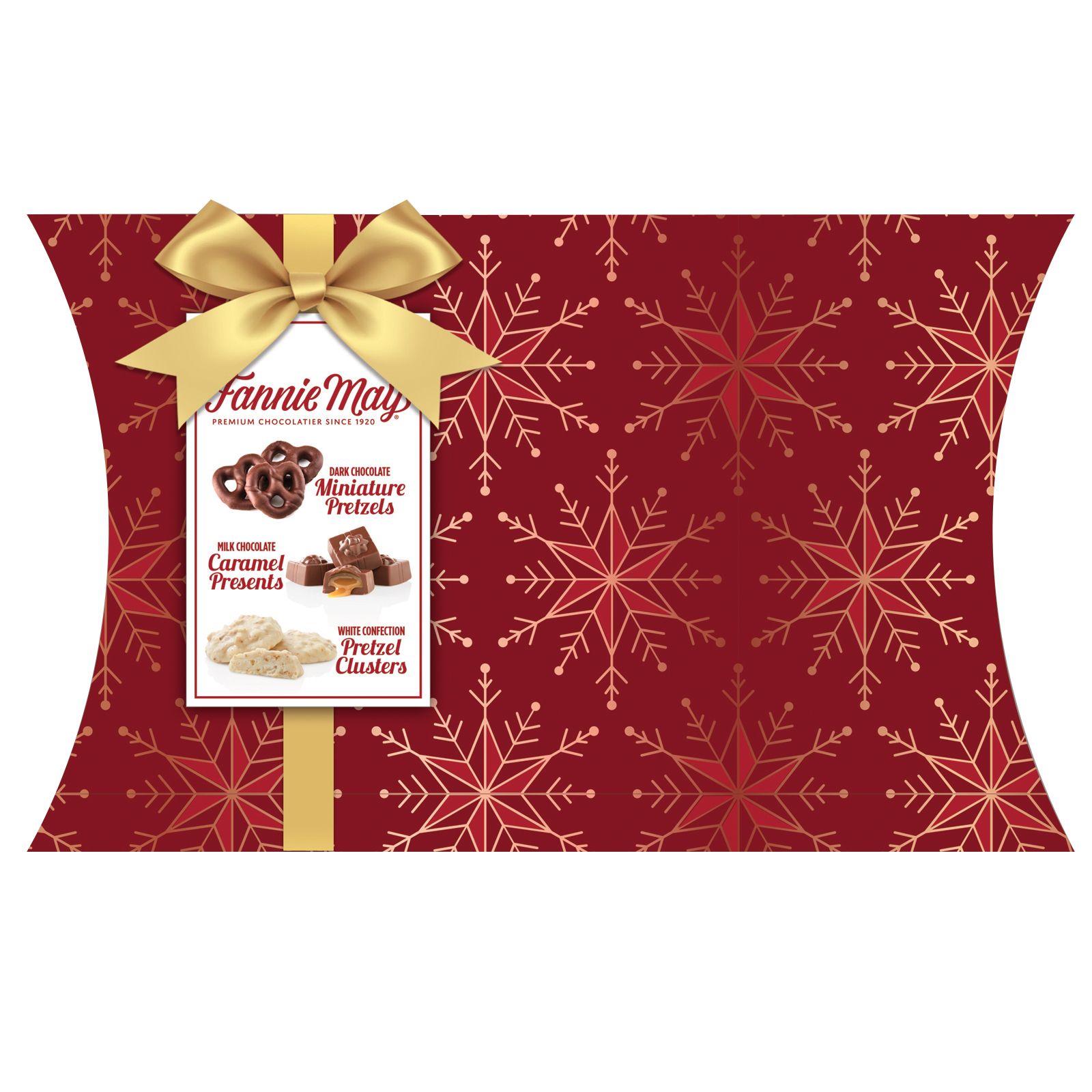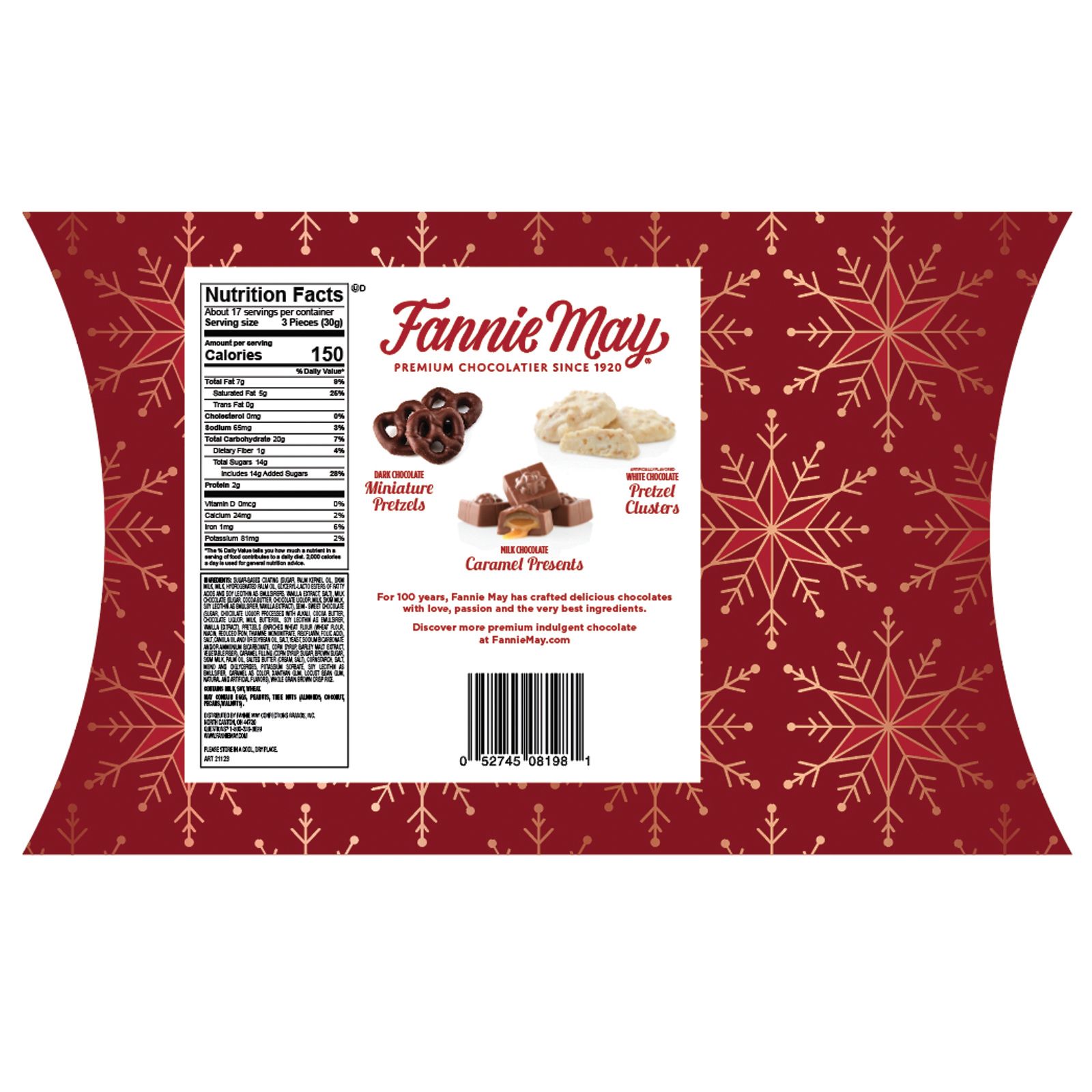The Fannie May Holiday Gift Box includes dark chocolate miniature pretzels, milk chocolate caramel "present" truffles, and white confection pretzel clusters. This selection is great for holiday parties, and makes a great hostess gift. Share this assortment of sweets with your family and friends this holiday season.
