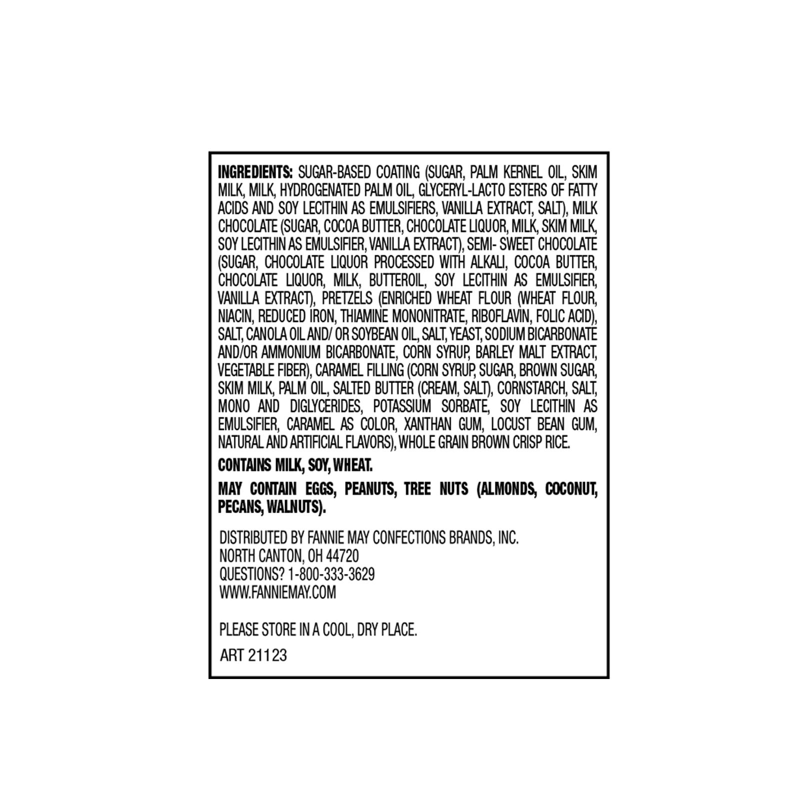Ingredients: Sugar-Based Coating (Sugar, Palm Kernel Oil, Skim Milk, Milk, Hydrogenated Palm Oil, Glyceryl-lacto Esters Of Fatty Acids And Soy Lecithin As Emulsifiers, Vanilla Extract, Salt), Milk Chocolate (Sugar, Cocoa Butter, Chocolate Liquor, Milk, Skim Milk, Soy Lecithin As Emulsifier, Vanilla Extract), Semi-sweet Chocolate (Sugar, Chocolate Liquor Processed With Alkali, Cocoa Butter, Chocolate Liquor, Milk, Butteroil, Soy Lecithin As Emulsifier, Vanilla Extract), Pretzels (Enriched Wheat Flour (Wheat Flour, Niacin, Reduced Iron, Thiamine Mononitrate, Riboflavin, Folic Acid), Salt, Canola Oil And/or Soybean Oil, Salt, Yeast, Sodium Bicarbonate And/or Ammonium Bicarbonate, Corn Syrup, Barley Malt Extract, Vegetable Fiber), Caramel Filling (Corn Syrup, Sugar, Brown Sugar, Skim Milk, Palm Oil, Salted Butter (Cream, Salt), Cornstarch, Salt, Mono And Diglycerides, Potassium Sorbate, Soy Lecithin As Emulsifier, Caramel As Color, Xanthan Gum, Locust Bean Gum, Natural And Artificial Flavors), Whole Grain Brown Crisp Rice.