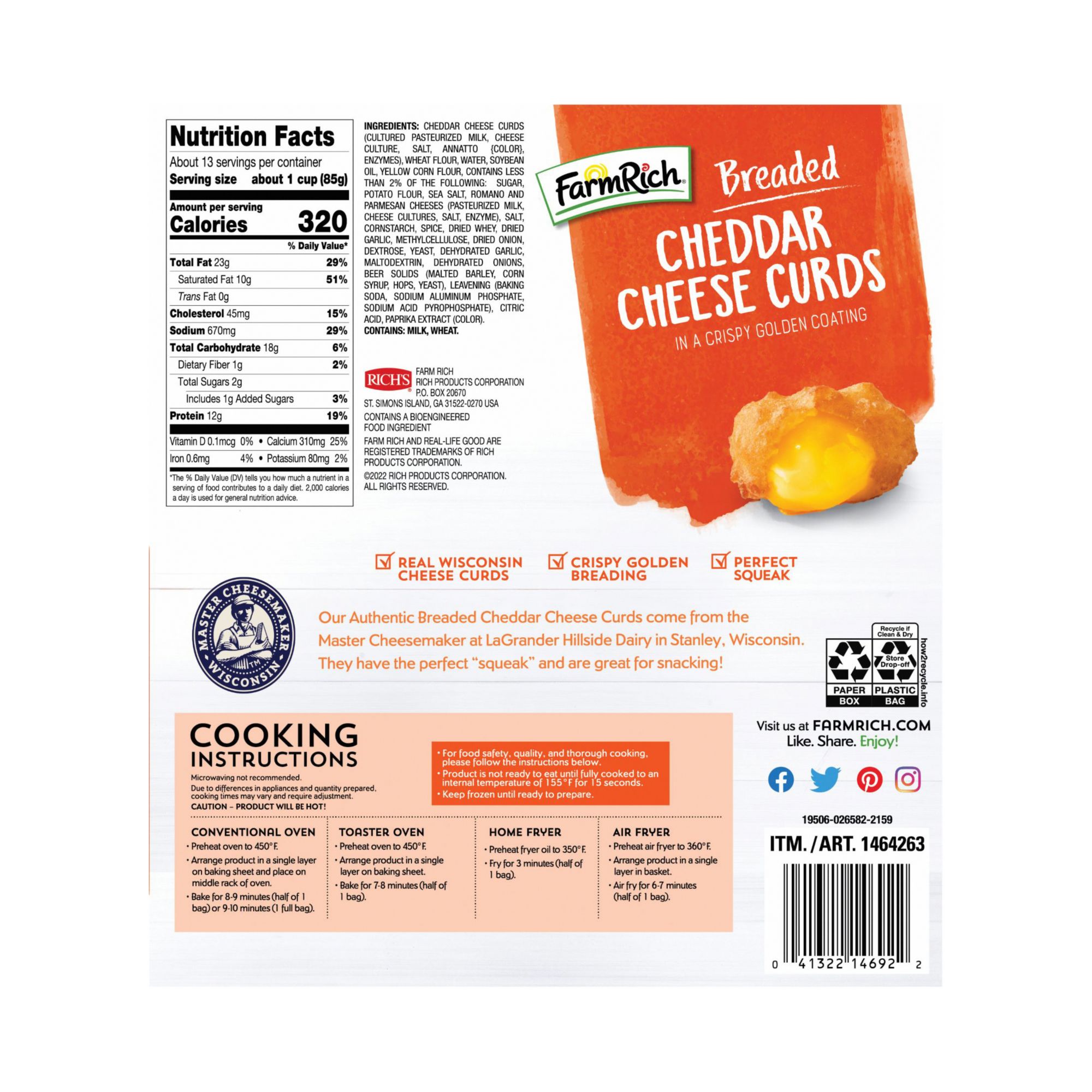 These breaded cheese curds are literally bursting with goodness! Don't be surprised if you see some of the curds melt out of the breading. Messy? Sure. Delicious? Absolutely! From the Farm to your table...When cheddar cheese is just a few hours old, it starts out as fresh curds that have a mild, salty flavor and "squeak" when you eat them-the ultimate sign of freshness. These curds come from La Grander Hillside Dairy in Stanley, Wisconsin. The plush pastures, constant milk flow, and commitment from Wisconsin's finest dairy farmers ensure that you'll enjoy this delicious cheesy restaurant favorite in your own home.