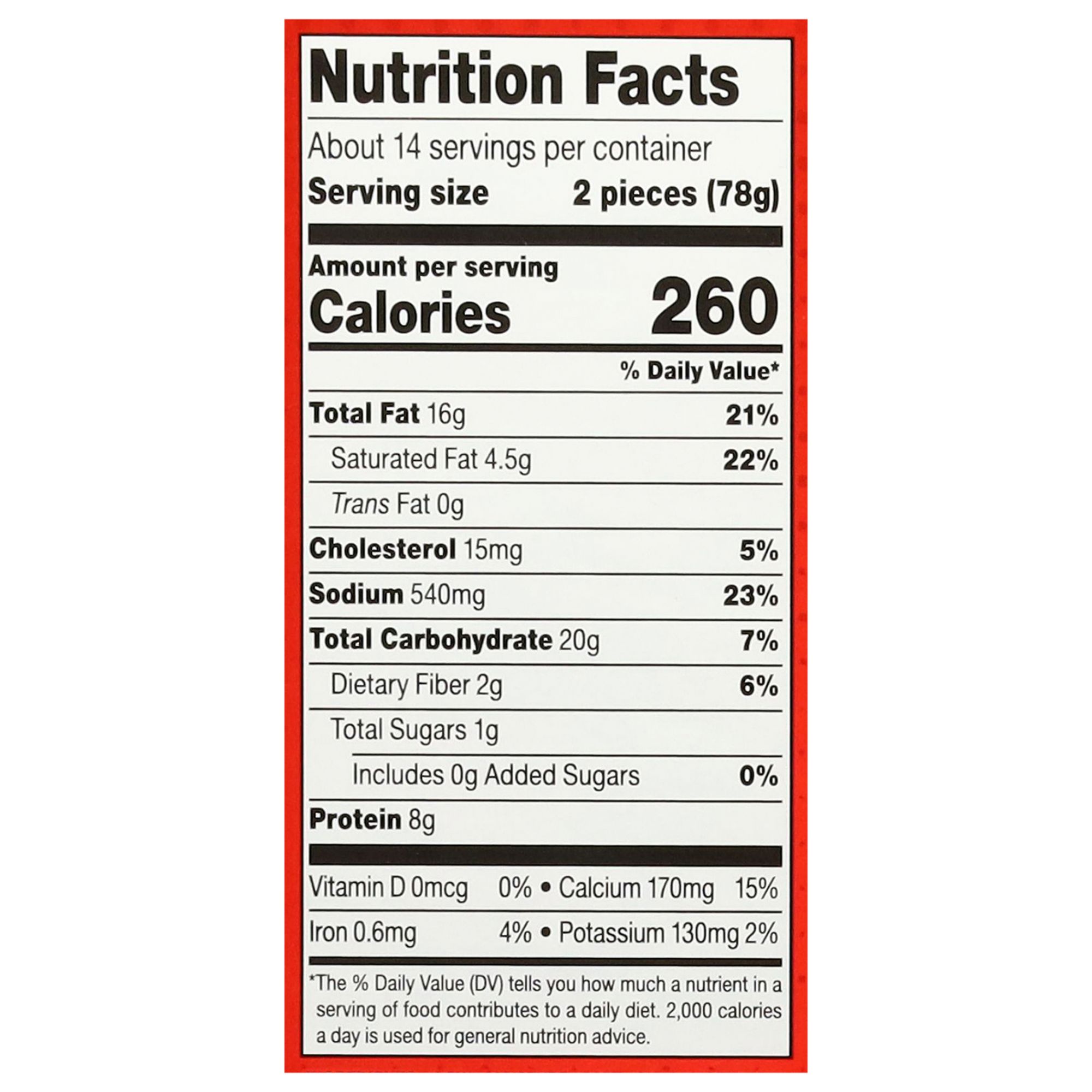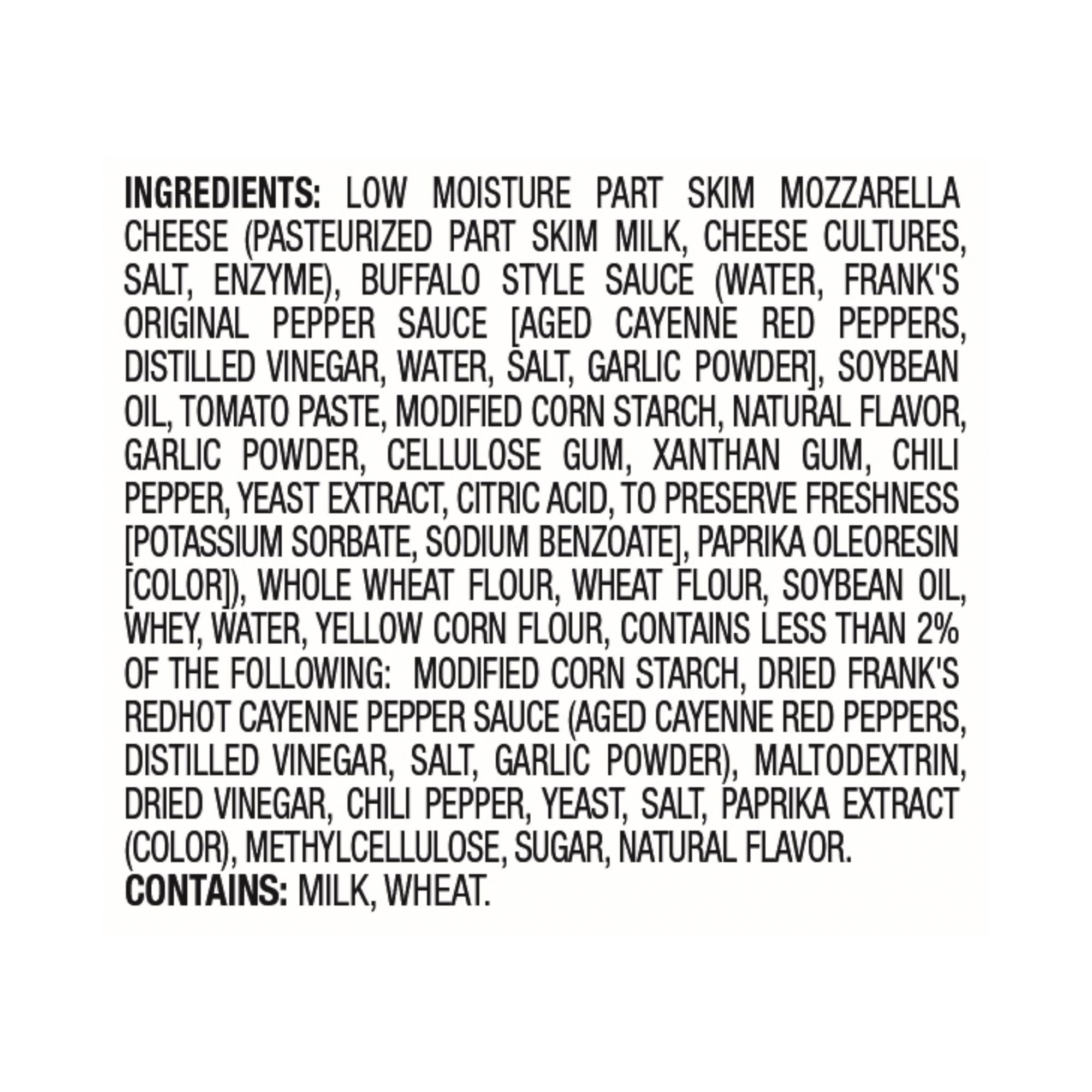 Ingredients: Low Moisture Part Skim Mozzarella Cheese (Pasteurized Part Skim Milk, Cheese Cultures, Salt, Enzyme), Buffalo Style Sauce (Water, Frank's Original Pepper Sauce [Aged Cayenne Red Peppers, Distilled Vinegar, Water, Salt, Garlic Powder], Soybean Oil, Tomato Paste, Modified Corn Starch, Natural Flavor, Garlic Powder, Cellulose Gum, Xanthan Gum, Chili Pepper, Yeast Extract, Citric Acid, To Preserve Freshness [Potassium Sorbate, Sodium Benzoate], Paprika Oleoresin [Color]), Whole Wheat Flour, Wheat Flour, Soybean Oil, Whey, Water, Yellow Corn Flour, Contains Less Than 2% Of The Following: Modified Corn Starch, Dried Frank's Redhot Cayenne Pepper Sauce (Aged Cayenne Red Peppers, Distilled Vinegar, Salt, Garlic Powder), Maltodextrin, Dried Vinegar, Chili Pepper, Yeast, Salt, Paprika Extract (Color), Methylcellulose, Sugar, Natural Flavor.