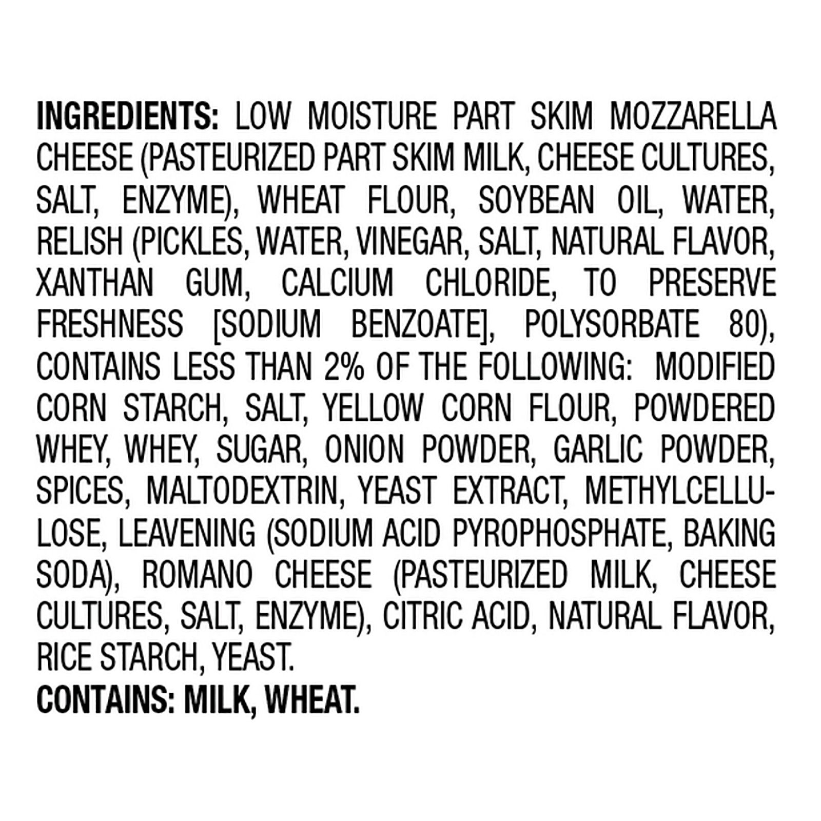Ingredients: Low Moisture Part Skim Mozzarella Cheese (Pasteurized Part Skim Milk, Cheese Cultures, Salt, Enzyme), Wheat Flour, Soybean Oil, Water, Relish (Pickles, Water, Vinegar, Salt, Natural Flavor, Xanthan Gum, Calcium Chloride, To Preserve Freshness [Sodium Benzoate], Polysorbate 80), Contains Less Than 2% Of The Following: Modified Corn Starch, Salt, Yellow Corn Flour, Powdered Whey, Whey, Sugar, Onion Powder, Garlic Powder, Spices, Maltodextrin, Yeast Extract, Methylcellulose, Leavening (Sodium Acid Pyrophosphate, Baking Soda), Romano Cheese (Pasteurized Milk, Cheese Cultures, Salt, Enzyme), Citric Acid, Natural Flavor, Rice Starch, Yeast.