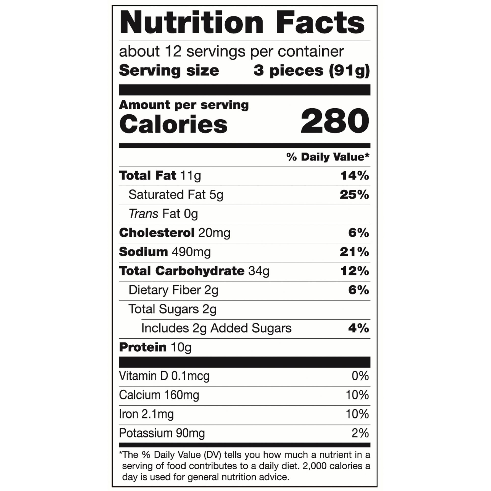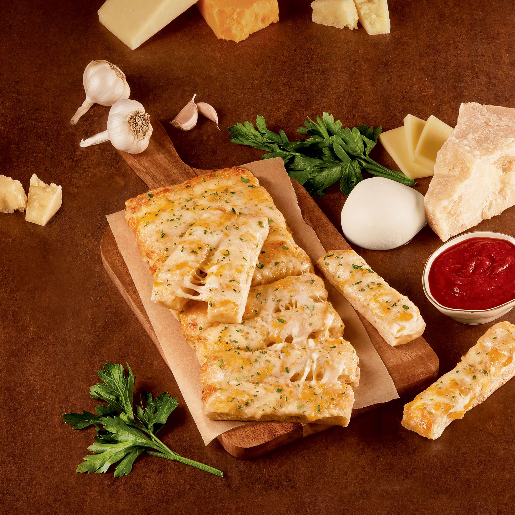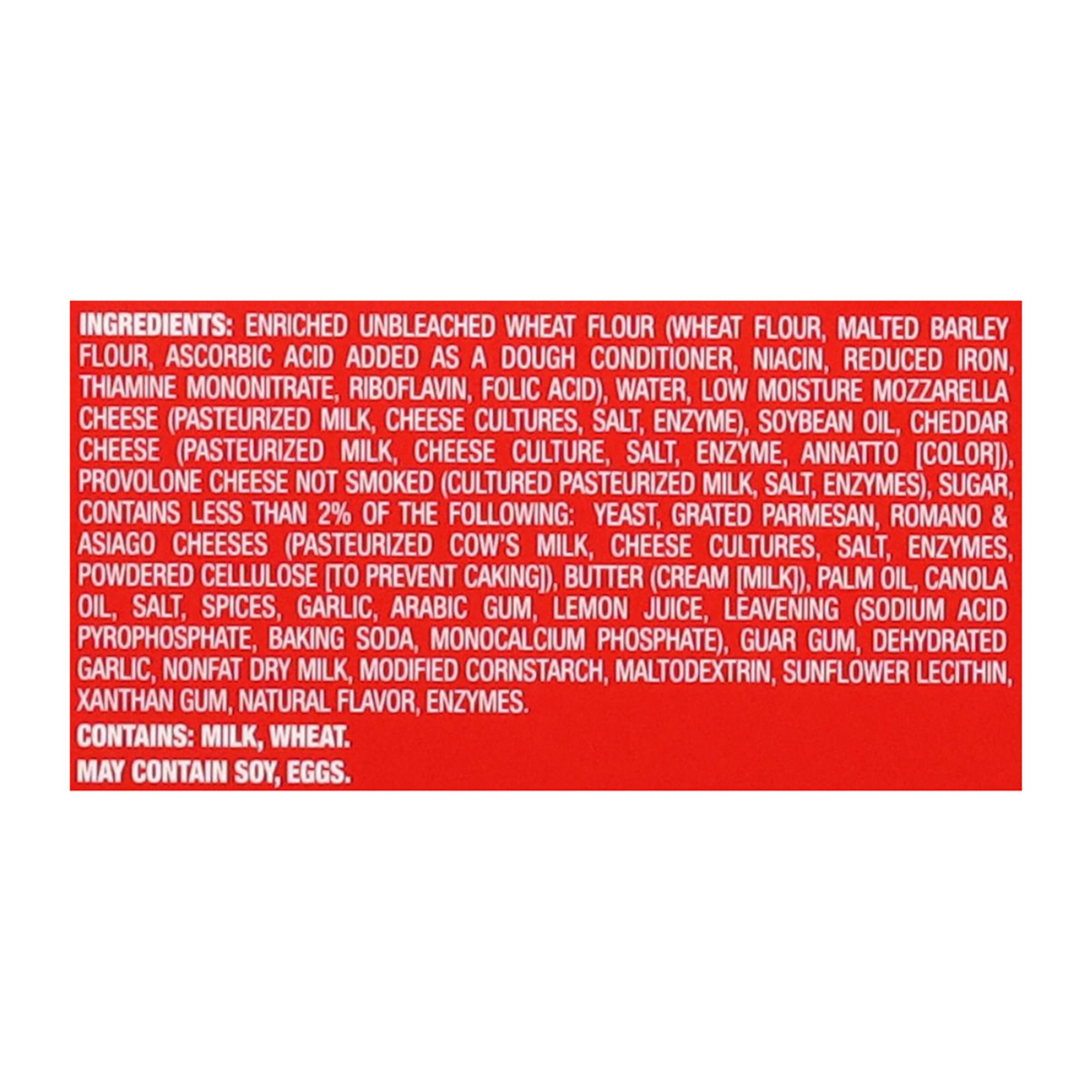 Ingredients: Enriched Unbleached Wheat (Wheat Flour, Malted Barley Flour, Ascorbic Acid Added as a Dough Conditioner, Niacin, Reduced Iron, Thiamine Mononitrate Riboflavin, Folic Acid), Water, Low Moisture Mozzarella Cheese (Pasteurized Milk Cheese Cultures, Salt, Enzyme), Soybean Oil, Cheddar Cheese (Pasteurized Milk, Cheese Culture, Salt, Enzyme, Annatto [Color]), Provolone Cheese Not Smoked (Cultured Pasteurized Milk, Salt, Enzymes), Sugar, Contains Less than 2% of the Following: Yeast, Grated Parmesan, Romano & Asiago Cheeses (Pasteurized Cows Milk, Cheese Cultures, Salt, Enzymes, Powdered Cellulose [to Prevent Caking]), Butter (Cream [Milk]), Palm Oil, Canola Oil, Salt, Spices, Garlic, Arabic Gum, Lemon Juice, Leavening (Sodium Acid Pyrophosphate, Baking Soda Monocalcium Phosphate), Guar Gin, Dehydrated Garlic, Nonfat Dry Milk, Modified Cornstarch, Maltodextrin, Sunflower Lecithin, Xanthan Gum, Natural Flavor, Enzymes.