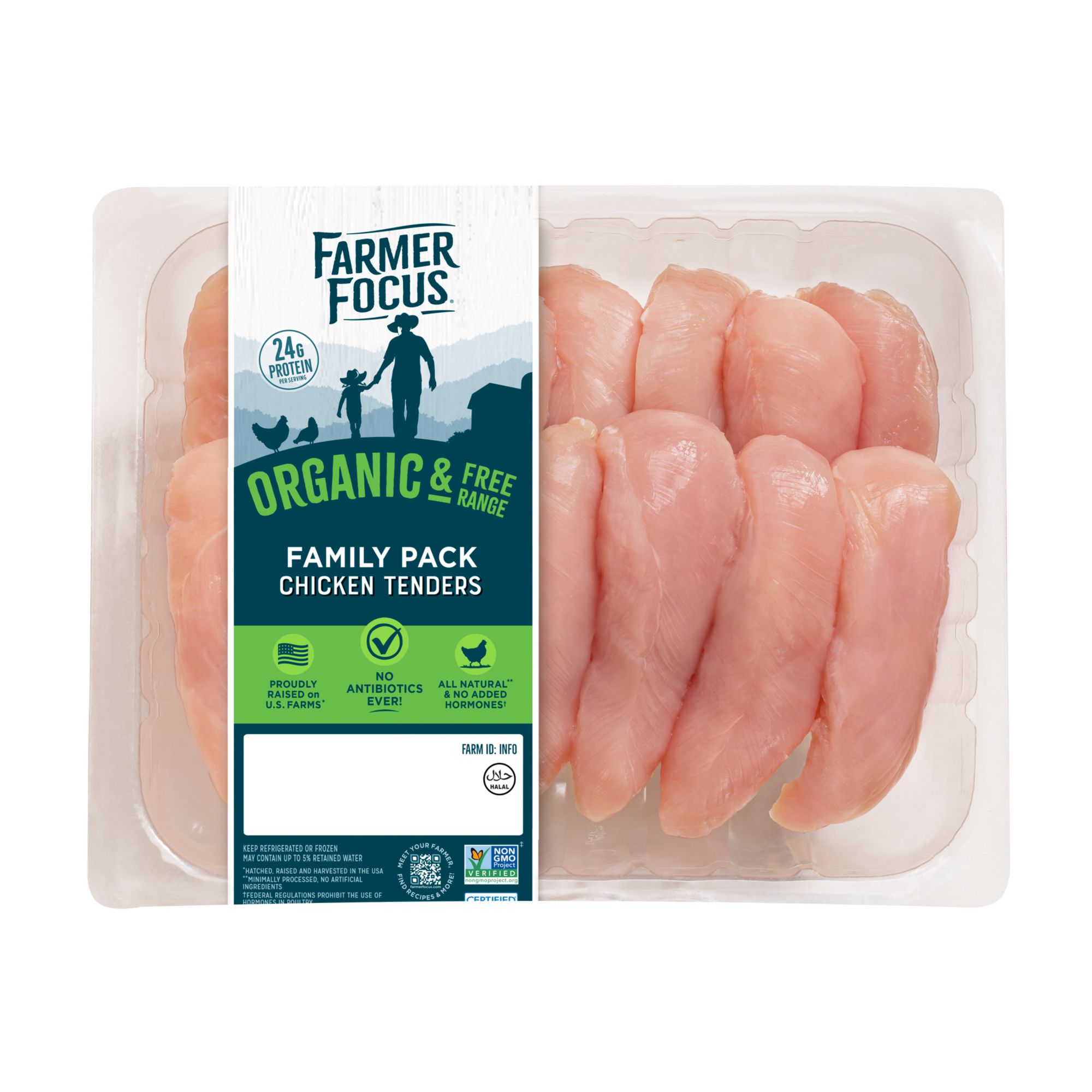 Convenient to cook and full of flavor, Farmer Focus chicken tenders are a family favorite and perfect for breading, dipping, or adding to pasta. Organic, sustainable, and humanely raised without antibiotics or GMOs, Farmer Focus chicken is free range and fed organic feed with access to fresh air and outdoor pasture—and each package contains a unique Farm ID that allows you to meet one of our +120 farming partners, see photos, videos, and stories from their farm; and leave them a personal note.