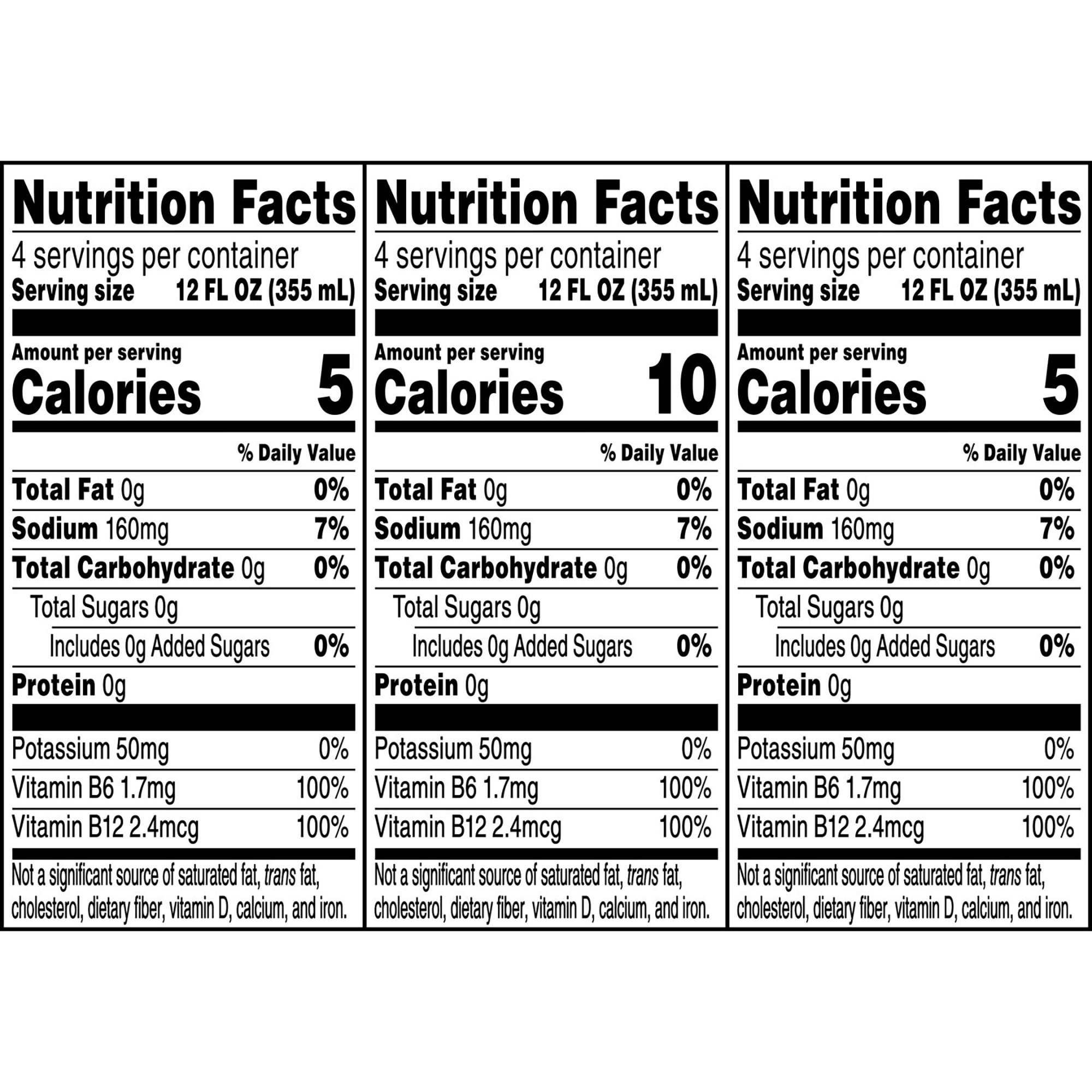 Ingredients: Cool Blue Flavor: Water, Citric Acid, Natural Flavor, Sodium Citrate, Black Carrot Juice Concentrate (Color), Caffeine, Salt, Monopotassium Phosphate, Sucralose, Xanthan Gum, Blueberry Juice Concentrate (Color), Pyridoxine Hydrochloride (Vitamin B6), Cyanocobalamin (Vitamin B12). Strawberry Watermelon Flavor: Water, Citric Acid, Natural Flavor, Sodium Citrate, Reg Sweet Potato Juice Concentrate (Color), Sodium Citrate, Caffeine Salt, Monopotassium Phosphate, Sucralose, Carrot Juice Concentrate (Color), Xanthan Gum, Pyridoxine Hydrochloride (Vitamin B6), Cyanocobalamin (Vitamin B12). Tropical Mango Flavor: Water, Citric Acid, Natural Flavor, Sodium Citrate, Caffeine, Salt, Monopotassium Phosphate, Sucralose, Carrot Juice Concentrate (Color), Ascorbic Acid (To Protect Color), Xanthan Gum, Apple Juice Concentrate (Color), Pyridoxine Hydrochloride (Vitamin B6), Cynacobalamin (Vitamin B12).