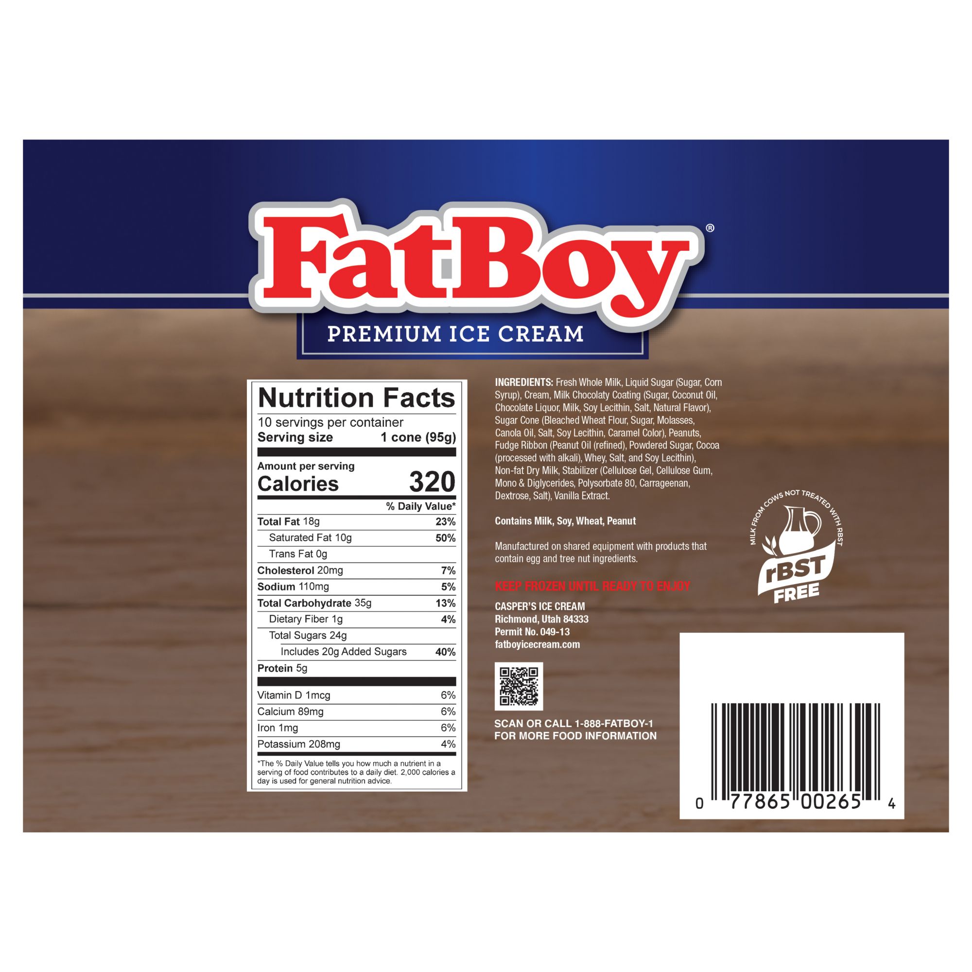Smooth, premium FatBoy Vanilla Ice Cream with a fudge ribbon loaded into a chocolatey lined sugar cone, topped with milk chocolatey coating, and generously sprinkled with peanuts. Enjoy the smoothly blended textures of the cone as you indulge in this treat crafted with traditional ice cream-making methods they've perfected over 95 years. Since Casper Merrill took the milk and cream from the family milk cows and made his first confection back in 1925, the FatBoy brand has been known for amazingly creamy flavor and frozen treats with the taste and texture ice cream lovers across the nation can't get enough of. Throw in locally sourced dairy that's fresh and rBST free, and well... you'll quickly realize why America Loves FatBoy.