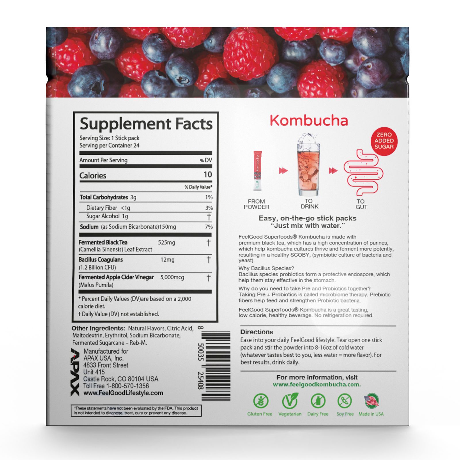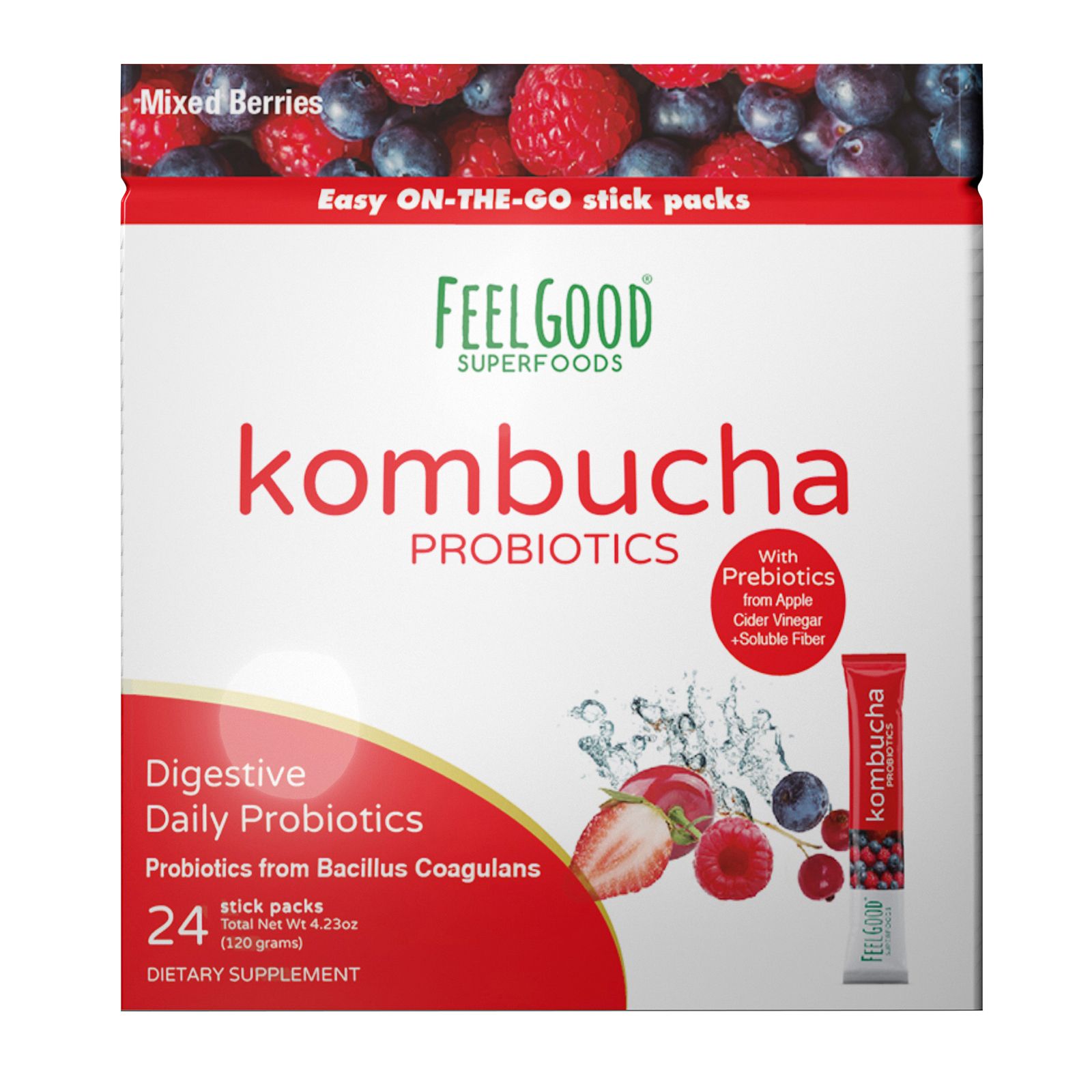 1.2 billion CFUs probiotics Prebiotics Kombucha stick-pack Great flavor Includes 24 stick packs of kombucha probiotic iced tea