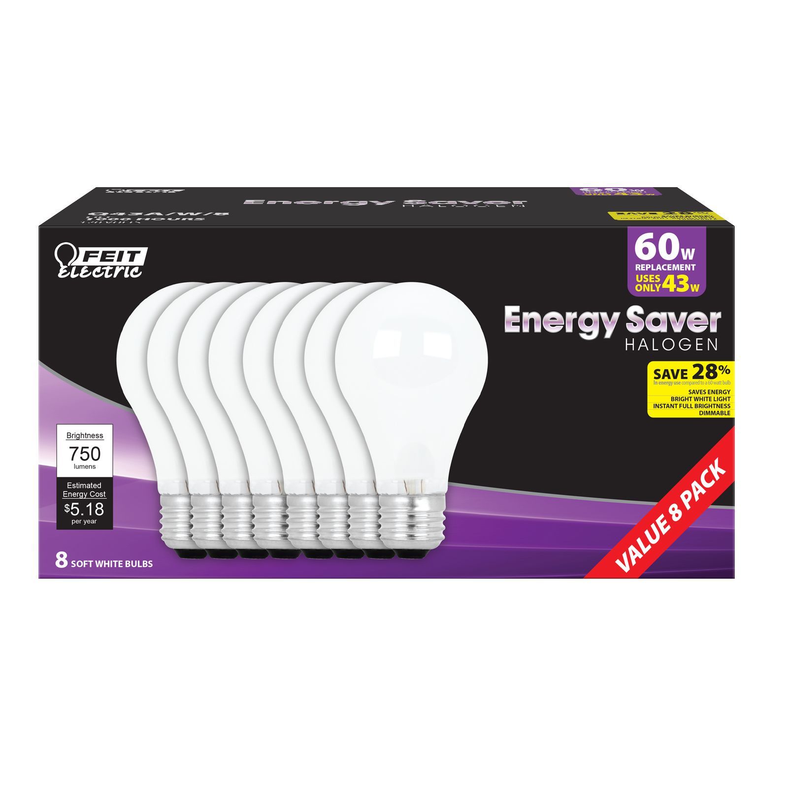 Feit Electric Halogen 8-pack is exclusive to BJs Soft white 60W replacement Uses only 43W 750 lumens of light output Includes: 8 bulbs