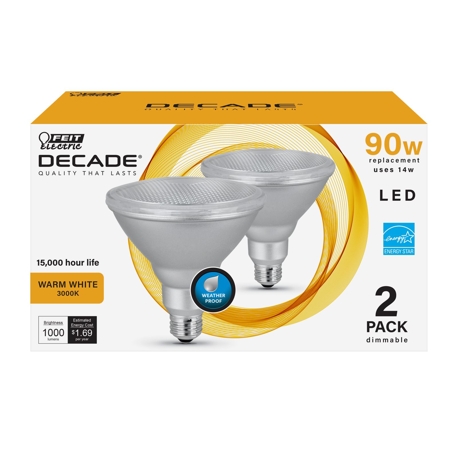 Feit Electric Decade brand is exclusive to BJs. 1000 lumens using 14 watts of electricity 15,000 hour life 3000K warm white light Dimmable 90w incandescent replacement Instant full brightness with no warm up time Two pack Recommended use in track and recessed applications Warranty: 3 years Includes: 2 bulbs