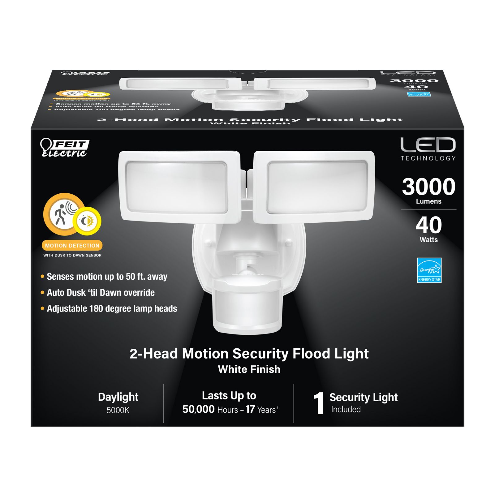 This Feit Electric Dual Head LED Motion Security Flood Light produces 3,000 lumens using two separate 1,500 lumens heads. It's rated for 50,000 hour life, produces 5,000K light, has three control functions plus a timer. It also has a weather and rust resistant cast aluminum housing and is Energy Star rated.