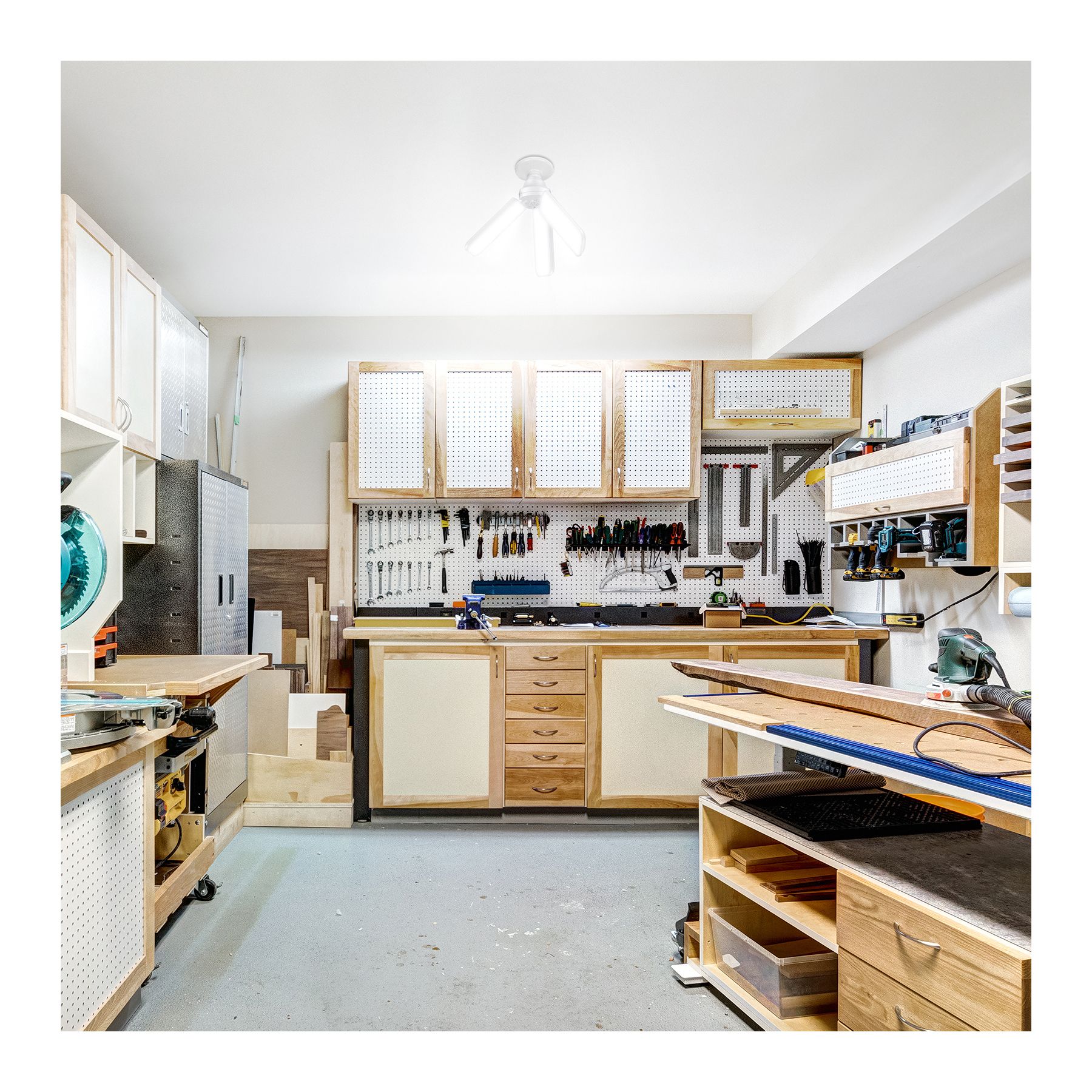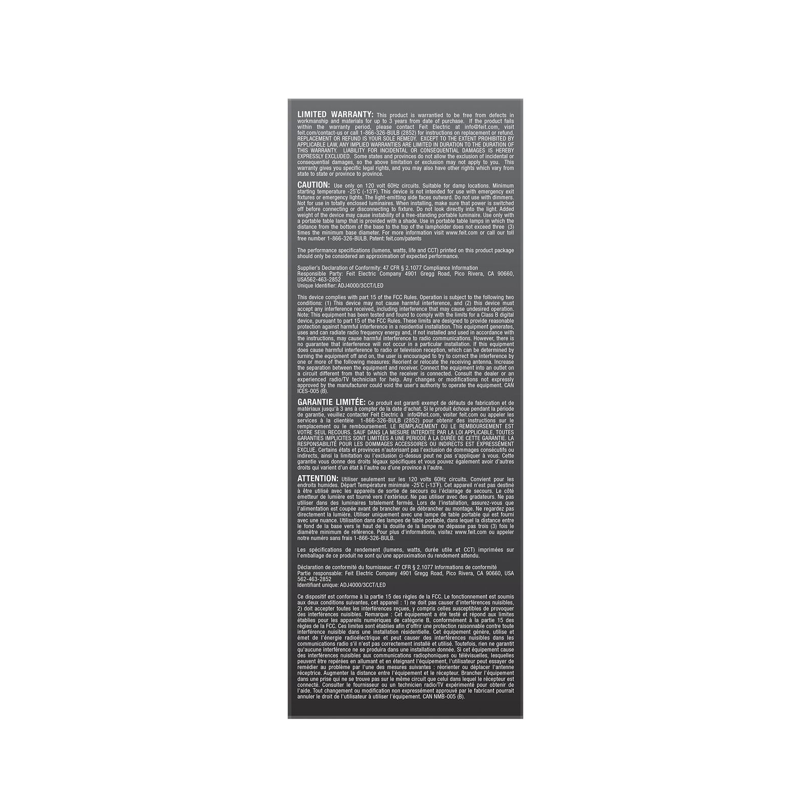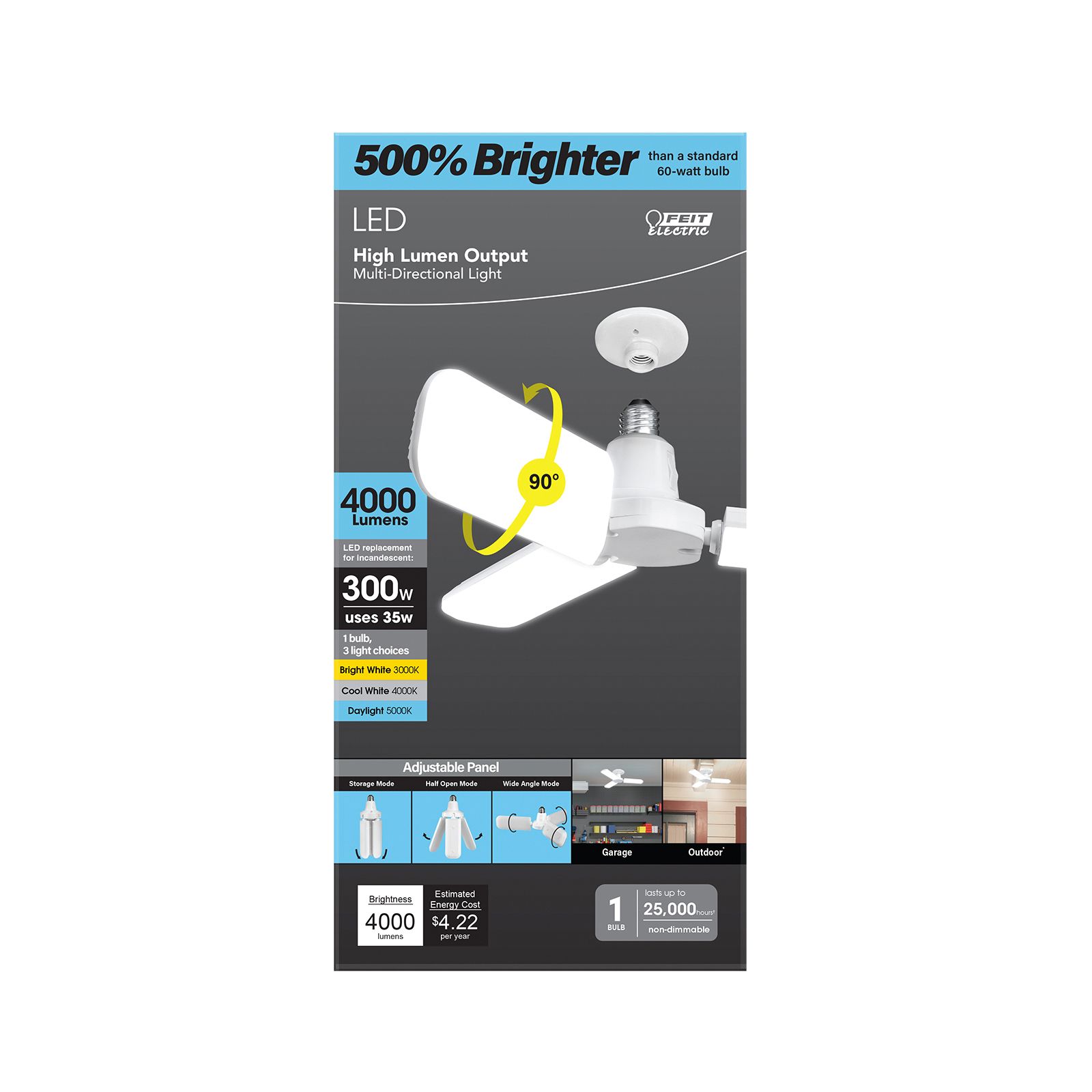 For garages, attics, patios, or other dark spaces, the Feit Electric ADJ4000/3CCT/LED Multi-Directional light provides an efficient and flexible way to get bright illumination in a small form. This light screws into standard E26 sockets and comes with independently adjustable rotating panels that unfold 90° and rotate 180° to direct light exactly where desired. Integrated non-dimmable LEDs produce 4000 lumens of 3000K/4000K/5000K Bright White, Cool White, or Daylight White light using only 35 watts – an energy savings of over 88% compared to equivalent 300-watt incandescent bulbs. Each light lasts up to 25,000 hours/22.8 years of bright, reliable illumination. The estimated annual energy cost is only $4.22, based on 3 hours of daily use.