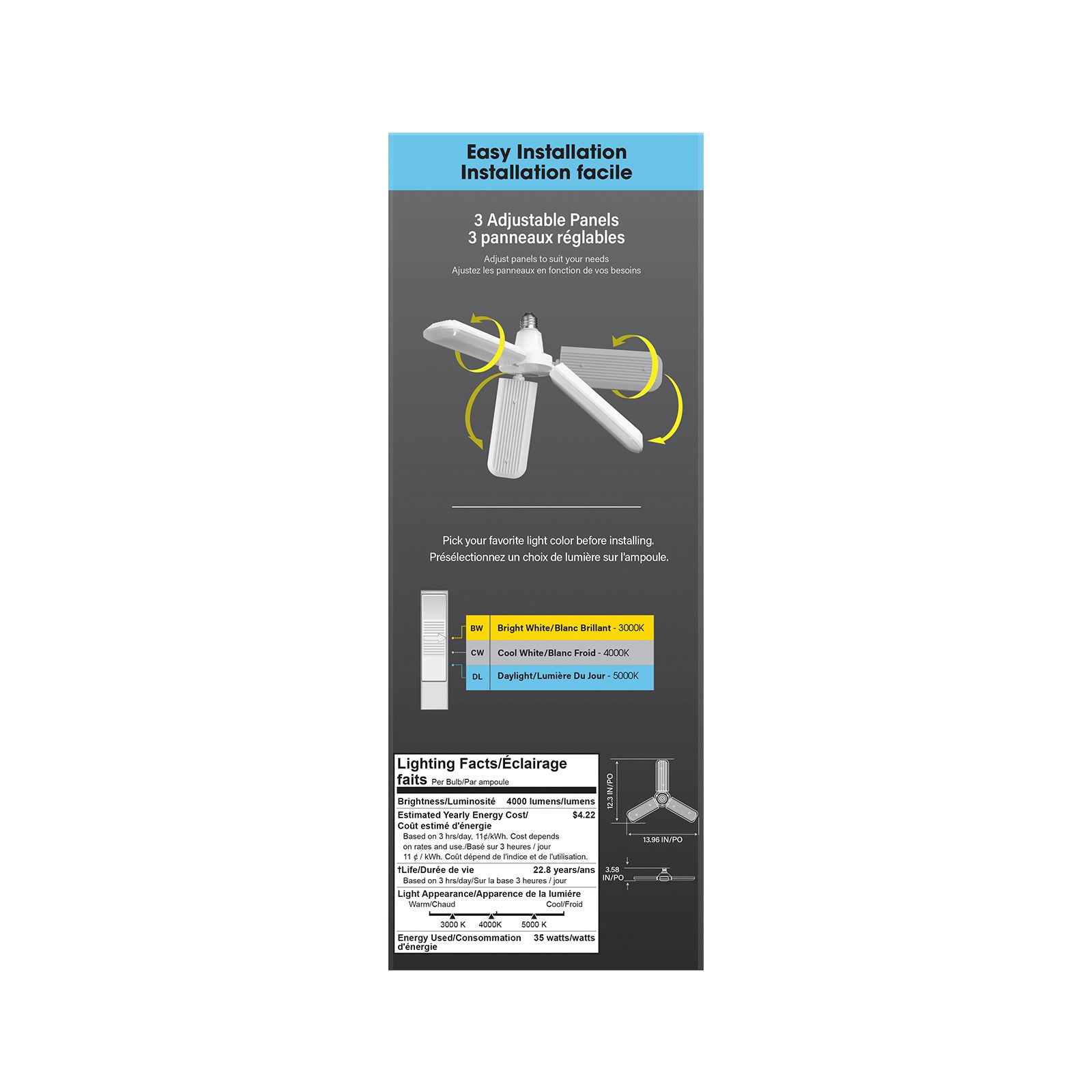 4000 lumens 25,000 hour life Selectable 3000K/4000K/5000K Bright White, Cool White, or Daylight White light Non-dimmable 35-watt, 300-watt equivalent Medium E26 base Includes 35W (300W Equivalent) Selectable White E26 Replacement LED Multi-Directional Light