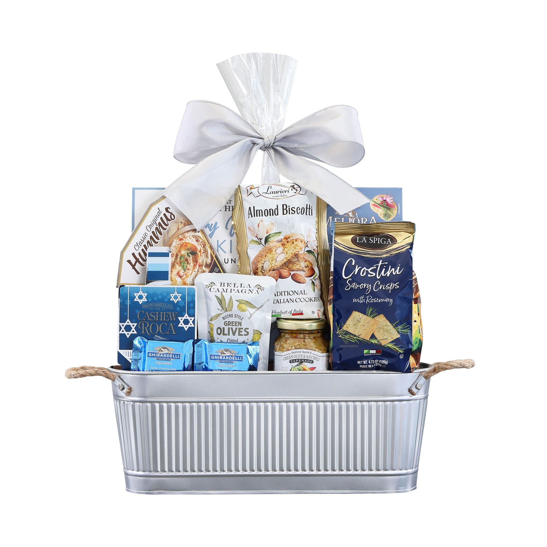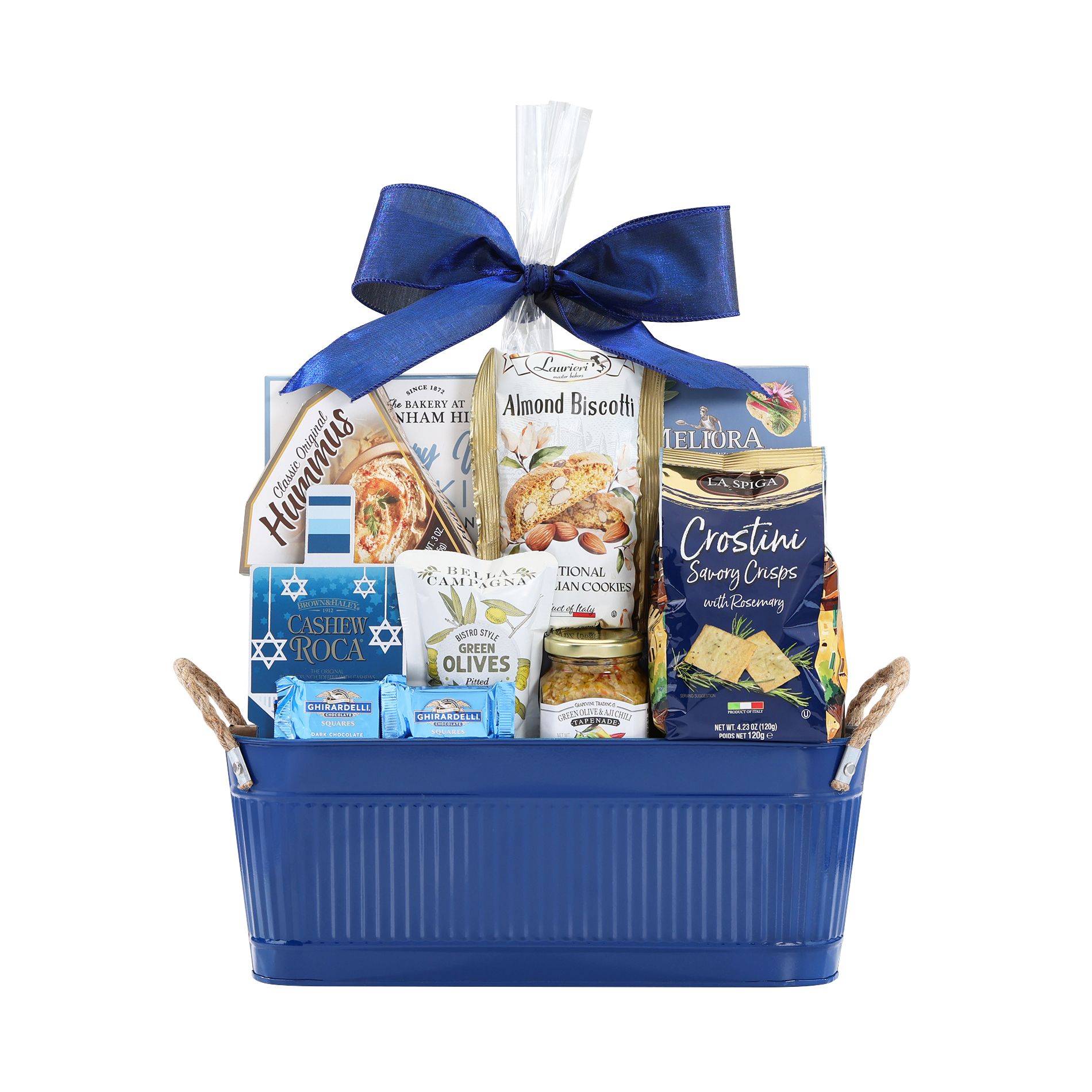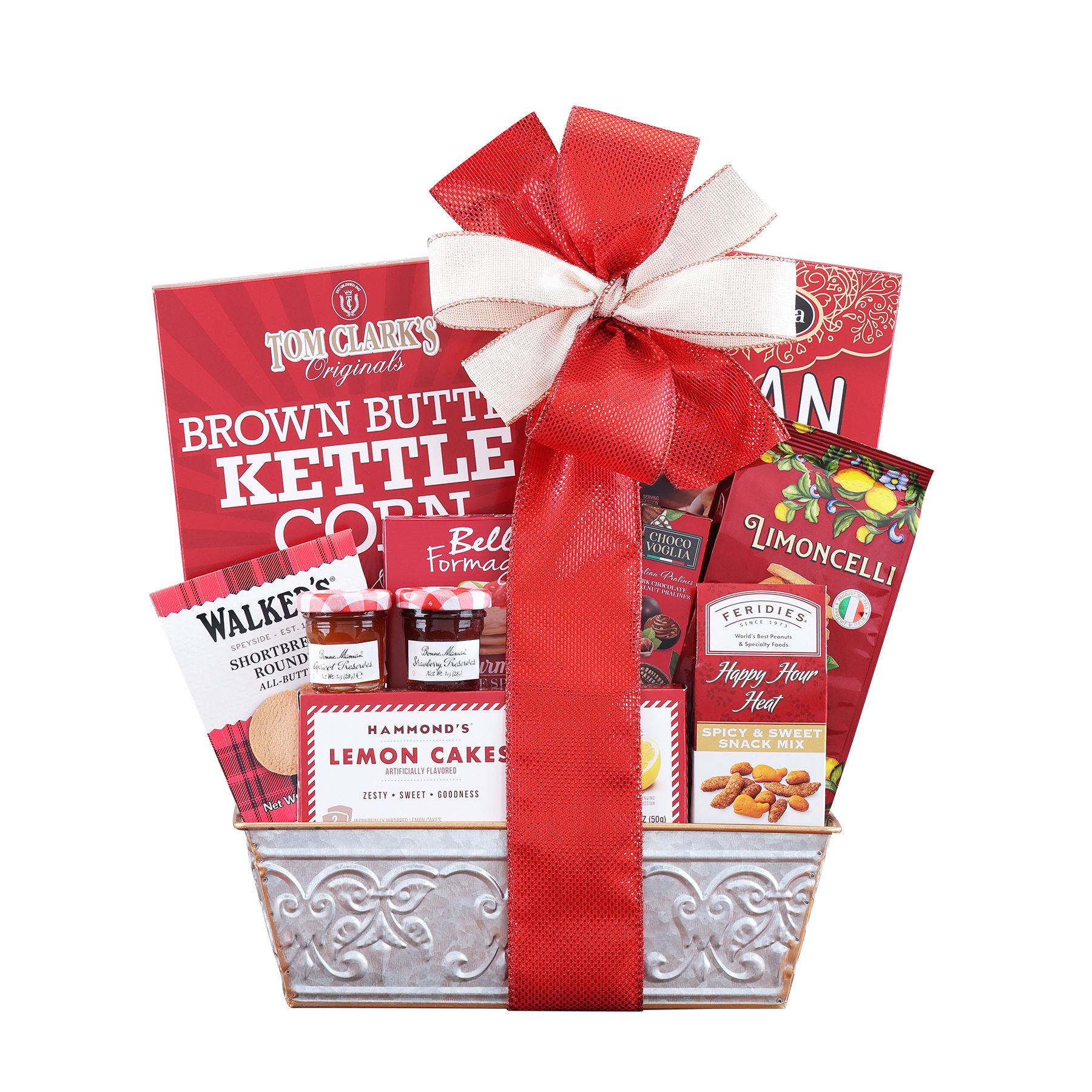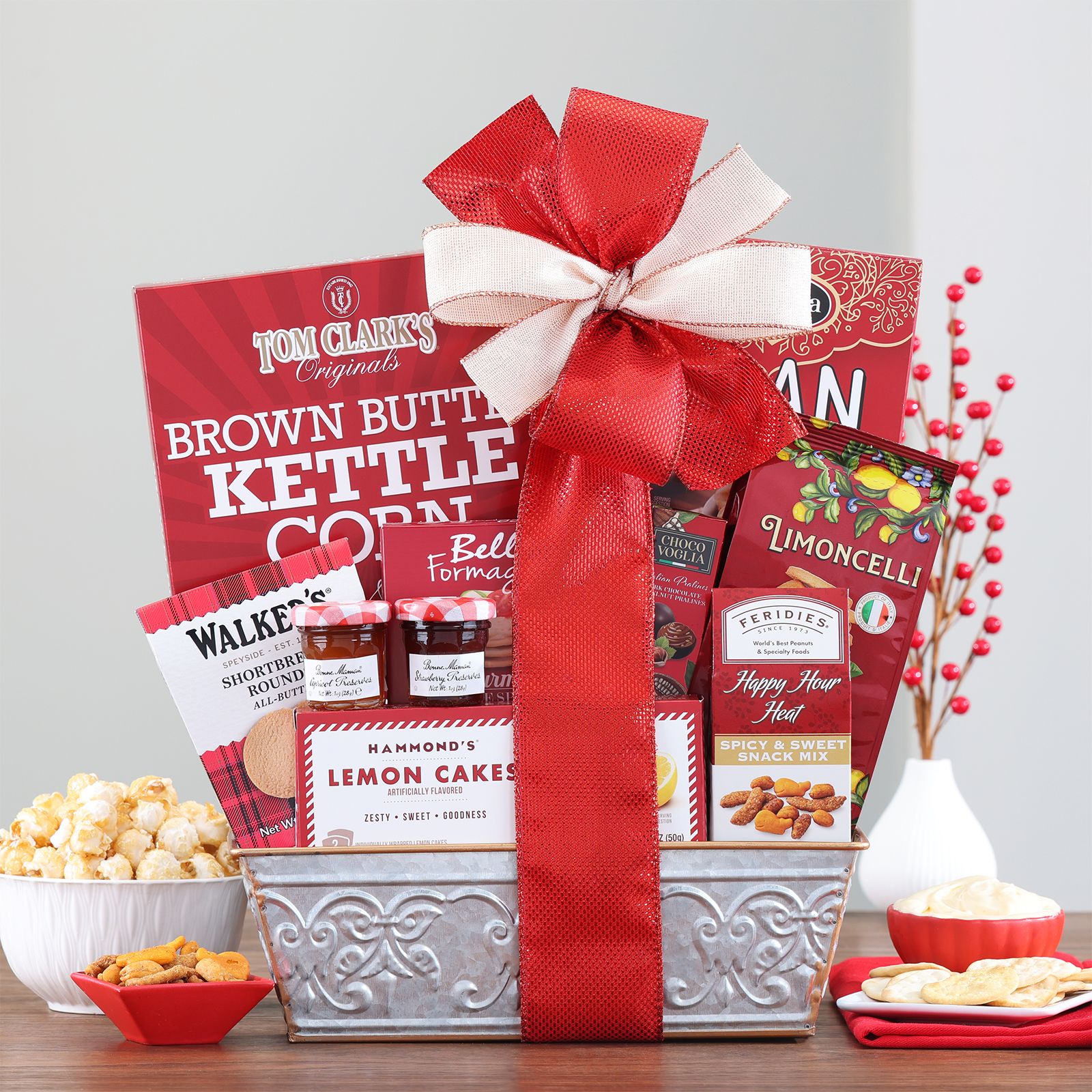 This beautifully embossed metal tin is functional and festive, perfect for year for storage and décor. Savory naan crisps and cheese and happy hour mix are accompanied by an assortment of sweet cookies, cakes, Bon Maman jam, cookies and kettle corn.