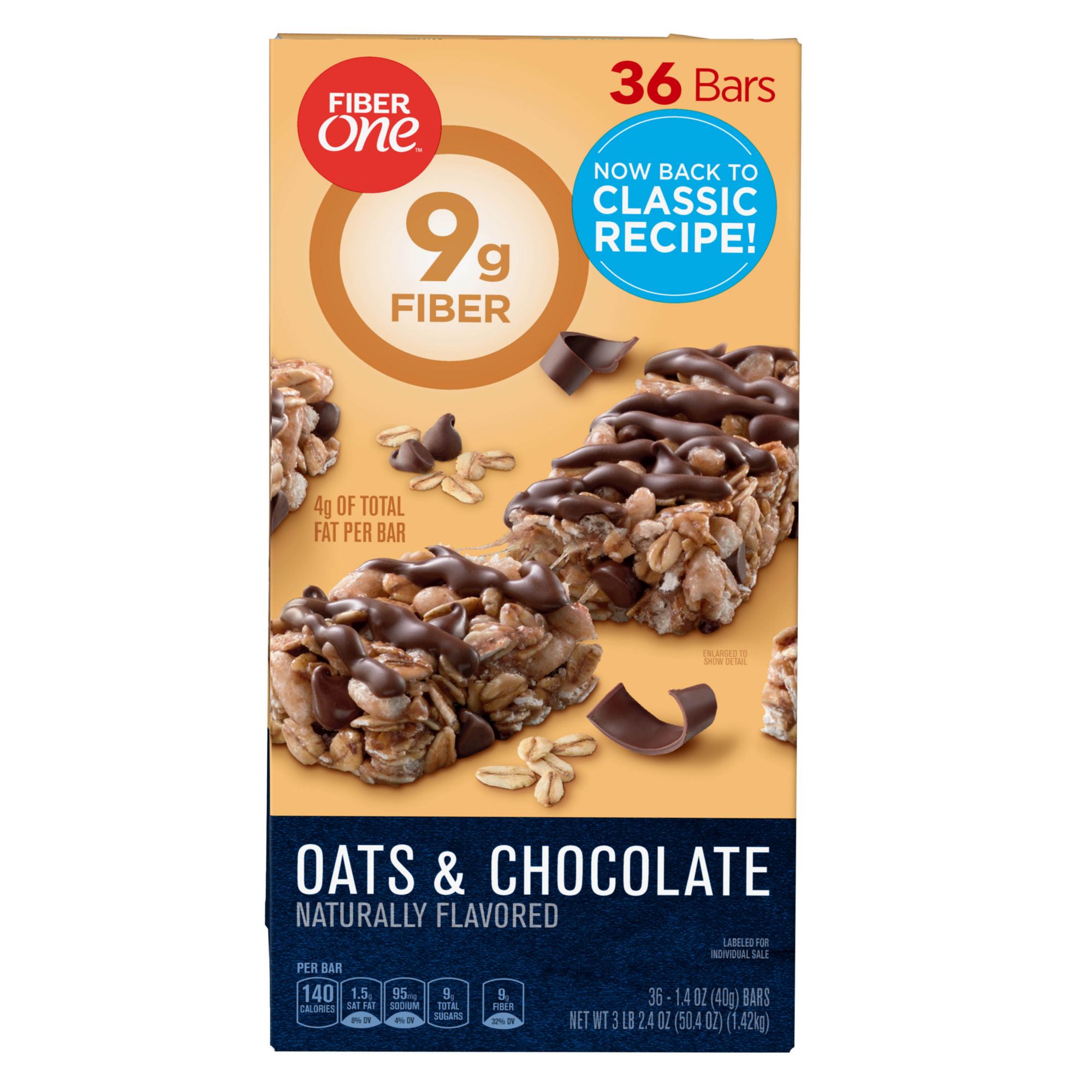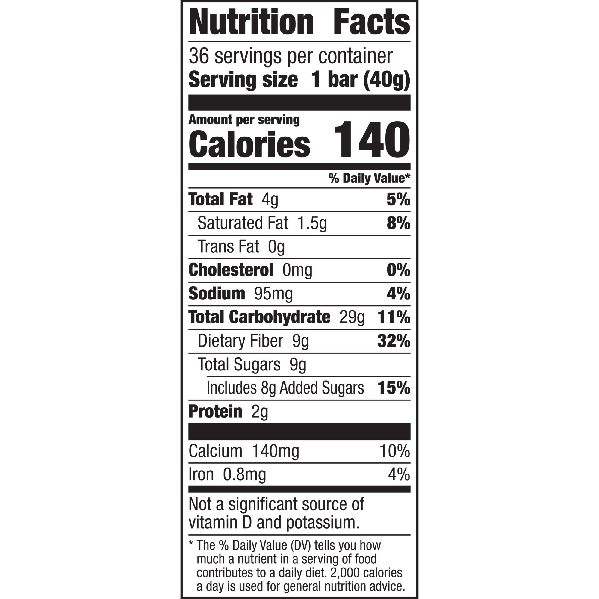 4g of total fat per bar 9g of Fiber in every bar Naturally flavored Including 36 individually wrapped bars