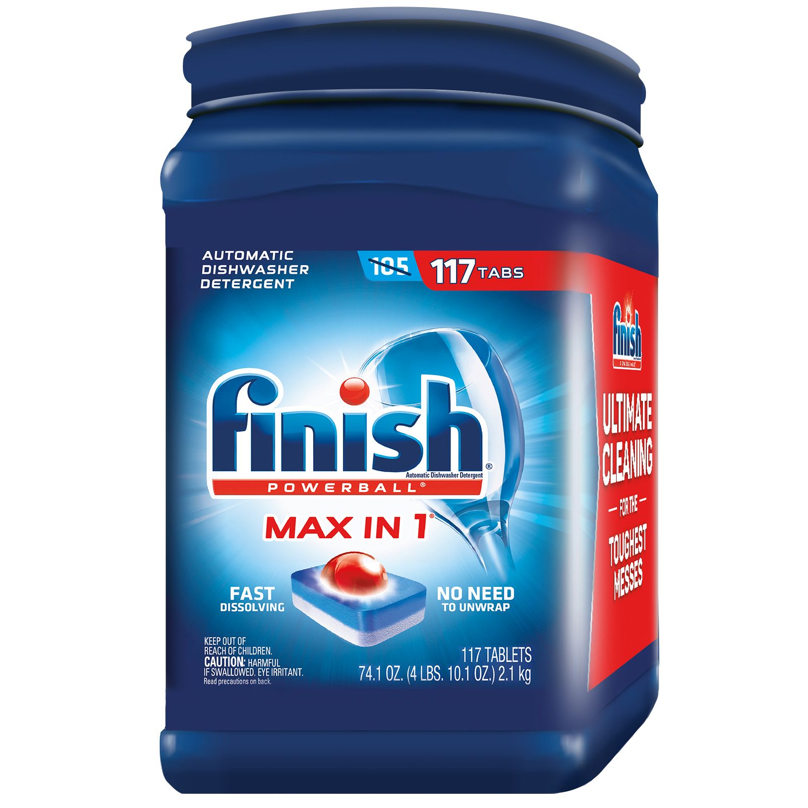 Use Finish Max-in-One Dishwasher Detergent Powerball Tabs to clean even the toughest stains, the easy way. Finish dishwasher tablets are distinctly formulated to remove tough stains and make dishes, pans, glasses and silverware sparkle like new, all from the world's number-one recommended brand. This simple to open package holds 117 detergent tabs, with just one needed per dishwasher cycle. There's no need to unwrap each tab; they simply dissolve while the dishwasher is running, going to work to clean dishes with its 11x power actions. When you use Finish dishwasher detergent tabs, there's no need to pre-wash dishes with soap and water in the sink, as even the messiest and most baked-on stains are no match for its formula. These layered tablets include effective cleansers as well as its unique Powerball, which boosts its cleaning abilities to remove stains, eliminate grease, bleach away pigments left by tea and coffee and prevent redeposits on glass to keep it crystal clear. And because each Finish dishwasher tablet is pre-measured, you never have to guess at how much detergent to add or deal with messy liquids.